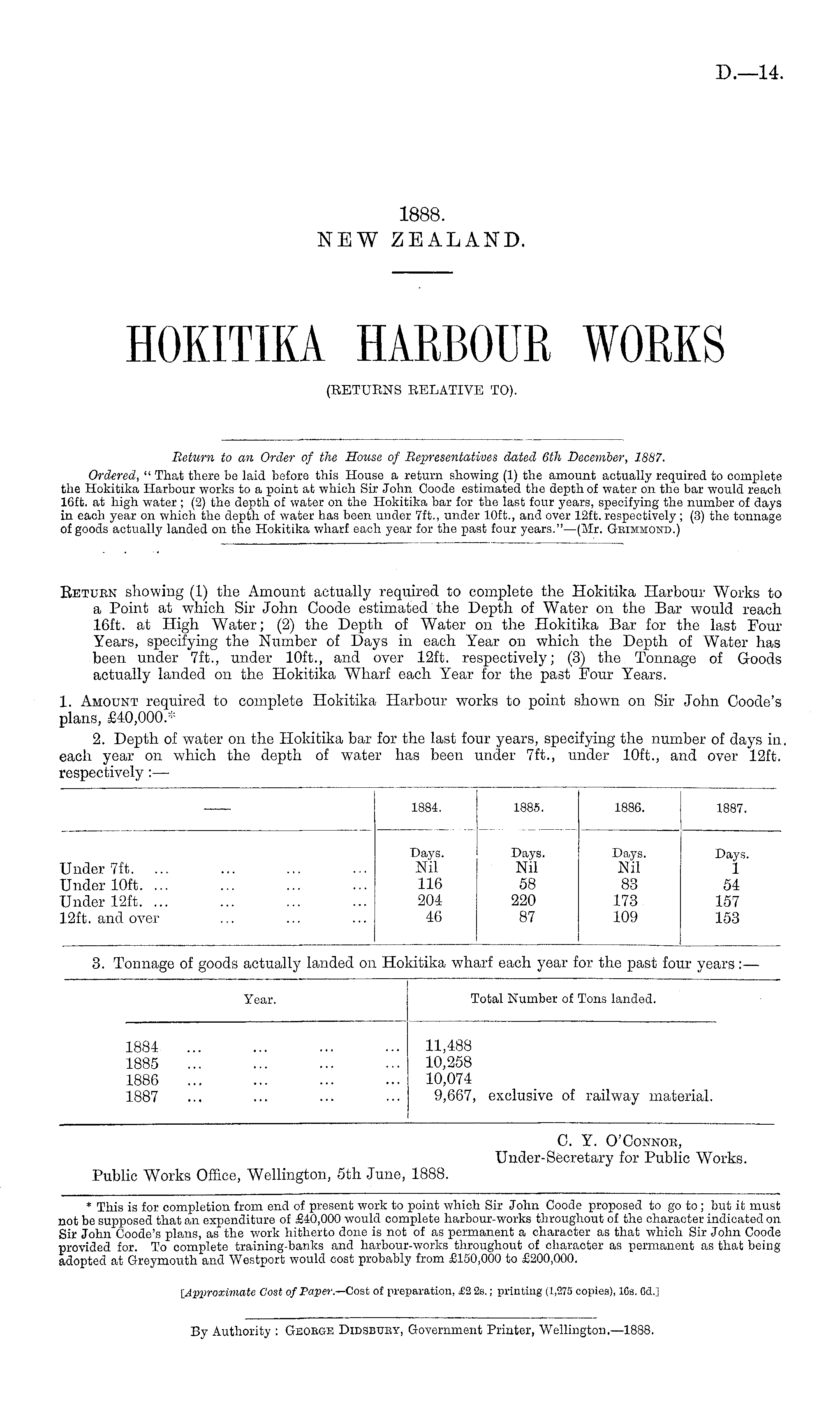 Return to an Order of the House of Representatives dated 6th December, 1887. Ordered, " That there be laid before this House a return showing (1) the amount actually required to complete the Hokitika Harbour works to a point at which Sir John Coode estimated the depth of water on the bar would reach 16ft. at high water ; (2) the depth of water on the Hokitika bar for tho last four years, specifying the number of days in each year on which the depth of water has been under 7ft., under 10ft., and over 12ft. respectively ; (3) the tonnage of goods actually landed on the Hokitika wharf each year for the past four years."—(Mr. Gbimmond.)