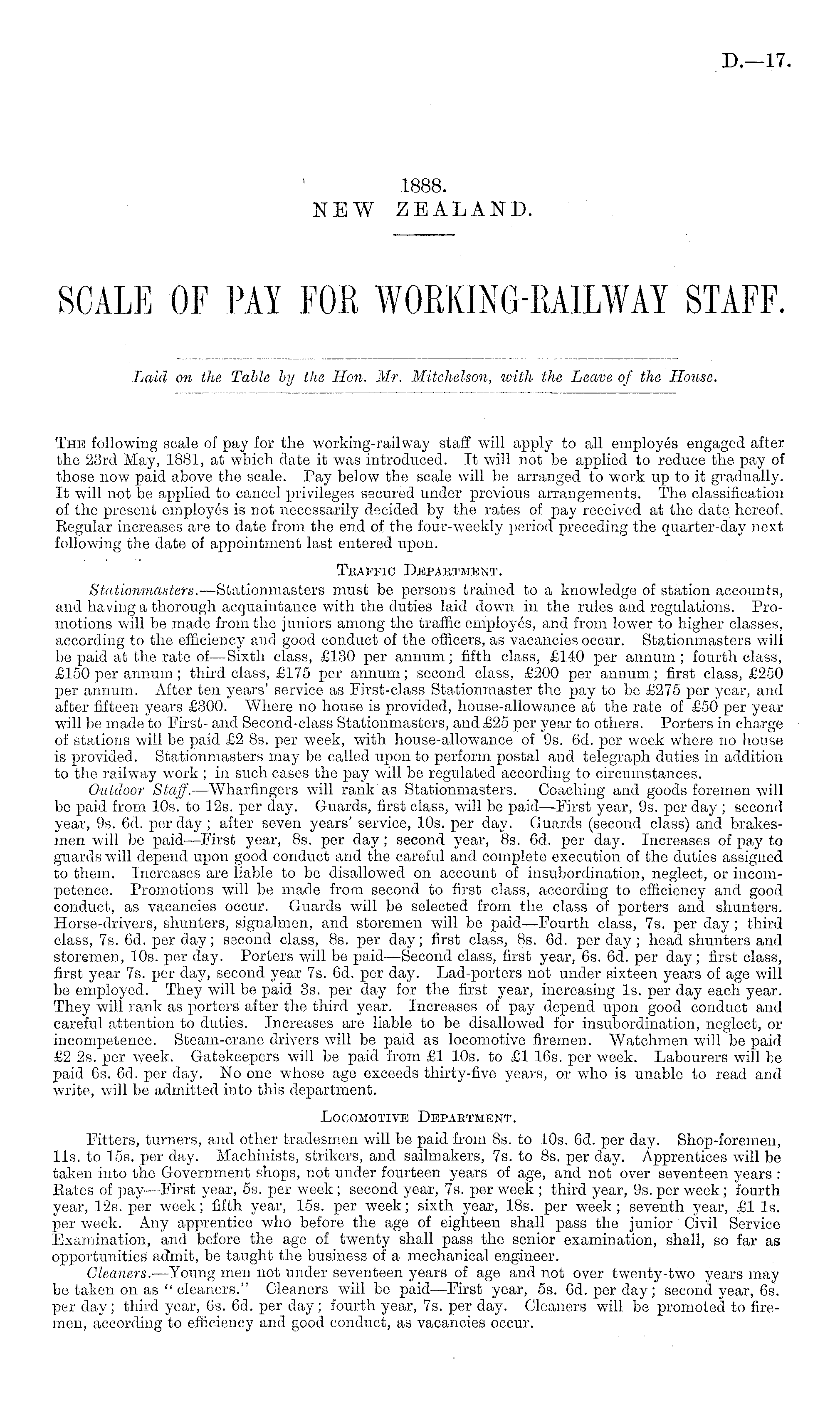 The following scale of pay for the working-railway staff will apply to all employes engaged after the 23rd May, 1881, at which date it was introduced. It will not be applied to reduce the pay of those now paid above the scale. Pay below the scale w Till be arranged to work up to it gradually. It will not be applied to cancel privileges secured under previous arrangements. The classification of the present employes is not necessarily decided by the rates of pay received at the date hereof. Regular increases are to date from the end of the four-weekly period preceding the quarter-day next following the date of appointment last entered upon. Tbafpic Department. Stationmasters. —Stationmasters must be persons trained to a knowledge of station accounts, and having a thorough acquaintance with the duties laid down in the rules and regulations. Promotions will be made from the juniors among the traffic employes, and from lower to higher classes, according to the efficiency and good conduct of the officers, as vacancies occur. Stationmasters will be paid at the rate of —Sixth class, £130 per annum; fifth class, £140 per annum ; fourth class, £150 per annum ; third class, £175 per annum; second class, £200 per annum; first class, £250 per annum. After ten years' service as First-class Stationinaster the pay to be £275 per year, and after fifteen years £300. Where no house is provided, house-allowance at the rate of £50 per year will be made to First- and Second-class Stationmasters, and £25 per year to others. Porters in charge of stations will be paid £2 Bs. per week, with house-allowance of 9s. 6d. per week where no house is provided. Stationmasters may be called upon to perform postal and telegraph duties in addition to the railway work ; in such cases the pay will be regulated according to circumstances. Outdoor Staff. —Wharfingers will rank as Stationmasters. Coaching and goods foremen will be paid from 10s. to 12s. per day. Guards, first class, will be paid—First year, 9s. per day ; second year, 9s. 6d. per day ; after seven years' service, 10s. per day. Guards (second class) and brakesmen will be paid —First year, Bs. per day; second year, Bs. 6d. per day. Increases of pay to guards will depend upon good conduct and the careful and complete execution of the duties assigned to them. Increases are iiable to be disallowed on account of insubordination, neglect, or incompetence. Promotions will be made from second to first class, according to efficiency and good conduct, as vacancies occur. Guards will be selected from the class of porters and shunters. Horse-drivers, shunters, signalmen, and storemen will be paid—Fourth class, 7s. per day ; third class, 7s. 6d. per day; second class, Bs. per day; first class, Bs. 6d. per day; head shunters and storemen, 10s. per day. Porters will be paid—Second class, first year, 6s. 6d. per day; first class, first year 7s. per day, second year 7s. 6d. per day. Lad-porters not under sixteen years of age will be employed. They will be paid 3s. per day for the first year, increasing Is. per day each year. They will rank as porters after the third year. Increases of pay depend upon good conduct and careful attention to duties. Increases are liable to be disallowed for insubordination, neglect, or incompetence. Steam-crane drivers will be paid as locomotive firemen. Watchmen will be paid £2 2s. per week. Gatekeepers will be paid from £1 10s. to £1 16s. per week. Labourers will be paid 6s. 6d. per day. No one whose age exceeds thirty-five years, or who is unable to read and write, will be admitted into this department. Locomotive Department. Fitters, turners, and other tradesmen will be paid from Bs. to 10s. 6d. per day. Shop-foremen, 11s. to 15s. per day. Machinists, strikers, and sailmakers, 7s. to Bs. per day. Apprentices will be taken into the Government shops, not under fourteen years of age, and not over seventeen years : Bates of pay —First year, ss. per week; second year, 7s. per week ; third year, 9s. per week; fourth year, 12s. per week; fifth year, 15s. per week; sixth year, 18s. per week; seventh year, £1 Is. per week. Any apprentice who before the age of eighteen shall pass the junior Civil Service Examination, and before the age of twenty shall pass the senior examination, shall, so far as opportunities admit, be taught the business of a mechanical engineer. Cleaners. —Young men not under seventeen years of age and not over twenty-two years may be taken on as " cleaners." Cleaners will be paid—First year, ss. 6d. per day; second year, 6s. per day ; third year, 6s. 6d. per day ; fourth year, 7s. per day. Cleaners will be promoted to firemen, according to efficiency and good conduct, as vacancies occur.