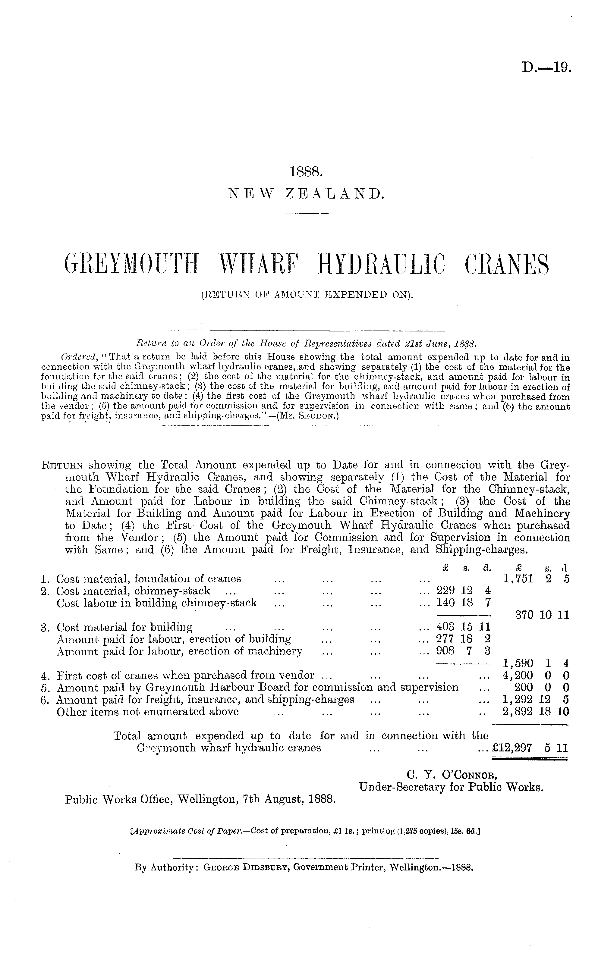 Return to an Order of the House of Representatives dated 21st June, 1888. Ordered, " That a return be laid before this House showing the total amount expended up to date for and in connection with the Greymouth wharf hydraulic cranes, and showing separately (1) the cost of the material for the foundation for the said cranes; (2) the cost of the material for the chimney-stack, and amount paid for labour in building the said chimney-stack; (3) the cost of the material for building, and amount paid for labour in erection of building and machinery to date ; (4) the first cost of the Groymouth wharf hydraulic cranes when purchased from the vendor; (5) the amount paid for commission and for supervision in connection with same ; and (6) the amount paid for freight, insurance, and shipping-charges."—(Mr. Seddon.)