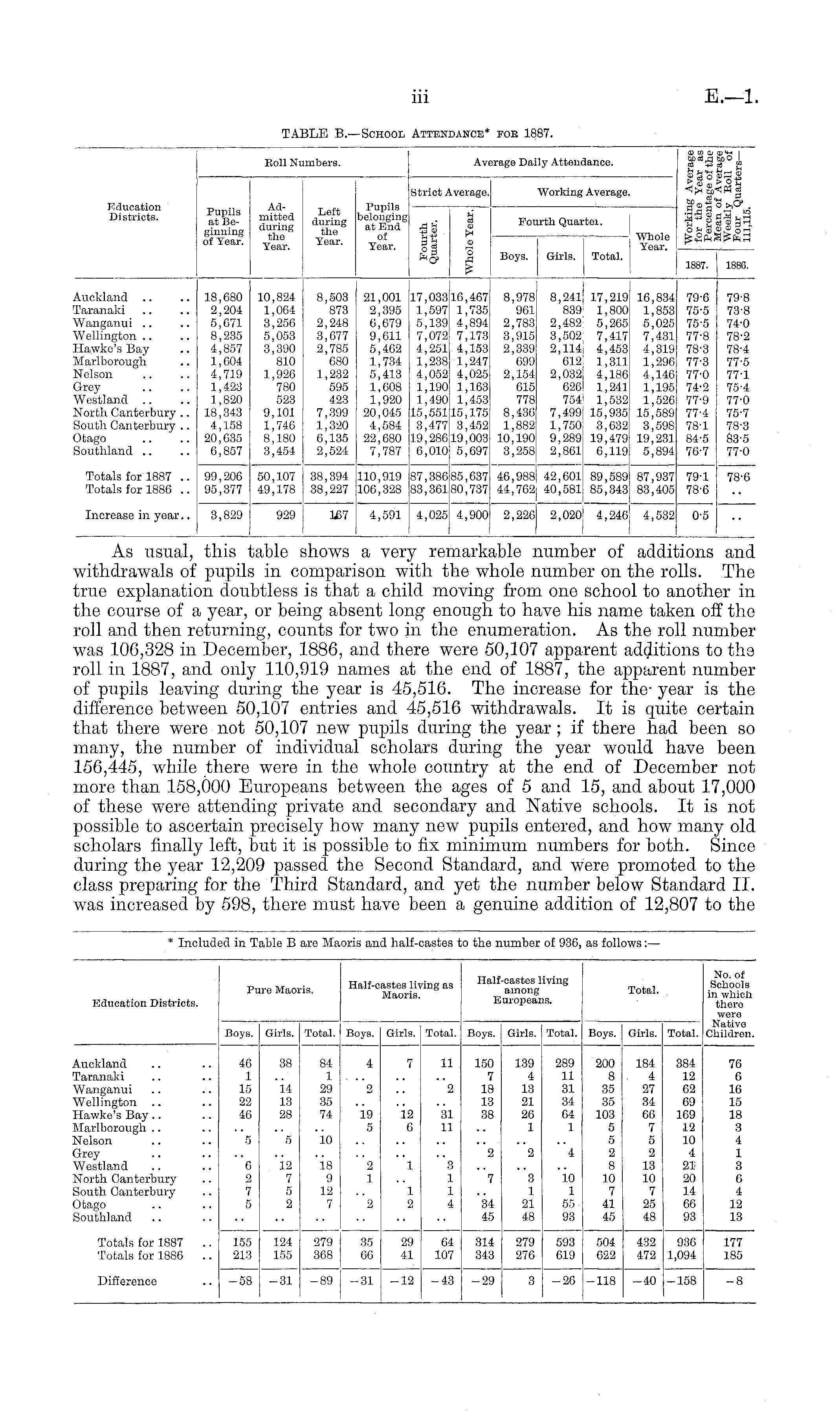 Eoll Ni imbers. Strict Average. Average Daily Attendance. Working Average. 4 bi UJ friil yini Education Districts. Pupils at Beginning of Year. Admitted during the Year. Loft during the Year. Pupils belonging at End of Year. © IS I! Fourth Quarter. Whole Boys. Girls. Total. 1887. 1880. Auckland laranaki Wanganui Wellington .. Hawko's Bay Marlborough Nelson 18,680 2,204 5,671 8,235 4,857 1,604 4,719 1,423 1,820 18,343 4,158 20,035 6,857 10,824 1,064 3,256 5,053 3,390 810 1,926 780 523 9,101 1,746 8,180 3,454 8,503 873 2,248 3,077 2,785 680 1,232 595 423 7,399 1,320 6,135 2,524 21,001 2,395 6,679 9,611 5,462 1,734 5,413 1,608 1,920 20,045 4,584 22,680 7,787 17,033' | 1,597 5,139 7,072 4,251 1,238 4,052 1,190 l,490| 15,551 3,477 19,286! 6,010: 16,407 1,735 4,894 7,173 4,153 1,247 4,025 1,103 1,453 15,175 3,452 19,003 | 5,697 8,978 961 2,783 3,915 2,339 699 2,154 615 778 8,436 1,882 10,190 3,258 8,241; 17,2191 839 1 1,800 2,482! 5,265 3,502 7,417 2,114] 4,453 612: 1,311 2,032 4,186 626 1,241 754! 1,532 7,499- 15,935! 1,750: 3,632! 9,289 19,479j 2,861 6,119 16,834 1,853 5,025 7,431 4,319 1,296 4,146 1,195 1,526 15,589 3,598 19,231 5,894 79'G 75-5 75-5 77-8 78'3 77-3 77'0 74-2 77-9 77-4 78-1 84-5 76-7 79-8 73-8 74-0 78-2 78-4 77'5 77-1 75'4 77-0 75-7 78-3 83-5 77-0 Grey WestlancT North Canterbury .. South Canterbury .. Ofcago Southland Totals for 1887 .. Totals for 1886 .. 99,206 95,377 50,107 49,178 38,394 38,227 110,919 106,328 87,386 83,361 85,637 80,737 40,988 44,762' 42,601 89,589 40,581 85,343 87,937 83,405 79-1 78-6 78-6 Increase in year.. 3,829 929 1(67 4,591 4,025 4,900 2,226 2,020' 4,246 4,532 0-5