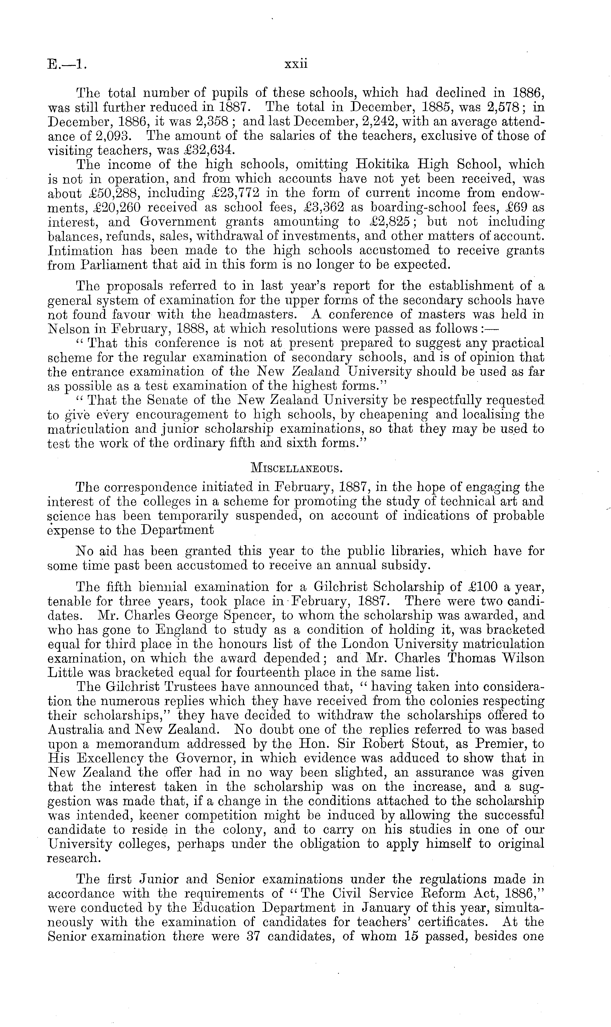 The total number of pupils of these schools, which had declined in 1886, was still further reduced in 1887. The total in December, 1885, was 2,578; in December, 1886, it was 2,358 ; and last December, 2,242, with an average attendance of 2,093. The amount of the salaries of the teachers, exclusive of those of visiting teachers, was £32,634. The income of the high schools, omitting Hokitika High School, which is not in operation, and from which accounts have not yet been received, was about ,£50,288, including .£23,772 in the form of current income from endowments, £20,260 received as school fees, £3,362 as boarding-school fees, £69 as interest, and Government grants amounting to £2,825; but not including balances, refunds, sales, withdrawal of investments, and other matters of account. Intimation has been made to the high schools accustomed to receive grants from Parliament that aid in this form is no longer to be expected. The proposals referred to in last year's report for the establishment of a general system of examination for the upper forms of the secondary schools have not found favour with the headmasters. A conference of masters was held in Nelson in February, 1888, at which resolutions were passed as follows :— " That this conference is not at present prepared to suggest any practical scheme for the regular examination of secondary schools, and is of opinion that the entrance examination of the New Zealand University should be used as far as possible as a test examination of the highest forms." '■' That the Senate of the New Zealand University be respectfully requested to give every encouragement to high schools, bj^ cheapening and localising the matriculation and junior scholarship examinations, so that they may be used to test the work of the ordinary fifth and sixth forms." Miscellaneous. The correspondence initiated in February, 1887, in the hope of engaging the interest of the colleges in a scheme for promoting the study of technical art and science has been temporarily suspended, on account of indications of probable expense to the Department No aid has been granted this year to the public libraries, which have for some time past been accustomed to receive an annual subsidy. The fifth biennial examination for a Gilchrist Scholarship of £100 a year, tenable for three years, took place in February, 1887. There were two candidates. Mr. Charles George Spencer, to whom the scholarship was awarded, and who has gone to England to study as a condition of holding it, was bracketed equal for third place in the honours list of the London University matriculation examination, on which the award depended; and Mr. Charles Thomas Wilson Little was bracketed equal for fourteenth place in the same list. The Gilchrist Trustees have announced that, " having taken into consideration the numerous replies which they have received from the colonies respecting their scholarships," they have decided to withdraw the scholarships offered to Australia and New Zealand. No doubt one of the replies referred to was based upon a memorandum addressed by the Hon. Sir Eobert Stout, as Premier, to His Excellency the Governor, in which evidence was adduced to show that in New Zealand the offer had in no way been slighted, an assurance was given that the interest taken in the scholarship was on the increase, and a suggestion was made that, if a change in the conditions attached to the scholarship was intended, keener competition might be induced by allowing the successful candidate to reside in the colony, and to carry on his studies in one of our University colleges, perhaps under the obligation to apply himself to original research. The first Junior and Senior examinations under the regulations made in accordance with the requirements of "The Civil Service Eeform Act, 1886," were conducted by the Education Department in January of this year, simultaneously with the examination of candidates for teachers' certificates. At the Senior examination there were 37 candidates, of whom 15 passed, besides one
