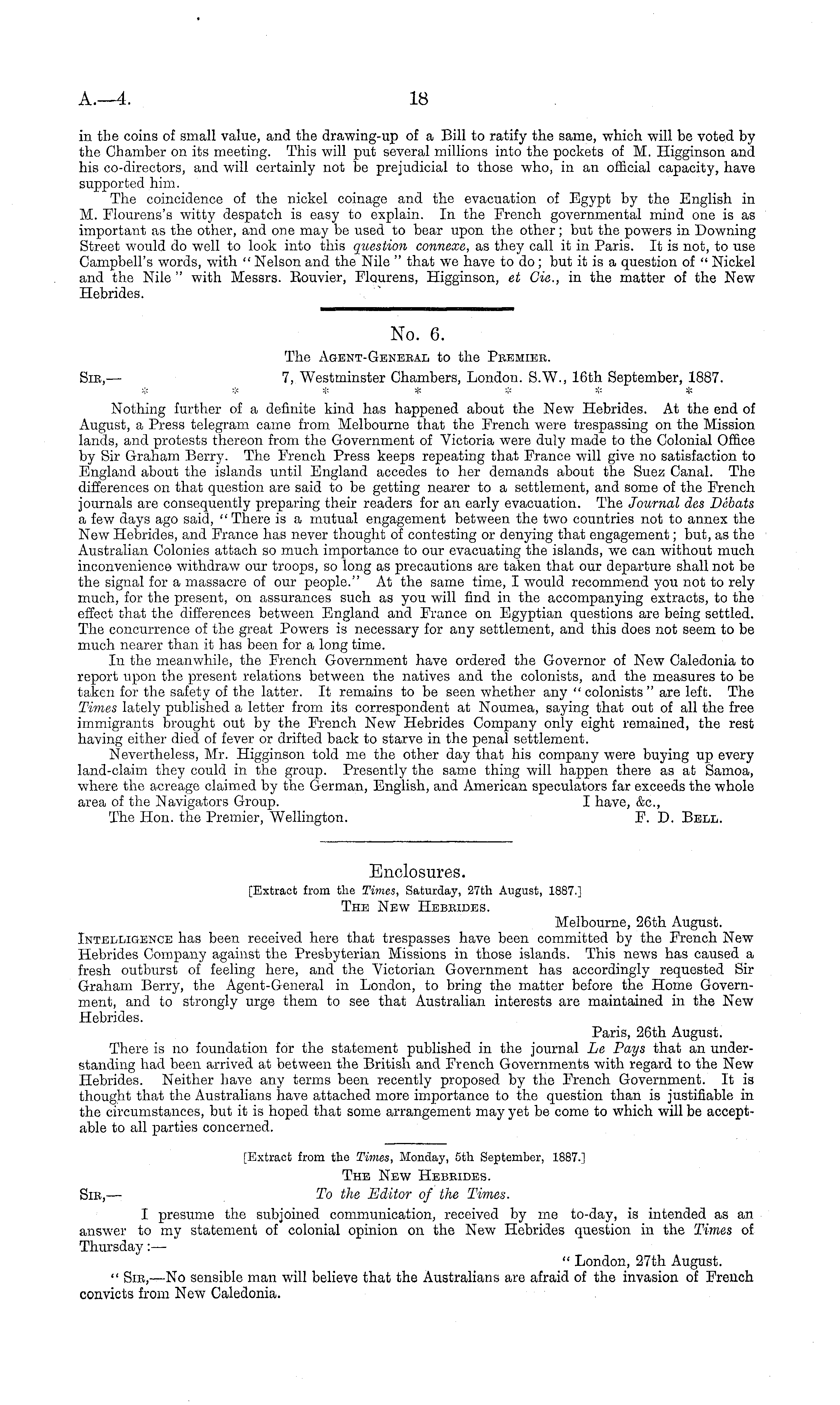 No. 6. The Agent-Genebal to the Peemiee. Sie, — 7, Westminster Chambers, London. S.W., 16th September, 1887. Nothing further of a definite kind has happened about the New Hebrides. At the end of August, a Press telegram came from Melbourne that the French were trespassing on the Mission lands, and protests thereon from the Government of Victoria were duly made to the Colonial Office by Sir Graham Berry. The French Press keeps repeating that France will give no satisfaction to England about the islands until England accedes to her demands about the Suez Canal. The differences on that question are said to be getting nearer to a settlement, and some of the French journals are consequently preparing their readers for an early evacuation. The Journal des Debats a few days ago said, "There is a mutual engagement between the two countries not to annex the New Hebrides, and France has never thought of contesting or denying that engagement; but, as the Australian Colonies attach so much importance to our evacuating the islands, we can without much inconvenience withdraw our troops, so long as precautions are taken that our departure shall not be the signal for a massacre of our people." At the same time, I would recommend you not to rely much, for the present, on assurances such as you will find in the accompanying extracts, to the effect that the differences between England and France on Egyptian questions are being settled. The concurrence of the great Powers is necessary for any settlement, and this does not seem to be much nearer than it has been for a long time. In the meanwhile, the French Government have ordered the Governor of New Caledonia to report upon the present relations between the natives and the colonists, and the measures to be taken for the safety of the latter. It remains to be seen whether any " colonists " are left. The Times lately published a letter from its correspondent at Noumea, saying that out of all the free immigrants brought out by the French New Hebrides Company only eight remained, the rest having either died of fever or drifted back to starve in the penal settlement. Nevertheless, Mr. Higginson told me the other day that his company were buying up every land-claim they could in the group. Presently the same thing will happen there as at Samoa, where the acreage claimed by the German, English, and American speculators far exceeds the whole area of the Navigators Group. I have, &c, The Hon. the Premier, Wellington. F. D. Bell.