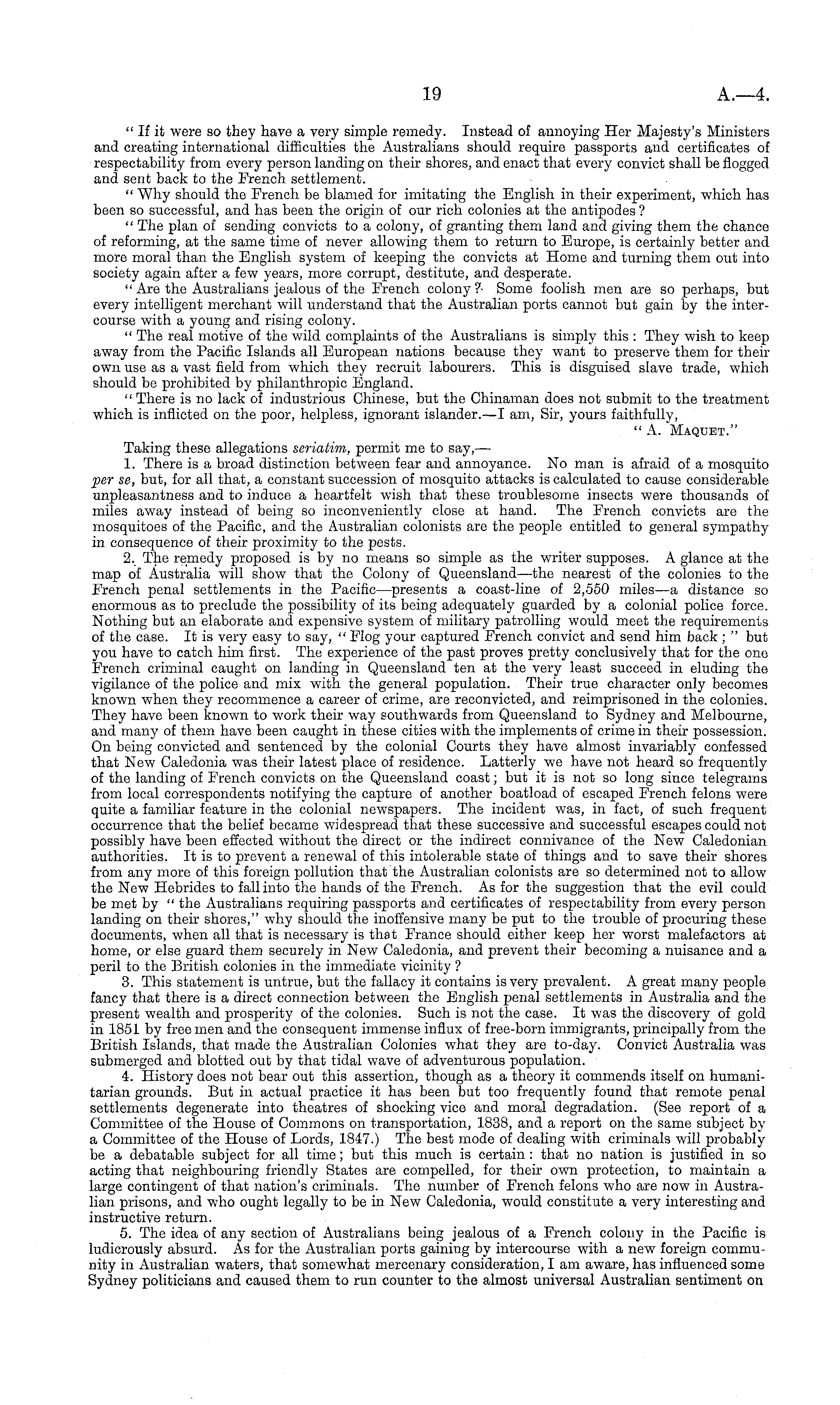 "If it were so they have a very simple remedy. Instead of annoying Her Majesty's Ministers and creating international difficulties the Australians should require passports and certificates of respectability from every person landing on their shores, and enact that every convict shall be flogged and sent back to the French settlement. " Why should the French be blamed for imitating the English in their experiment, which has been so successful, and has been the origin of our rich colonies at the antipodes ? " The plan of sending convicts to a colony, of granting them land and giving them the chance of reforming, at the same time of never allowing them to return to Europe, is certainly better and more moral than the English system of keeping the convicts at Home and turning them out into society again after a few years, more corrupt, destitute, and desperate. " Are the Australians jealous of the French colony?- Some foolish men are so perhaps, but every intelligent merchant will understand that the Australian ports cannot but gain by the intercourse with a young and rising colony. " The real motive of the wild complaints of the Australians is simply this : They wish to keep away from the Pacific Islands all European nations because they want to preserve them for their own use as a vast field from which they recruit labourers. This is disguised slave trade, which should be prohibited by philanthropic England. "There is no lack of industrious Chinese, but the Chinaman does not submit to the treatment which is inflicted on the poor, helpless, ignorant islander.—l am, Sir, yours faithfully, " A. Maquet." Taking these allegations seriatim, permit me to say,— 1. There is a broad distinction between fear and annoyance. No man is afraid of a mosquito per se, but, for all that, a constant succession of mosquito attacks is calculated to cause considerable unpleasantness and to induce a heartfelt wish that these troublesome insects were thousands of miles away instead of being so inconveniently close at hand. The French convicts are the mosquitoes of the Pacific, and the Australian colonists are the people entitled to general sympathy in consequence of their proximity to the pests. 2. The remedy proposed is by no means so simple as the writer supposes. A glance at the map of Australia will show that the Colony of Queensland —the nearest of the colonies to the French penal settlements in the Pacific—presents a coast-line of 2,550 miles—a distance so enormous as to preclude the possibility of its being adequately guarded by a colonial police force. Nothing but an elaborate and expensive system of military patrolling would meet the requirements of the case. It is very easy to say, " Flog your captured French convict and send him back ; " but you have to catch him first. The experience of the past proves pretty conclusively that for the one French criminal caught on landing in Queensland ten at the very least succeed in eluding the vigilance of the police and mix with the general population. Their true character only becomes known when they recommence a career of crime, are reconvicted, and reimprisoned in the colonies. They have been known to work their way southwards from Queensland to Sydney and Melbourne, and many of them have been caught in these cities with the implements of crime in their possession. On being convicted and sentenced by the colonial Courts they have almost invariably confessed that New Caledonia was their latest place of residence. Latterly we have not heard so frequently of the landing of French convicts on the Queensland coast; but it is not so long since telegrams from local correspondents notifying the capture of another boatload of escaped French felons were quite a familiar feature in the colonial newspapers. The incident was, in fact, of such frequent occurrence that the belief became widespread that these successive and successful escapes could not possibly have been effected without the direct or the indirect connivance of the New Caledonian authorities. It is to prevent a renewal of this intolerable state of things and to save their shores from any more of this foreign pollution that the Australian colonists are so determined not to allow the New Hebrides to fall into the hands of the French. As for the suggestion that the evil could be met by " the Australians requiring passports and certificates of respectability from every person landing on their shores," why should the inoffensive many be put to the trouble of procuring these documents, when all that is necessary is that France should either keep her worst malefactors at home, or else guard them securely in New Caledonia, and prevent their becoming a nuisance and a peril to the British colonies in the immediate vicinity ? 3. This statement is untrue, but the fallacy it contains is very prevalent. A great many people fancy that there is a direct connection between the English penal settlements in Australia and the present wealth and prosperity of the colonies. Such is not the case. It was the discovery of gold in 1851 by free men and the consequent immense influx of free-born immigrants, principally from the British Islands, that made the Australian Colonies what they are to-day. Convict Australia was submerged and blotted out by that tidal wave of adventurous population. 4. History does not bear out this assertion, though as a theory it commends itself on humanitarian grounds. But in actual practice it has been but too frequently found that remote penal settlements degenerate into theatres of shocking vice and moral degradation. (See report of a Committee of the House of Commons on transportation, 1838, and a report on the same subject by a Committee of the House of Lords, 1847.) The best mode of dealing with criminals will probably be a debatable subject for all time; but this much is certain : that no nation is justified in so acting that neighbouring friendly States are compelled, for their own protection,