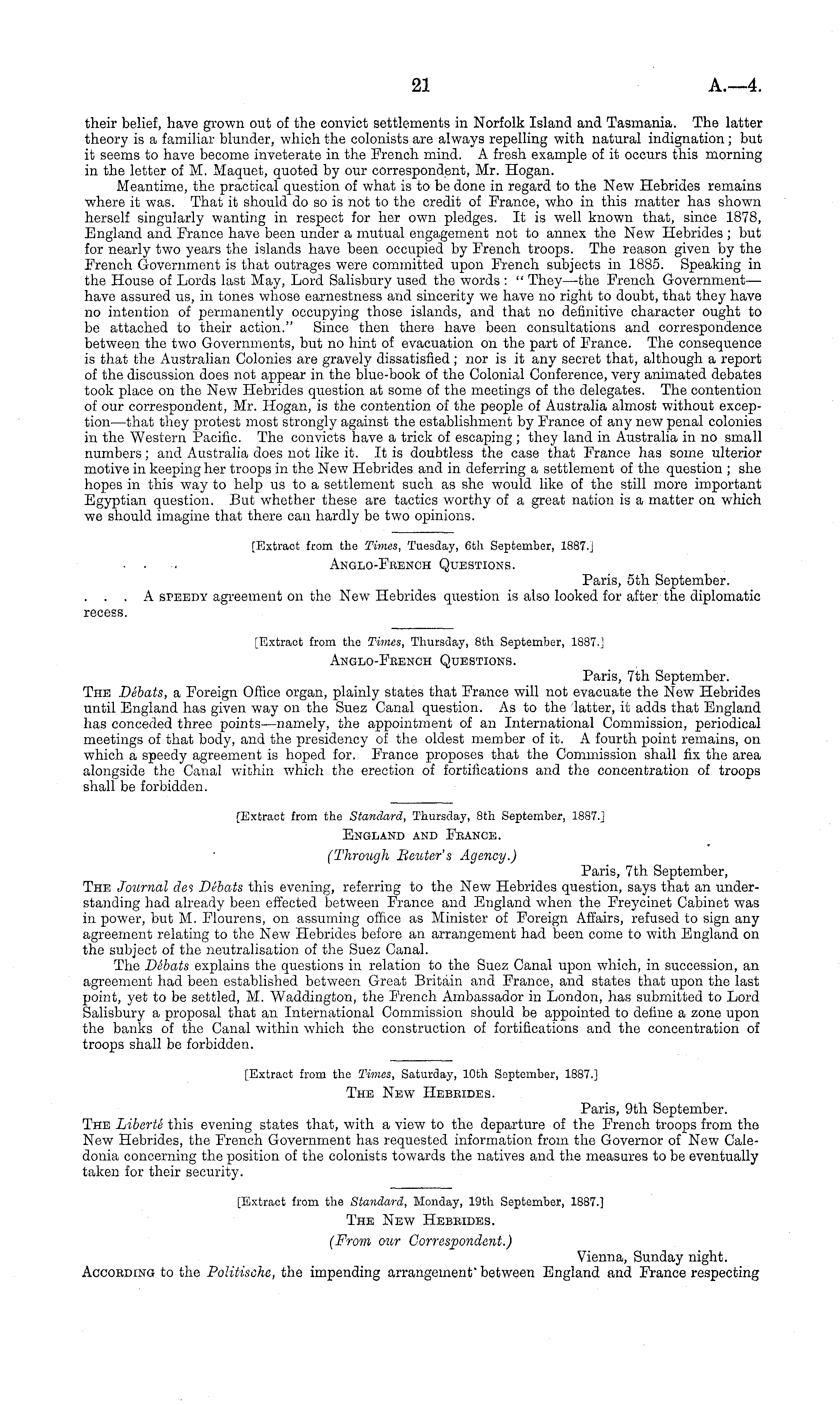 [Extract from the Times, Tuesday, 6th September, 1887.] - ■ ■. Anglo-French Questions. Paris, sth September. . A speedy agreement on the New Hebrides question is also looked for after the diplomatic recess.