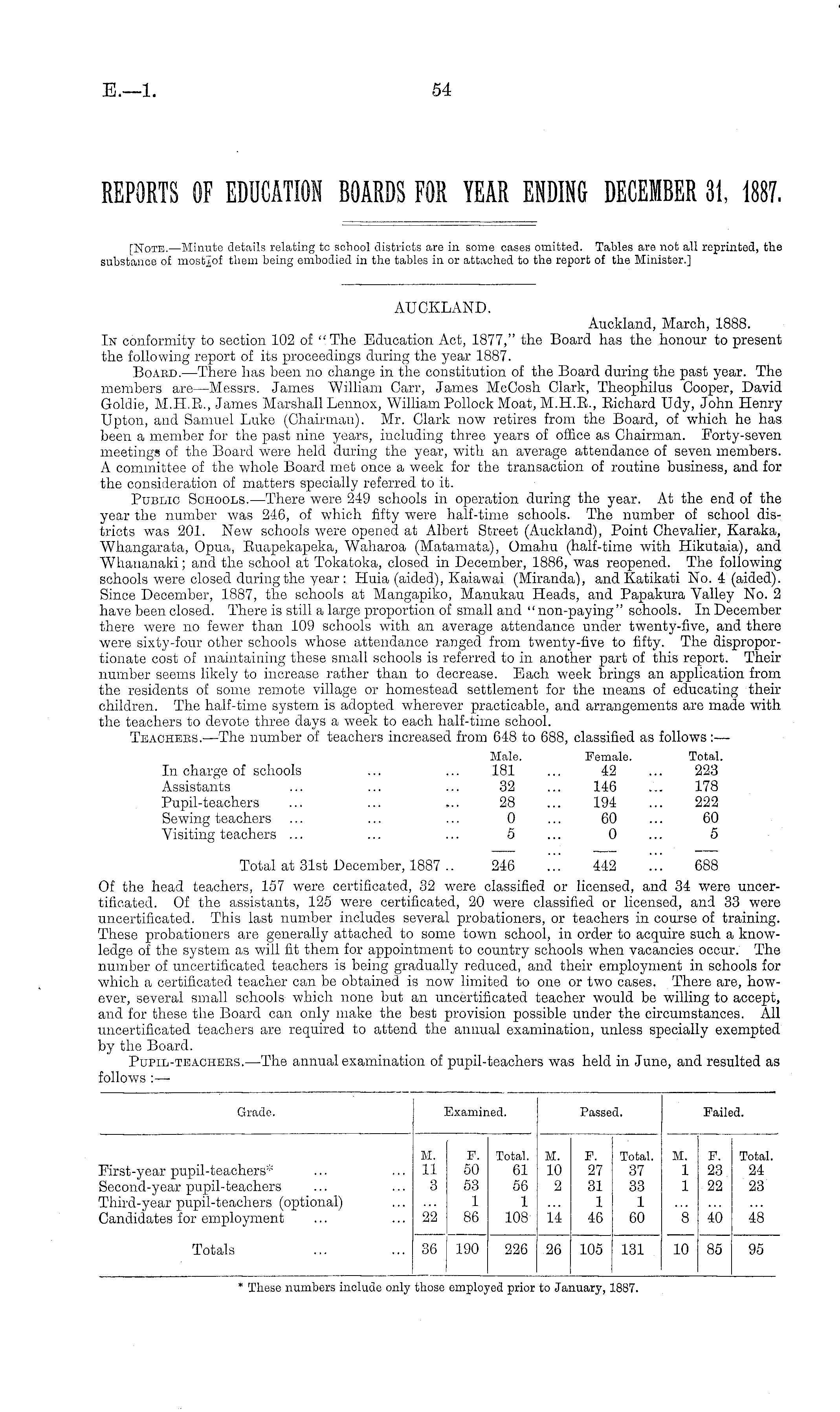 AUCKLAND. Auckland, March, 1888. In conformity to section 102 of "The Education Act, 1877," the Board has the honour to present the following report of its proceedings during the year 1887. Board. —There has been no change in the constitution of the Board during the past year. The members are—Messrs. James William Carr, James MeCosh Clark, Theophilus Cooper, David Goldie, M.H.E., James Marshall Lennox, William Pollock Moat, M.H.E., Eichard Udy, John Henry "Upton, and Samuel Luke (Chairman). Mr. Clark now retires from the Board, of which he has been a member for the past nine years, including three years of office as Chairman. Forty-seven meetings of the Board were held during the year, with an average attendance of seven members. A committee of the whole Board met once a week for the transaction of routine business, and for the consideration of matters specially referred to it. Public Schools. —There were 249 schools in operation during the year. At the end of the year the number was 246, of which fifty were half-time schools. The number of school districts was 201. New schools were opened at Albert Street (Auckland), Point Chevalier, Karaka, Whangarata, Opua, Euapekapeka, Waharoa (Matamata), Omahu (half-time with Hikutaia), and Whananaki; and the school at Tokatoka, closed in December, 1886, was reopened. The following schools were closed during the year : ITuia (aided), Kaiawai (Miranda), and Katikati No. 4 (aided). Since December, 1887, the schools at Mangapiko, Manukau Heads, and Papakura Valley No. 2 have been closed. There is still a large proportion of small and " non-paying" schools. In December there were no fewer than 109 schools with an average attendance under twenty-five, and there were sixty-four other schools whose attendance ranged from twenty-five to fifty. The disproportionate cost of maintaining these small schools is referred to in another part of this report. Their number seems likely to increase rather than to decrease. Each week brings an application from the residents of some remote village or homestead settlement for the means of educating their children. The half-time system is adopted wherever practicable, and arrangements are made with the teachers to devote three days a week to each half-time school. Teachees. —The number of teachers increased from 648 to 688, classified as follows :— Male. Female. Total. In charge of schools ... ... 181 ... 42 ... 223 Assistants ... ... ... 32 ... 146 ... 178 Pupil-teachers ... ... ... 28 ... 194 ... 222 Sewing teachers ... ... ... 0 ... 60 ... 60 Visiting teachers ... ... ... 5 ... 0 ... 5 Total at 31st December, 1887 .. 246 ... 442 ... 688 Of the head teachers, 157 were certificated, 32 were classified or licensed, and 34 were uncertificated. Of the assistants, 125 were certificated, 20 were classified or licensed, and 33 were uncertificated. This last number includes several probationers, or teachers in course of training. These probationers are generally attached to some town school, in order to acquire such a knowledge of the system as will fit them for appointment to country schools when vacancies occur. The number of uncertificated teachers is being gradually reduced, and their employment in schools for which a certificated teacher can be obtained is now limited to one or two cases. There are, however, several small schools which none but an uncertificated teacher would be willing to accept, and for these the Board can only make the best provision possible under the circumstances. All uncertificated teachers are required to attend the annual examination, unless specially exempted by the Board. Pupil-teachbbs.—The annual examination of pupil-teachers was held in June, and resulted as follows :—■