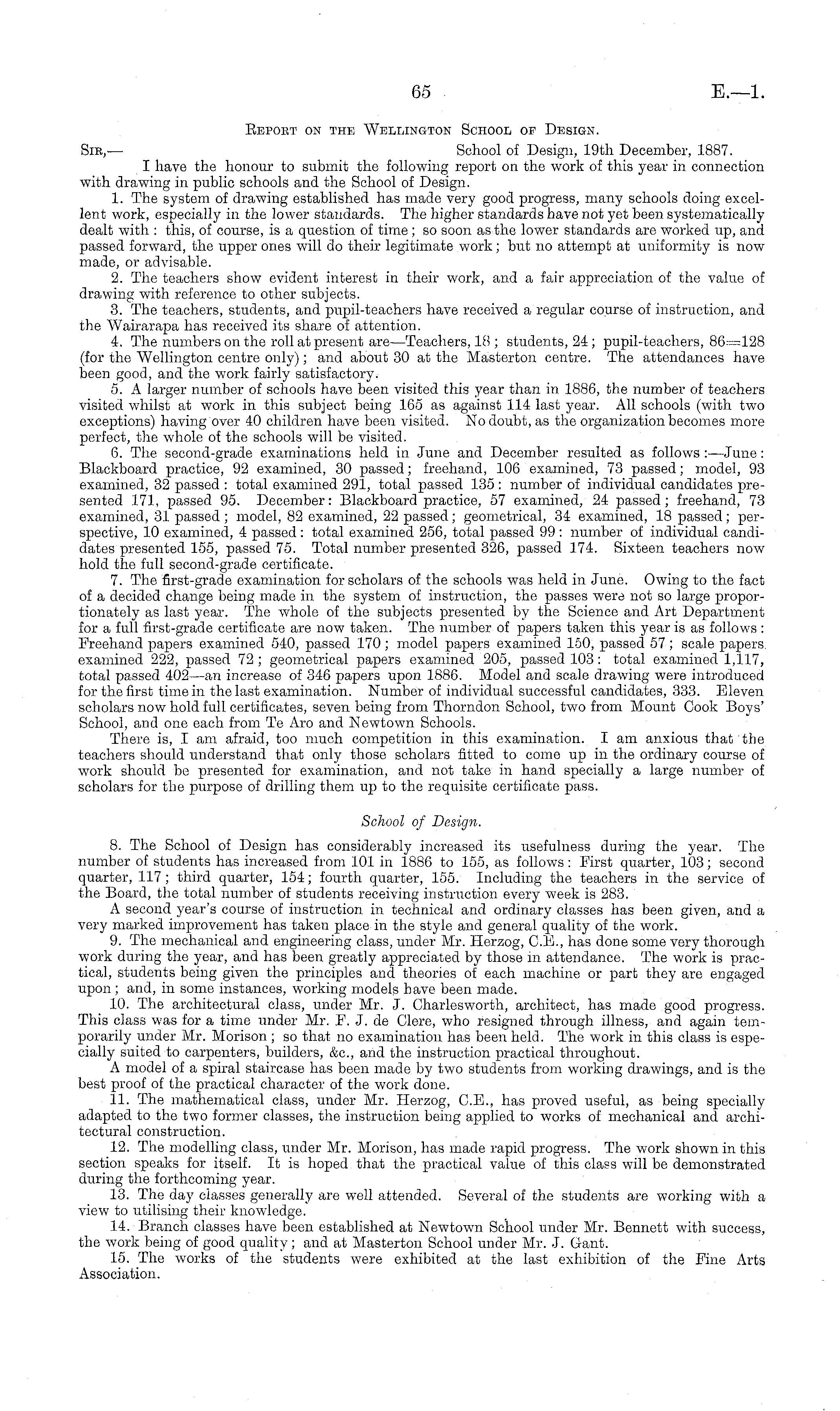Eepoet on the Wellington School op Design. Sir,— School of Design, 19th December, 1887. I have the honour to submit the following report on the work of this year in connection with drawing in public schools and the School of Design. 1. The system of drawing established has made very good progress, many schools doing excellent work, especially in the lower standards. The higher standards have not yet been systematically dealt with : this, of course, is a question of time; so soon as the lower standards are worked up, and passed forward, the upper ones will do their legitimate work; but no attempt at uniformity is now made, or advisable. 2. The teachers show evident interest in their work, and a fair appreciation of the value of drawing with reference to other subjects. 3. The teachers, students, and pupil-teachers have received a regular course of instruction, and the Wairarapa has received its share of attention. 4. The numbers on the roll at present are —Teachers, 18 ; students, 24 ; pupil-teachers, 86~=128 (for the Wellington centre only); and about 30 at the Masterton centre. The attendances have been good, and the work fairly satisfactory. 5. A larger number of schools have been visited this year than in 1886, the number of teachers visited whilst at work in this subject being 165 as against 114 last year. All schools (with two exceptions) having over 40 children have been visited. No doubt, as the organization becomes more perfect, the whole of the schools will be visited. 6. The second-grade examinations held in June and December resulted as follows : —June : Blackboard practice, 92 examined, 30 passed; freehand, 106 examined, 73 passed; model, 93 examined, 32 passed : total examined 291, total passed 135 : number of individual candidates presented 171, passed 95. December: Blackboard practice, 57 examined, 24 passed; freehand, 73 examined, 31 passed ; model, 82 examined, 22 passed; geometrical, 34 examined, 18 passed; perspective, 10 examined, 4 passed : total examined 256, total passed 99 : number of individual candidates presented 155, passed 75. Total number presented 326, passed 174. Sixteen teachers now hold the full second-grade certificate. 7. The first-grade examination for scholars of the schools was held in June. Owing to the fact of a decided change being made in the system of instruction, the passes were not so large proportionately as last year. The whole of the subjects presented by the Science and Art Department for a full first-grade certificate are now taken. The number of papers taken this year is as follows : Freehand papers examined 540, passed 170 ; model papers examined 150, passed 57 ; scale papers, examined 222, passed 72 ; geometrical papers examined 205, passed 103 : total examined 1,117, total passed 402—an increase of 346 papers upon 1886. Model and scale drawing were introduced for the first time in the last examination. Number of individual successful candidates, 333. Eleven scholars now hold full certificates, seven being from Thorndon School, two from Mount Cook Boys' School, and one each from Te Aro and Newtown Schools. There is, I am afraid, too much competition in this examination. I am anxious that the teachers should understand that only those scholars fitted to come up in the ordinary course of work should be presented for examination, and not take in hand specially a large number of scholars for the purpose of drilling them up to the requisite certificate pass. School of Design. 8. The School of Design has considerably increased its usefulness during the year. The number of students has increased from 101 in 1886 to 155, as follows : First quarter, 103; second quarter, 117; third quarter, 154; fourth quarter, 155. Including the teachers in the service of the Board, the total number of students receiving instruction every week is 283. A second year's course of instruction in technical and ordinary classes has been given, and a very marked improvement has taken place in the style and general quality of the work. 9. The mechanical and engineering class, under Mr. Herzog, C.E., has done some very thorough work during the year, and has been greatly appreciated by those in attendance. The work is practical, students being given the principles and theories of each machine or part they are engaged upon ; and, in some instances, working models have been made. 10. The architectural class, under Mr. J. Charlesworth, architect, has made good progress. This class was for a time under Mr. F. J. de Clere, who resigned through illness, and again temporarily under Mr. Morison ; so that no examination has been held. The work in this class is especially suited to carpenters, builders, &c, and the instruction practical throughout. A model of a spiral staircase has been made by two students from working drawings, and is the best proof of the practical character of the work done. 11. The mathematical class, under Mr. Herzog, C.E., has proved useful, as being specially adapted to the two former classes, the instruction being applied to works of mechanical and architectural construction. 12. The modelling class, under Mr. Morison, has made rapid progress. The work shown in this section speaks for itself. It is hoped that the practical value of this class will be demonstrated during the forthcoming year. 13. The day classes generally are well attended. Several of the students are working with a view to utilising their knowledge. 14. Branch classes have been established at Newtown School under Mr. Bennett with success, the work being of good quality; and at Masterton School under Mr. J. Gant. 15. The works of the students were exhibited at the last exhibition of the Fine Arts Association.