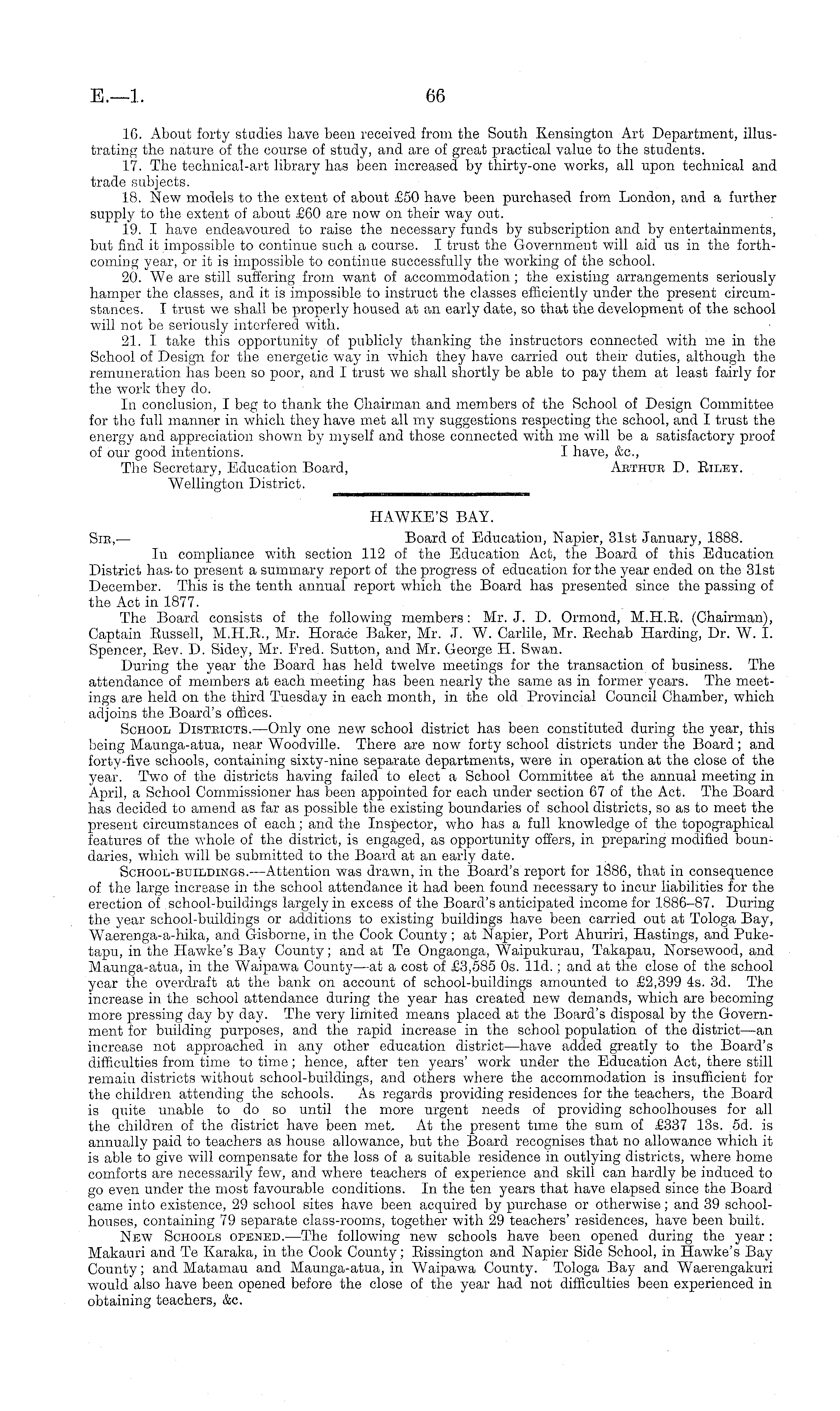 16. About forty studies have been received from the South Kensington Art Department, illustrating the nature of the course of study, and are of great practical value to the students. 17. The technical-art library has been increased, by thirty-one works, all upon technical and trade subjects. 18. New models to the extent of about £50 have been purchased from London, and a further supply to the extent of about £60 are now on their way out. 19. I have endeavoured to raise the necessary funds by subscription and by entertainments, but find it impossible to continue such a course. I trust the Government will aid us in the forthcoming year, or it is impossible to continue successfully the working of the school. 20. We are still suffering from want of accommodation; the existing arrangements seriously hamper the classes, and it is impossible to instruct the classes efficiently under the present circumstances. I trust we shall be properly housed at an early date, so that the development of the school will not be seriously interfered with. 21. I take this opportunity of publicly thanking the instructors connected with mo in the School of Design for the energetic way in which they have carried out their duties, although the remuneration has been so poor, and I trust we shall shortly be able to pay them at least fairly for the work they do. In conclusion, I beg to thank the Chairman and members of the School of Design Committee for the full manner in which they have met all my suggestions respecting the school, and I trust the energy and appreciation shown by myself and those connected with me will be a satisfactory proof of our good intentions. I have, &c, The Secretary, Education Board, Ap.thur D. Eiley. Wellington District.
