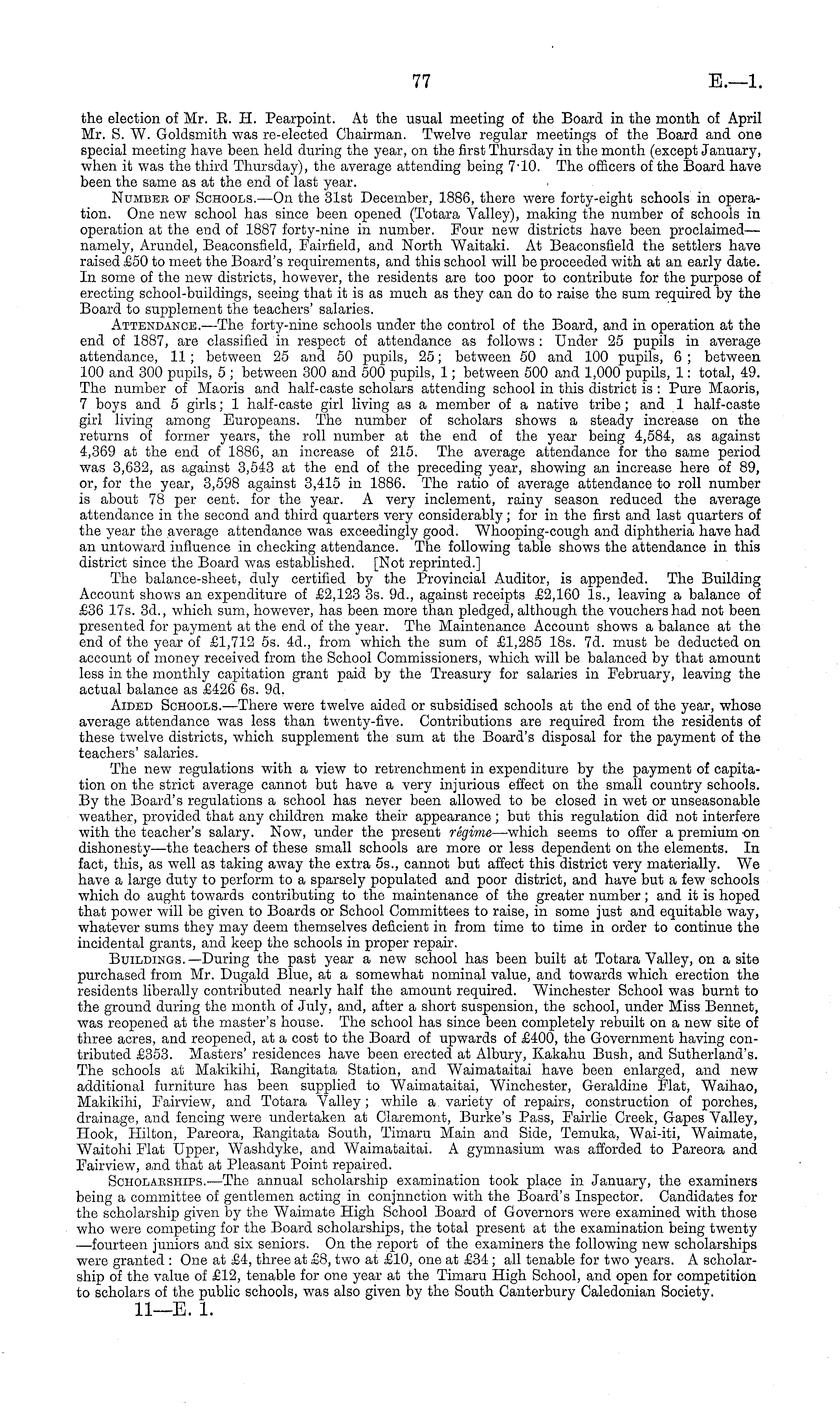 the election of Mr. E. H. Pearpoint. At the usual meeting of the Board in the month of April Mr. S. W. Goldsmith was re-elected Chairman. Twelve regular meetings of the Board and one special meeting have been held during the year, on the first Thursday in the month (except January, when it was the third Thursday), the average attending being 7'lo. The officers of the Board have been the same as at the end of last year. Numbbe of Schools.—On the 31st December, 1886, there were forty-eight schools in operation. One new school has since been opened (Totara Valley), making the number of schools in operation at the end of 1887 forty-nine in number. Four new districts have been proclaimed— namely, Arundel, Beaconsfield, Fairfield, and North Waitaki. At Beaconsfield the settlers have raised £50 to meet the Board's requirements, and this school will be proceeded with at an early date. In some of the new districts, however, the residents are too poor to contribute for the purpose of erecting school-buildings, seeing that it is as much as they can do to raise the sum required by the Board to supplement the teachers' salaries. Attendance.—The forty-nine schools under the control of the Board, and in operation at the end of 1887, are classified in respect of attendance as follows : Under 25 pupils in average attendance, 11; between 25 and 50 pupils, 25; between 50 and 100 pupils, 6 ; between 100 and 300 pupils, 5 ; between 300 and 500 pupils, 1; between 500 and 1,000 pupils, 1: total, 49. The number of Maoris and half-caste scholars attending school in this district is : Pure Maoris, 7 boys and 5 girls; 1 half-caste girl living as a member of a native tribe; and 1 half-caste girl living among Europeans. The number of scholars shows a steady increase on the returns of former years, the roll number at the end of the year being 4,584, as against 4,369 at the end of 1886, an increase of 215. The average attendance for the same period was 3,632, as against 3,543 at the end of the preceding year, showing an increase here of 89, or, for the year, 3,598 against 3,415 in 1886. The ratio of average attendance to roll number is about 78 per cent, for the year. A very inclement, rainy season reduced the average attendance in the second and third quarters very considerably; for in the first and last quarters of the year the average attendance was exceedingly good. Whooping-cough and diphtheria have had an untoward influence in checking attendance. The following table shows the attendance in this district since the Board was established. [Not reprinted.] The balance-sheet, duly certified by the Provincial Auditor, is appended. The Building Account shows an expenditure of £2,123 3s. 9d., against receipts £2,160 Is., leaving a balance of £36 17s. 3d., which sum, however, has been more than pledged, although the vouchers had not been presented for payment at the end of the year. The Maintenance Account shows a balance at the end of the year of £1,712 ss. 4d., from which the sum of £1,285 18s. 7d. must be deducted on account of money received from the School Commissioners, which will be balanced by that amount less in the monthly capitation grant paid by the Treasury for salaries in February, leaving the actual balance as £426 6s. 9d. Aided Schools. —There were twelve aided or subsidised schools at the end of the year, whose average attendance was less than twenty-five. Contributions are required from the residents of these twelve districts, which supplement the sum at the Board's disposal for the payment of the teachers' salaries. The new regulations with a view to retrenchment in expenditure by the payment of capitation on the strict average cannot but have a very injurious effect on the small country schools. By the Board's regulations a school has never been allowed to be closed in wet or unseasonable weather, provided that any children make their appearance; but this regulation did not interfere with the teacher's salary. Now, under the present regime —which seems to offer a premium on dishonesty—the teachers of these small schools are more or less dependent on the elements. In fact, this, as well as taking away the extra 55., cannot but affect this district very materially. We have a large duty to perform to a sparsely populated and poor district, and have but a few schools which do aught towards contributing to the maintenance of the greater number; and it is hoped that power will be given to Boards or School Committees to raise, in some just and equitable way, whatever sums they may deem themselves deficient in from time to time in order to continue the incidental grants, and keep the schools in proper repair. Buildings.—During the past year a new school has been built at Totara Valley, on a site purchased from Mr. Dugald Blue, at a somewhat nominal value, and towards which erection the residents liberally contributed nearly half the amount required. Winchester School was burnt to the ground during the month of July, and, after a short suspension, the school, under Miss Bennet, was reopened at the master's house. The school has since been completely rebuilt on a new site of three acres, and reopened, at a cost to the Board of upwards of £400, the Government having contributed £353. Masters' residences have been erected at Albury, Kakahu Bush, and Sutherland's. The schools at Makikihi, Eangitata Station, and Waimataitai have been enlarged, and new additional furniture has been supplied to Waimataitai, Winchester, Geraldine Flat, Waihao, Makikihi, Fairview, and Totara Valley; while a. variety of repairs, construction of porches, drainage, and fencing were undertaken at Claremont, Burkes Pass, Fairlie Creek, Gapes Valley, Hook, Hilton, Pareora, Eangitata South, Timaru Main and Side, Temuka, Wai-iti, Waimate, Waitohi Flat Upper, Washdyke, and Waimataitai. A gymnasium was afforded to Pareora and Fairview, a,nd that at Pleasant Point repaired. Scholarships.—The annual scholarship examinatio