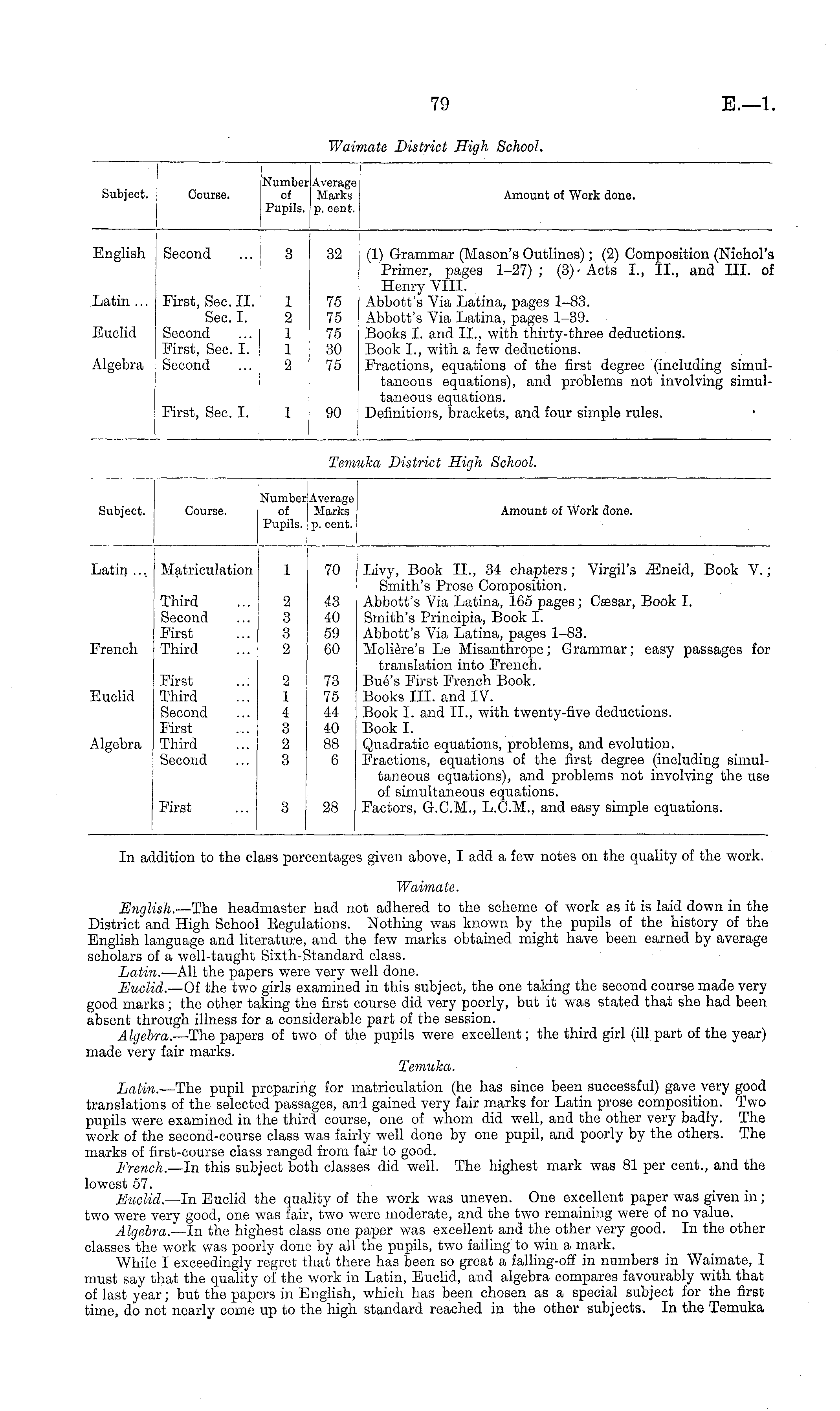 In addition to the class percentages given above, I add a few notes on the quality of the work. Waimate. English.' —The headmaster had not adhered to the scheme of work as it is laid down in the District and High School Eegulations. Nothing was known by the pupils of the history of the English language and literature, and the few marks obtained might have been earned by average scholars of a well-taught Sixth-Standard class. Latin.- —All the papers were very well done. Euclid. —Of the two girls examined in this subject, the one taking the second course made very good marks; the other taking the first course did very poorly, but it was stated that she had been absent through illness for a considerable part of the session. Algebra. —The papers of two of the pupils were excellent; the third girl (ill part of the year) made very fair marks. Temuka. Latin. —The pupil preparing for matriculation (he has since been successful) gave very good translations of the selected passages, and gained very fair marks for Latin prose composition. Two pupils were examined in the third course, one of whom did well, and the other very badly. The work of the second-course class was fairly well done by one pupil, and poorly by the others. The marks of first-course class ranged from fair to good. French. —ln this subject both classes did well. The highest mark was 81 per cent., and the lowest 57. Euclid. —In Euclid the quality of the work was uneven. One excellent paper was given in; two were very good, one was fair, two were moderate, and the two remaining were of no value. Algebra. —ln the highest class one paper was excellent and the other very good. In the other classes the work was poorly done by all the pupils, two failing to win a mark. While I exceedingly regret that there has been so great a falling-off in numbers in Waimate, I must say that the quality of the work in Latin, Euclid, and algebra compares favourably with that of last year; but the papers in English, which has been chosen as a special subject for the first time, do not nearly come up to the high standard reached in the other subjects. In the Temuka