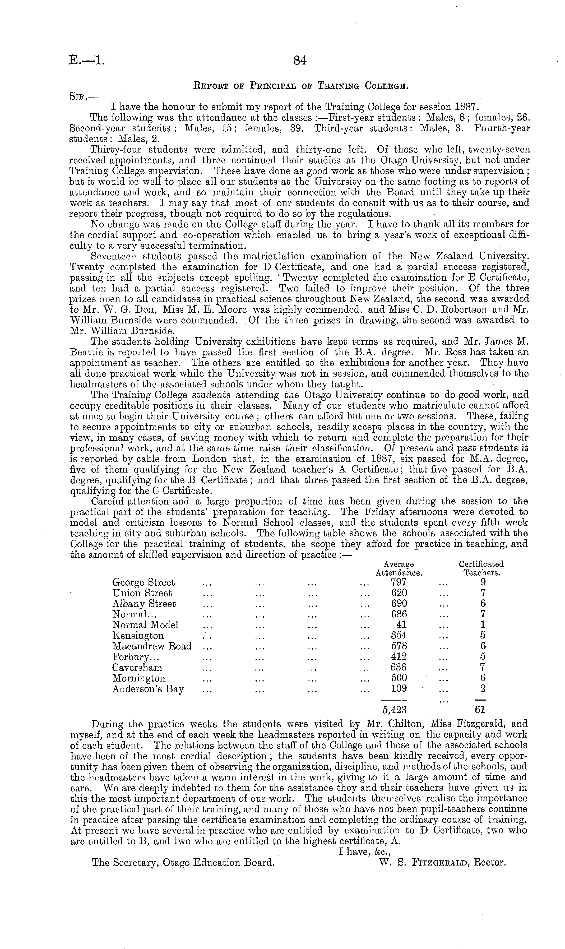 Eepoet of Pbincipal op Teaining College. SlE,— I have the honour to submit my report of the Training College for session 1887. The following was the attendance at the classes : —First-year students : Males, 8 ; females, 26. Second-year students : Males, 15; females, 39. Third-year students: Males, 3. Fourth-year students: Males, 2. Thirty-four students were admitted, and thirty-one left. Of those who left, twenty-seven received appointments, and three continued their studies at the Otago University, but not under Training College supervision. These have done as good work as those who were under supervision ; but it would be well to place all our students at the University on the same footing as to reports of attendance and work, and so maintain their connection with the Board until they take up their work as teachers. I may say that most of our students do consult with us as to their course, and report their progress, though not required to do so by the regulations. No change was made on the College staff during the year. I have to thank all its members for the cordial support and co-operation which enabled us to bring a year's work of exceptional difficulty to a very successful termination. Seventeen students passed the matriculation examination of the New Zealand University. Twenty completed the examination for D Certificate, and one had a partial success registered, passing in all the subjects except spelling. ' Twenty completed the examination for B Certificate, and ten had a partial success registered. Two failed to improve their position. Of the three prizes open to all candidates in practical science throughout New Zealand, the second was awarded to Mr. W. G. Don, Miss M. E. Moore was highly commended, and Miss C. D. Eobertson and Mr. William Burnside were commended. Of the three prizes in drawing, the second was awarded to Mr. William Burnside. The students holding University exhibitions have kept terms as required, and Mr. James M. Beattie is reported to have passed the first section of the B.A. degree. Mr. Eoss has taken an appointment as teacher. The others are entitled to the exhibitions for another year. They have all done practical work while the University was not in session, and commended themselves to the headmasters of the associated schools under whom they taught. The Training College students attending the Otago University continue to do good work, and occupy creditable positions in their classes. Many of our students who matriculate cannot afford at once to begin their University course ; others can afford but one or two sessions. These, failing to secure appointments to city or suburban schools, readily accept places in the country, with the view, in many cases, of saving money with which to return and complete the preparation for their professional work, and at the same time raise their classification. Of present and past students it is reported by cable from London that, in the examination of 1887, six passed for M.A. degree, five of them qualifying for the New Zealand teacher's A Certificate; that five passed for B.A. degree, qualifying for the B Certificate ; and that three passed the first section of the B.A. degree, qualifying for the C Certificate. Careful attention and a large proportion of time has been given during the session to the practical part of the students' preparation for teaching. The Friday afternoons were devoted to model and criticism lessons to Normal School classes, and the students spent every fifth week teaching in city and suburban schools. The following table shows the schools associated with the College for the practical training of students, the scope they afford for practice in teaching, and the amount of skilled supervision and direction of practice : — Average Certificated Attendance. Teachers. George Street ... ... ... ... 797 ... 9 Union Street ... ... ... ... 620 ... 7 Albany Street ... ... ... ... 690 ... 6 Normal... ... ... ... ... 686 ... 7 Normal Model ... ... ... ... 41 ... 1 Kensington ... ... ... ... 354 ... 5 Macandrew Eoad ... ... ... ... 578 ... 6 Forbury... ... ... ... ... 412 ... 5 Caversham ... ... ~. ... 636 ... 7 Mornington ... ... ... ... 500 ... 6 Anderson's Bay ... ... ... ... 109 ■ ... 2 5,423 61 During the practice weeks the students were visited by Mr. Chilton, Miss Fitzgerald, and myself, and at the end of each week the headmasters reported in writing on the capacity and work of each student. The relations between the staff of the College and those of the associated schools have been of the most cordial description; the students have been kindly received, every opportunity has been given them of observing the organization, discipline, and methods of the schools, and the headmasters have taken a warm interest in the work, giving to it a large amount of time and care. We are deeply indebted to them for the assistance they and their teachers have given us in this the most important department of our work. The students themselves realise the importance of the practical part of thsir training, and many of those who have not been pupil-teachers continue in practice after passing the certificate examination and completing the ordinary course of training. At present we have several in practice who are entitled by examination to D Certificate, two who are entitled to B, and two who are entitled to the highest certificate, A. I have, &c, The Secretary, Otago Education Board. W. S. Fitzgeeald, Rector.