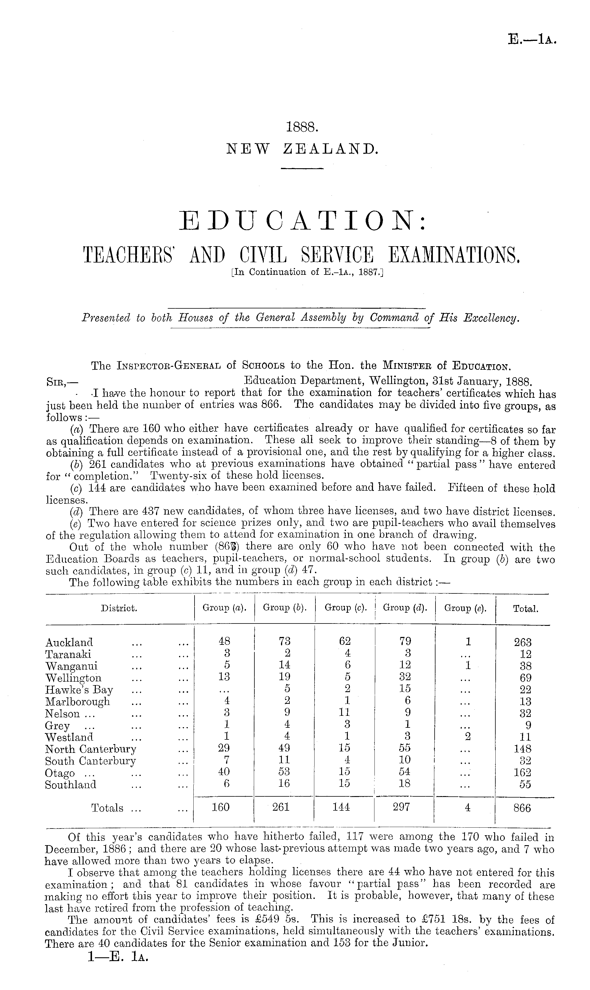 The Inspectob-Genekal of Schools to the Hon. the Minister of Education. Sic, — Education Department, Wellington, 31st January, 1888. •I ha-ve the honour to report that for the examination for teachers' certificates which has just been held the number of entries was 866. The candidates may be divided into five groups, as follows: — (a) There are 160 who either have certificates already or have qualified for certificates so far as qualification depends on examination. These all seek to improve their standing—B of them by obtaining a full certificate instead of a provisional one, and the rest by qualifying for a higher class. (5) 261 candidates who at previous examinations have obtained " partial pass " have entered for " completion." Twenty-six of these hold licenses. (c) 144 are candidates who have been examined before and have failed. Fifteen of these hold licenses. (d) There are 437 new candidates, of whom three have licenses, and two have district licenses. (c) Two have entered for science prizes only, and two are pupil-teachers who avail themselves of the regulation allowing them to attend for examination in one branch of drawing. Out of the whole number (863) there are only 60 who have not been connected with the Education Boards as teachers, pupil-teachers, or normal-school students. In group (6) are two such candidates, in group (c) 11, and in group (d) 47. The following table exhibits the numbers in each group in each district: —