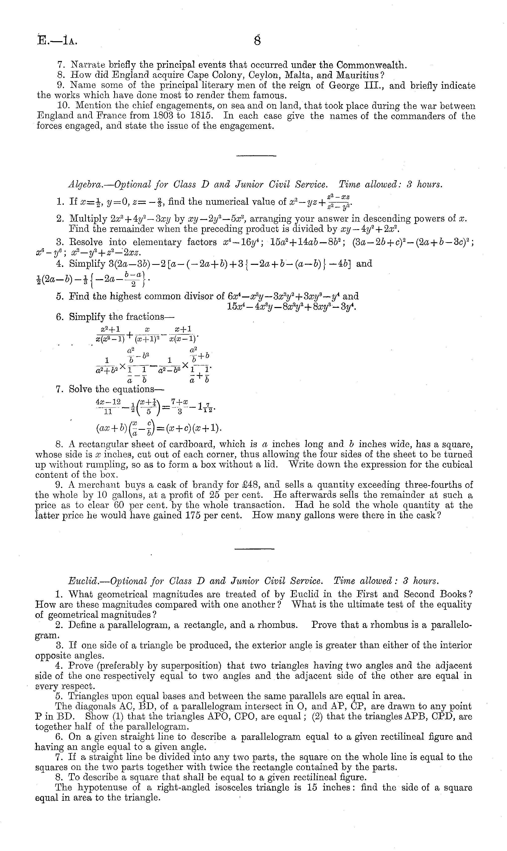 Algebra. — Optional for Class D and Junior Civil Service. Time allowed: 3 hours. 1. If x-=.\, y=o,z= — f, find the numerical value of x' i —yz + %~_ r 2. Multiply 2x 2 + iy2 — 3xy by xy—2y 2—5x 2, arranging your answer in descending powers of x. Find the remainder when the preceding product is divided by xy — iy 2 + 2x 2. 3. Eesolve into elementary factors x i-16y i; 15a 2 + liab-8b 2; (3a-2b + cf-(2a + b-3c) 2; x s-yc; x 2—y 2 + z 2—2xz. 4. Simplify 3(2a-36)— 2[a-(-2a+b)+3\-2a + b-(a—b)\-ib] and l(2a-b)-l\-2a- b-f r 5. Find the highest common divisor of 6x i —x 3y—3x 2y 2 + 3xy s —yi and 15x 4 - ix 3y— B»y+ Qxy* - 3y\ 6. Simplify the fractions— a2+l x x+l x(x* -1) "■"(«s+l) a ~~ x(x-i)' ab a b 7. Solve the equations— ~n *{ 5 )~3 12--(ax + b)^-l) = (x + c)(x + l). 8. A rectangular sheet of cardboard, which is a inches long and b inches wide, has a square, whose side is x inches, cut out of each corner, thus allowing the four sides of the sheet to be turned up without rumpling, so as to form a box without a lid. Write down the expression for the cubical content of the box. 9. A merchant buys a cask of brandy for £48, and sells a quantity exceeding three-fourths of the whole by 10 gallons, at a profit of 25 per cent. He afterwards sells the remainder at such a price as to clear 60 per cent, by the whole transaction. Had he sold the whole quantity at the latter price he would have gained 175 per cent. How many gallons were there in the cask?