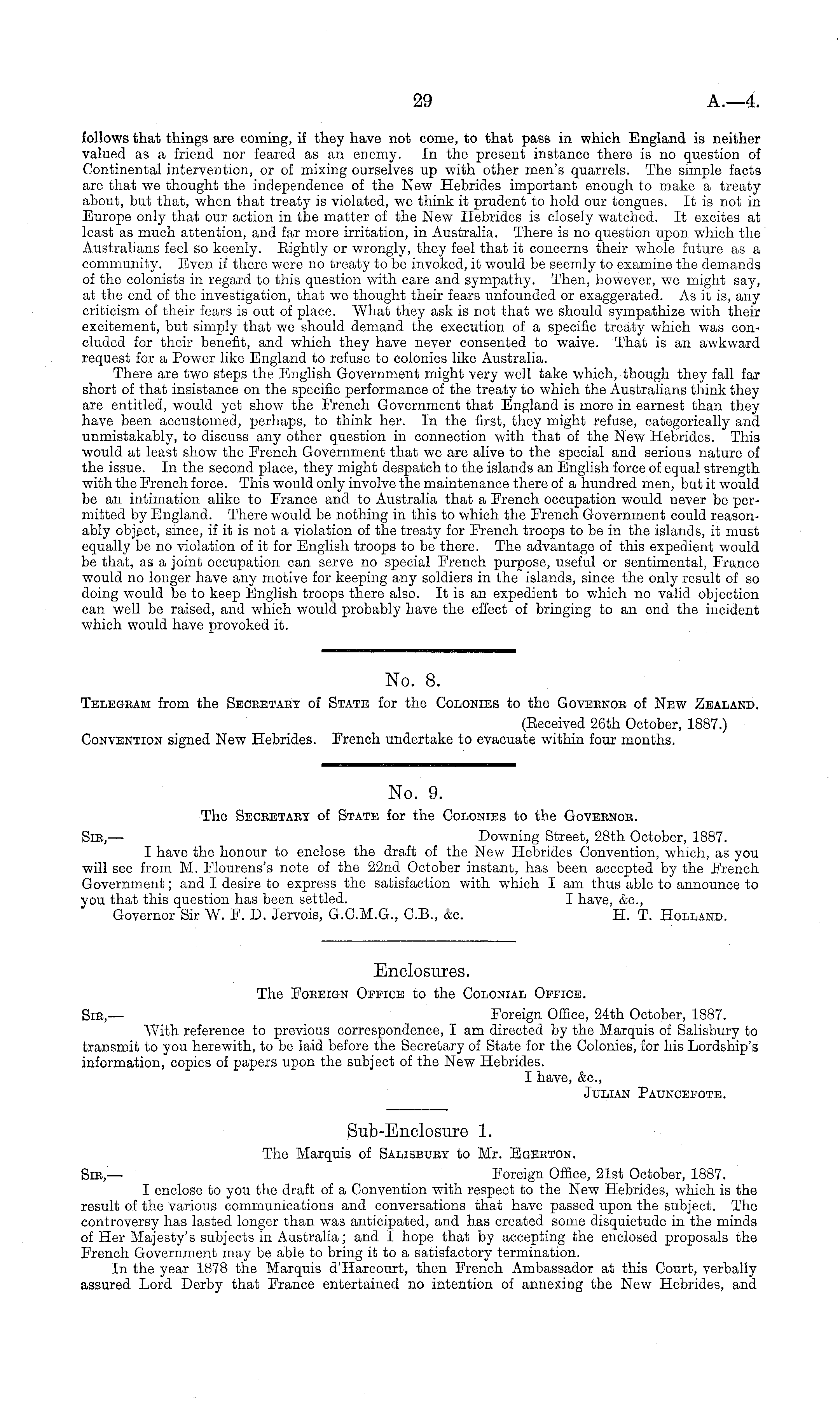 Sub-Enclosure 1. The Marquis of Salisbuby to Mr. Egebton. Sib,— Foreign Office, 21st October, 1887. I enclose to you the draft of a Convention with respect to the New Hebrides, which is the result of the various communications and conversations that have passed upon the subject. The controversy has lasted longer than was anticipated, and has created some disquietude in the minds of Her Majesty's subjects in Australia; and I hope that by accepting the enclosed proposals the French Government may be able to bring it to a satisfactory termination. In the year 1878 the Marquis d'Harcourt, then French Ambassador at this Court, verbally assured Lord Derby that France entertained no intention of annexing the New Hebrides, and