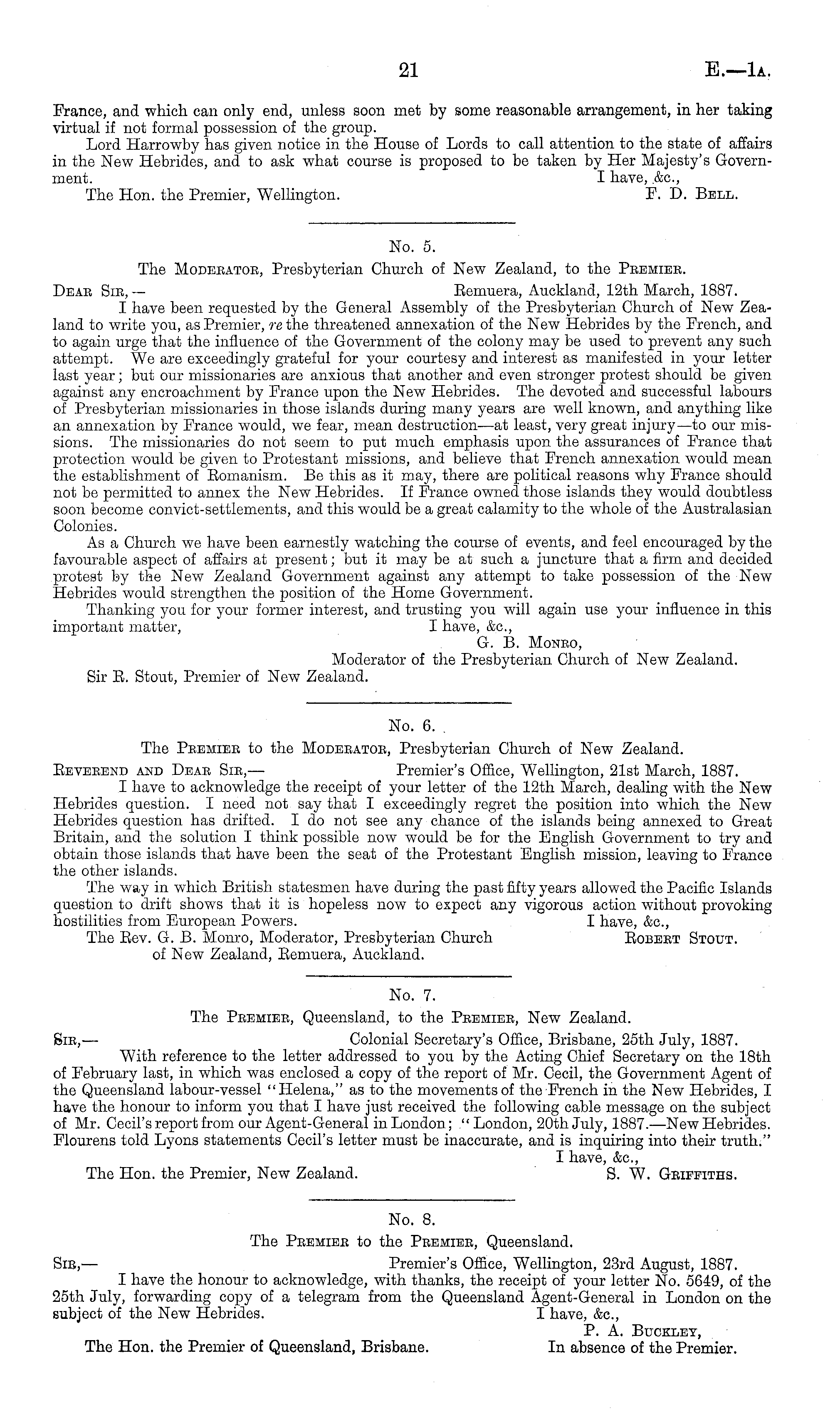 No. 5. The Modeeatoe, Presbyterian Church of New Zealand, to the Peemiee. Deae Sic, — Eemuera, Auckland, 12th March, 1887. I have been requested by the General Assembly of the Presbyterian Church of New Zealand to write you, as Premier, re the threatened annexation of the New Hebrides by the French, and to again urge that the influence of the Government of the colony may be used to prevent any such attempt. We are exceedingly grateful for your courtesy and interest as manifested in your letter last year; but our missionaries are anxious that another and even stronger protest should be given against any encroachment by France upon the New Hebrides. The devoted and successful labours of Presbyterian missionaries in those islands during many years are well known, and anything like an annexation by France would, we fear, mean destruction —at least, very great injury—to our missions. The missionaries do not seem to put much emphasis upon the assurances of France that protection would be given to Protestant missions, and believe that French annexation would mean the establishment of Eomanism. Be this as it may, there are political reasons why France should not be permitted to annex the New Hebrides. If France owned those islands they would doubtless soon become convict-settlements, and this would be a great calamity to the whole of the Australasian Colonies. As a Church we have been earnestly watching the course of events, and feel encouraged by the favourable aspect of affairs at present; but it may be at such a juncture that a firm and decided protest by the New Zealand Government against any attempt to take possession of the New Hebrides would strengthen the position of the Home Government. Thanking you for your former interest, and trusting you will again use your influence in this important matter, I have, &c, G. B. Moneo, Moderator of the Presbyterian Church of New Zealand. Sir E. Stout, Premier of New Zealand.