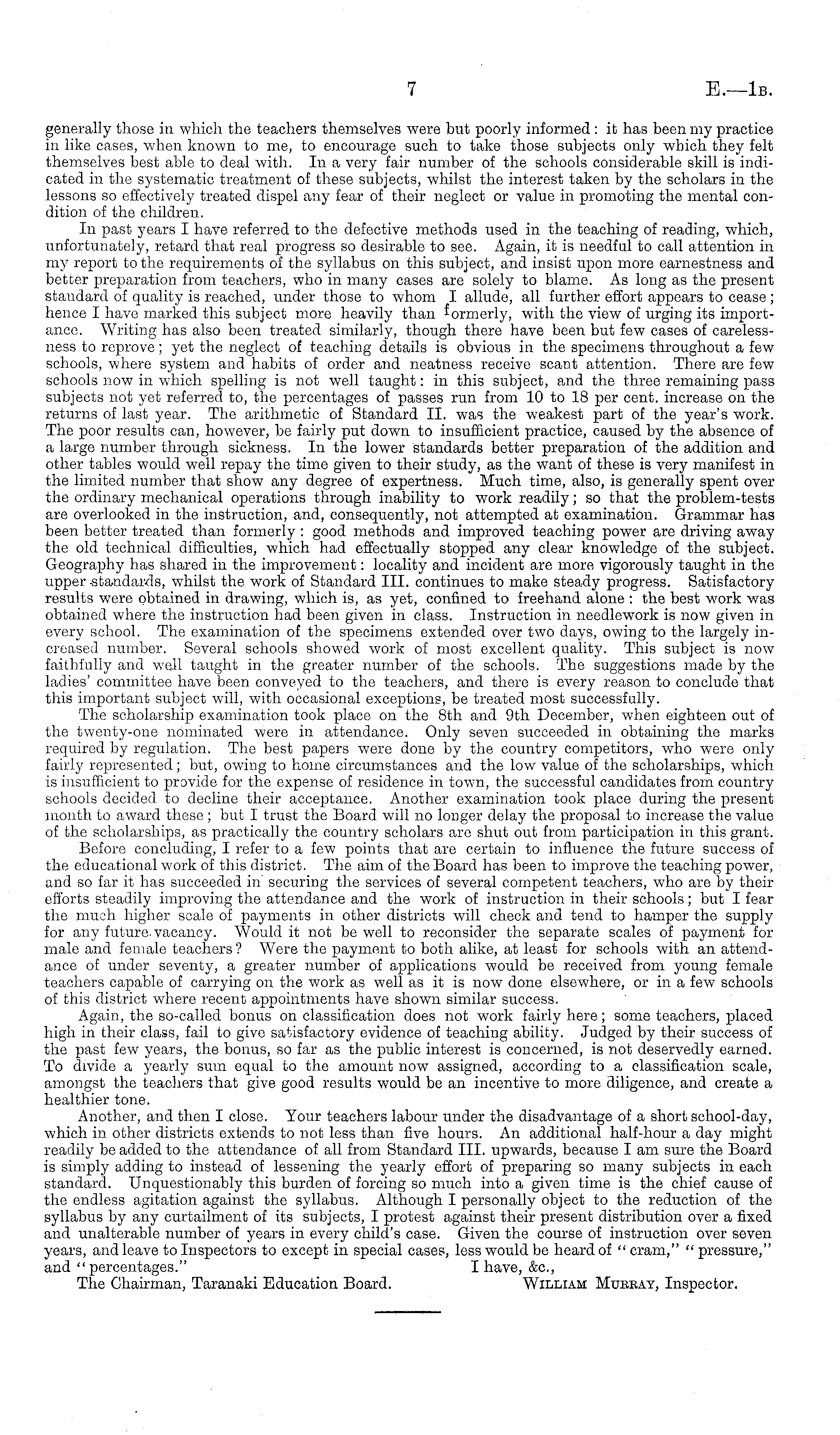 generally those in which the teachers themselves were but poorly informed : it has been my practice in like cases, when known to me, to encourage such to take those subjects only which they felt themselves best able to deal with. In a very fair number of the schools considerable skill is indicated in the systematic treatment of these subjects, whilst the interest taken by the scholars in the lessons so effectively treated dispel any fear of their neglect or value in promoting the mental condition of the children. In past years I have referred to the defective methods used in the teaching of reading, which, unfortunately, retard that real progress so desirable to see. Again, it is needful to call attention in my report to the requirements of the syllabus on this subject, and insist upon more earnestness and better preparation from teachers, who in many cases are solely to blame. As long as the present standard of quality is reached, under those to whom I allude, all further effort appears to cease ; hence I have marked this subject more heavily than formerly, with the view of urging its importance. Writing has also been treated similarly, though there have been but few cases of carelessness to reprove; yet the neglect of teaching details is obvious in the specimens throughout a few schools, where system and habits of order and neatness receive scant attention. There are few schools now in which spelling is not well taught: in this subject, and the three remaining pass subjects not yet referred to, the percentages of passes run from 10 to 18 per cent, increase on the returns of last year. The arithmetic of Standard 11. was the weakest part of the year's work. The poor results can, however, be fairly put down to insufficient practice, caused by the absence of a large number through sickness. In the lower standards better preparation of the addition and other tables would well repay the time given to their study, as the want of these is very manifest in the limited number that show any degree of expertness. Much time, also, is generally spent over the ordinary mechanical operations through inability to work readily; so that the problem-tests are overlooked in the instruction, and, consequently, not attempted at examination. Grammar has been better treated than formerly : good methods and improved teaching power are driving away the old technical difficulties, which had effectually stopped any clear knowledge of the subject. Geography has shared in the improvement: locality and incident are more vigorously taught in the upper -standards, whilst the work of Standard 111. continues to make steady progress. Satisfactory results were obtained in drawing, which is, as yet, confined to freehand alone : the best work was obtained where the instruction had been given in class. Instruction in needlew rork is now given in every school. The examination of the specimens extended over two days, owing to the largely increased number. Several schools showed work of most excellent quality. This subject is now faithfully and well taught in the greater number of the schools. The suggestions made by the ladies' committee have been conveyed to the teachers, and there is every reason to conclude that this important subject will, with occasional exceptions, be treated most successfully. The scholarship examination took place on the Bth and 9th December, when eighteen out of the twenty-one nominated were in attendance. Only seven succeeded in obtaining the marks required by regulation. The best papers were done by the country competitors, who were only fairly represented; but, owing to home circumstances and the low value of the scholarships, which is insufficient to provide for the expense of residence in town, the successful candidates from country schools decided to decline their acceptance. Another examination took place during the present month to award these ; but I trust the Board will no longer delay the proposal to increase the value of the scholarships, as practically the country scholars are shut out from participation in this grant. Before concluding, I refer to a few points that are certain to influence the future success of the educational work of this district. The aim of the Board has been to improve the teaching power, and so far it has succeeded in securing the services of several competent teachers, who are by their efforts steadily improving the attendance and the work of instruction in their schools; but I fear the much higher scale of payments in other districts will check and tend to hamper the supply for any future, vacancy. Would it not be well to reconsider the separate scales of payment for male and female teachers? Were the payment to both alike, at least for schools with an attendance of under seventy, a greater number of applications would be received from young female teachers capable of carrying on the work as well as it is now done elsewhere, or in a few schools of this district where recent appointments have shown similar success. Again, the so-called bonus on classification does not work fairly here; some teachers, placed high in their class, fail to give satisfactory evidence of teaching ability. Judged by their success of the past few years, the bonus, so far as the public interest is concerned, is not deservedly earned. To divide a yearly sum equal to the amount now assigned, according to a classification scale, amongst the teachers that give good results would be an incentive to more diligence, and create a healthier tone. Another, and then I close. Your teachers labour under the disadvantage of a short school-day, which in other districts extends to not less than five hours. An additional half-hour a day might readily be added to the attendance of all from Standard 111. upwards, because I am sure the Board is simply adding to instead of lessening the yearly effort of preparing so many subjects in each standard. Unquestionably this burden of forcing so much into a given time i