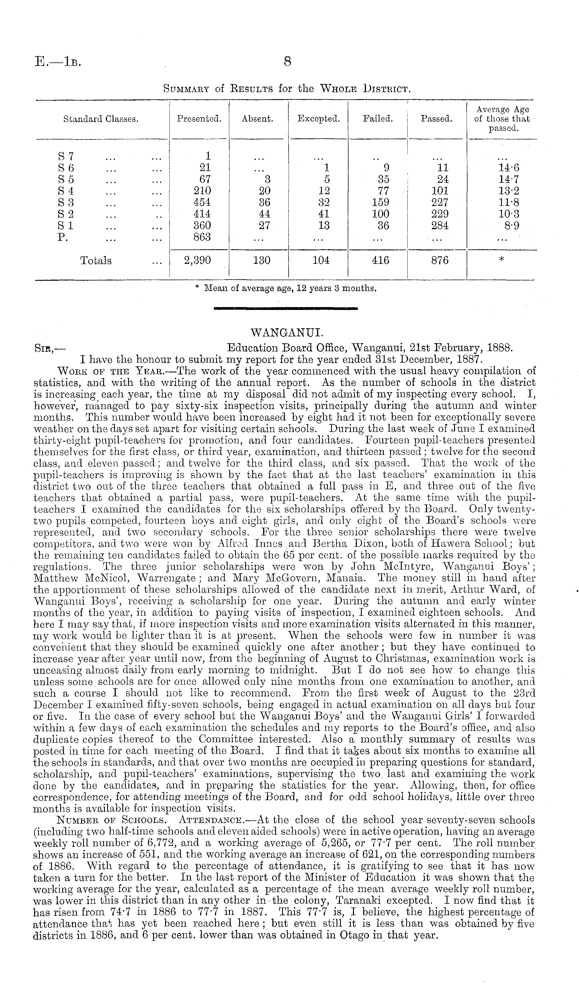 WANGANUI. Sir, — Education Board Office, Wanganui, 21st February, 1888. I have the honour to submit my report for the year ended 31st December, 1887. Work op the Year.—The work of the year commenced with the usual heavy compilation of statistics, and with the writing of the annual report. As the number of schools in the district is increasing each year, the time at my disposal did not admit of my inspecting every school. I, however, managed to pay sixty-six inspection visits, principally during the autumn and winter months. This number would have been increased by eight had it not been for exceptionally severe weather on the days set apart for visiting certain schools. During the last week of June I examined thirty-eight pupil-teachers for promotion, and four candidates. Fourteen pupil-teachers presented themselves for the first class, or third year, examination, and thirteen passed; twelve for the second class, and eleven passed; and twelve for the third class, and six passed. That the work of the pupil-teachers is improving is shown by the fact that at the last teachers' examination in this district two out of the three teachers that obtained a full pass in E, and three out of the five teachers that obtained a partial pass, were pupil-teachers. At the same time with the pupilteachers I examined the candidates for the six scholarships offered by the Board. Only twentytwo pupils competed, fourteen boys and eight girls, and only eight of the Board's schools were represented, and two secondary schools. For the three senior scholarships there were twelve competitors, and two were won by Alfred Innes and Bertha Dixon, both of Hawera School,; but the remaining ten candidates failed to obtain the 65 per cent, of the possible marks required by the regulations. The three junior scholarships were won by John Mclntyre, Wanganui Boys'; Matthew McNicol, Warrengate ; and Mary McGovern, Manaia. The money still in hand after the apportionment of these scholarships allowed of the candidate next in merit, Arthur Ward, of Wanganui Boys', receiving a scholarship for one year. During the autumn and early winter months of the year, in addition to paying visits of inspection, I examined eighteen schools. And here I may say that, if more inspection visits and more examination visits alternated in this manner, my work would be lighter than it is at present. When the schools were few in number it was convenient that they should be examined quickly one after another ; but they have continued to increase year after year until now, from the beginning of August to Christmas, examination work is unceasing almost daily from early morning to midnight. But I do not see how to change this unless some schools are for once allowed only nine months from one examination to another, and such a course I should not like to recommend. From the first week of August to the 23rd December I examined fifty-seven schools, being engaged in actual examination on all days but four or five. In the case of every school but the Wanganui Boys' and the Wanganui Girls' I forwarded within a few days of each examination the schedules and my reports to the Board's office, and also duplicate copies thereof to the Committee interested. Also a monthly summary of results was posted in time for each meeting of the Board. I find that it takes about six months to examine all the schools in standards, and that over two months are occupied in preparing questions for standard, scholarship, and pupil-teachers' examinations, supervising the two. last and examining the work done by the candidates, and in preparing the statistics for the year. Allowing, then, for office correspondence, for attending meetings of the Board, and for odd school holidays, little over three months is available for inspection visits. Number of Schools. Attendance. —At the close of the school year seventy-seven schools (including two half-time schools and eleven aided schools) were in active operation, having an average weekly roll number of 6,772, and a working average of 5,265, or 77'7 per cent. The roll number shows an increase of 551, and the working average an increase of 621, on the corresponding numbers of 1886. With regard to the percentage of attendance, it is gratifying to see that it has now taken a turn for the better. In the last report of the Minister of Education it was shown that the working average for the year, calculated as a percentage of the mean average weekly roll number, was lower in this district than in any other in the colony, Taranaki excepted. I now find that it has risen from 74-7 in 1886 to 77'7 in 1887. This 77'7 is, I believe, the highest percentage of attendance that has yet been reached here; but even still it is less than was obtained by five districts in 1886, and 6 per cent, lower than was obtained in Otago in that year.