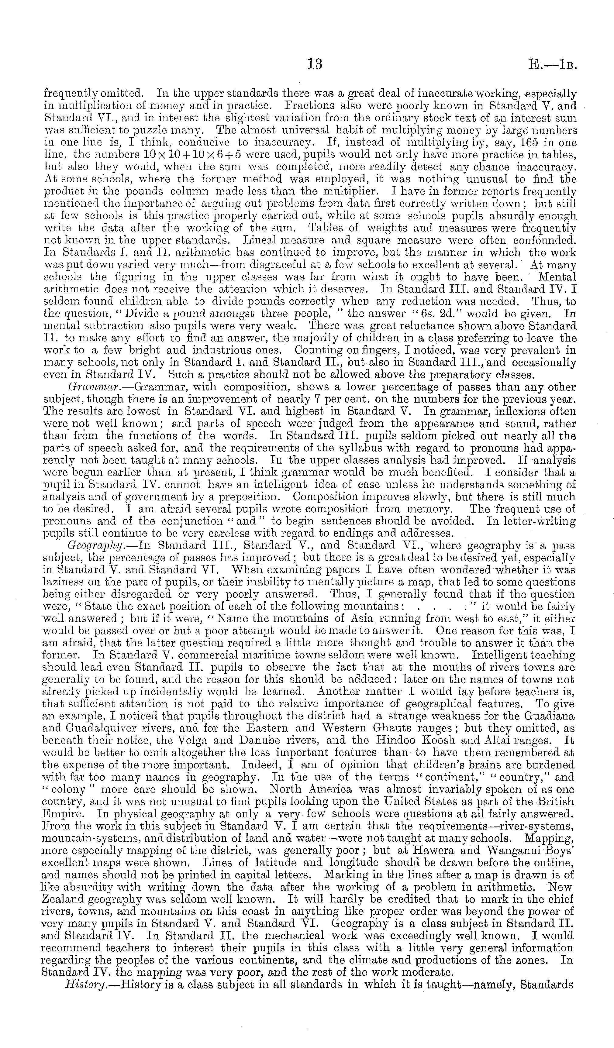 frequently omitted. In the upper standards there was a great deal of inaccurate working, especially in multiplication of money and in practice. Fractions also were poorly known in Standard V. and Standard VI., and in interest the slightest variation from the ordinary stock text of an interest sum was sufficient to puzzle many. The almost universal habit of multiplying money by large numbers in one line is, I think, conducive to inaccuracy. If, instead of multiplying by, say, 165 in one line, the numbers 10 xlO +10 x64- 5 were used, pupils would not only have more practice in tables, but also they would, when the sum was completed, more readily detect any chance inaccuracy. At some schools, where the former method was employed, it was nothing unusual to find the product in the pounds column made less than the multiplier. I have in former reports frequently mentioned the importance of arguing out problems from data first correctly written down ; but still at few schools is this practice properly carried out, while at some schools pupils absurdly enough write the data after the working of the sum. Tables of weights and measures were frequently not known in the upper standards. Lineal measure and square measure were often confounded. In Standards I. and 11. arithmetic has continued to improve, but the manner in which the work was put down varied very much—from disgraceful at a few schools to excellent at several.' At many schools the figuring in the upper classes was far from what it ought to have been. Mental arithmetic does not receive the attention which it deserves. In Standard 111. and Standard IV. I seldom found children able to divide pounds correctly when any reduction was needed. Thus, to the question, " Divide a pound amongst three people, " the answer " 6s. 2d." would be given. In mental subtraction also pupils were very weak. There was great reluctance shown above Standard 11. to make any effort to find an answer, the majority of children in a class preferring to leave the work to a few bright and industrious ones. Counting on fingers, I noticed, was very prevalent in many schools, not only in Standard I. and Standard IE, but also in Standard 111., and occasionally even in Standard IV. Such a practice should not be allowed above the preparatory classes. Grammar. —Grammar, with composition, shows a lower percentage of passes than any other subject, though there is an improvement of nearly 7 per cent, on the numbers for the previous year. The results are lowest in Standard VI. and highest in Standard V. In grammar, inflexions often were not well known; and parts of speech were judged from the appearance and sound, rather than from the functions of the words. In Standard 111. pupils seldom picked out nearly all the parts of speech asked for, and the requirements of the syllabus with regard to pronouns had apparently not been taught at many schools. In the upper classes analysis had improved. If analysis were begun earlier than at present, I think grammar would be much benefited. I consider that a pupil in Standard IV. cannot have an intelligent idea of case unless he understands something of analysis and of government by a preposition. Composition improves slowly, but there is still much to be desired. lam afraid several pupils wrote composition from memory. The frequent use of pronouns and of the conjunction " and " to begin sentences should be avoided. In letter-writing pupils still continue to be very careless with regard to endings and addresses. Geography. —In Standard HE, Standard V., and Standard VI., where geography is a pass subject, the percentage of passes has improved; but there is a great deal to be desired yet, especially in Standard V. and Standard VI. When examining papers I have often wondered whether it was laziness on the part of pupils, or their inability to mentally picture a map, that led to some questions being either disregarded or very poorly answered. Thus, I generally found that if the question were, " State the exact position of each of the following mountains : . . . . "it would be fairly well answered ; but if it were, " Name the mountains of x\sia running from west to east," it either would be passed over or but a poor attempt would be made to answer it. One reason for this was, I am afraid, that the latter question required a little more thought and trouble to answer it than the former. In Standard V. commercial maritime towns seldom were well known. Intelligent teachingshould lead even Standard 11. pupils to observe the fact that at the mouths of rivers towns are generally to be found, and the reason for this should be adduced : later on the names of towns not already picked up incidentally would be learned. Another matter I would lay before teachers is, that sufficient attention is not paid to tho relative importance of geographical features. To give an example, I noticed that pupils throughout the district had a strange weakness for the Guadiana and Guadalquiver rivers, and for the Eastern and Western Ghauts ranges ; but they omitted, as beneath their notice, the Volga and Danube rivers, and the Hindoo Koosh and Altai ranges. It would be better to omit altogether the less important features than to have them remembered at the expense of the more important. Indeed, I am of opinion that children's brains are burdened with far too many names in geography. In the use of the terms " continent," " country," and " colony " more care should be shown. North America was almost invariably spoken of as one country, and it was not unusual to find pupils looking upon the United States as part of the British Empire. In physical geography at only a very few schools were questions at all fairly answered. From the work in this subject in Standard V. I am certain that the requirements—river-systems, mountain-systems, and distribution of land and water—were not taught at many schools. Mapping, more especially mapping of the district, was generally poor ; but