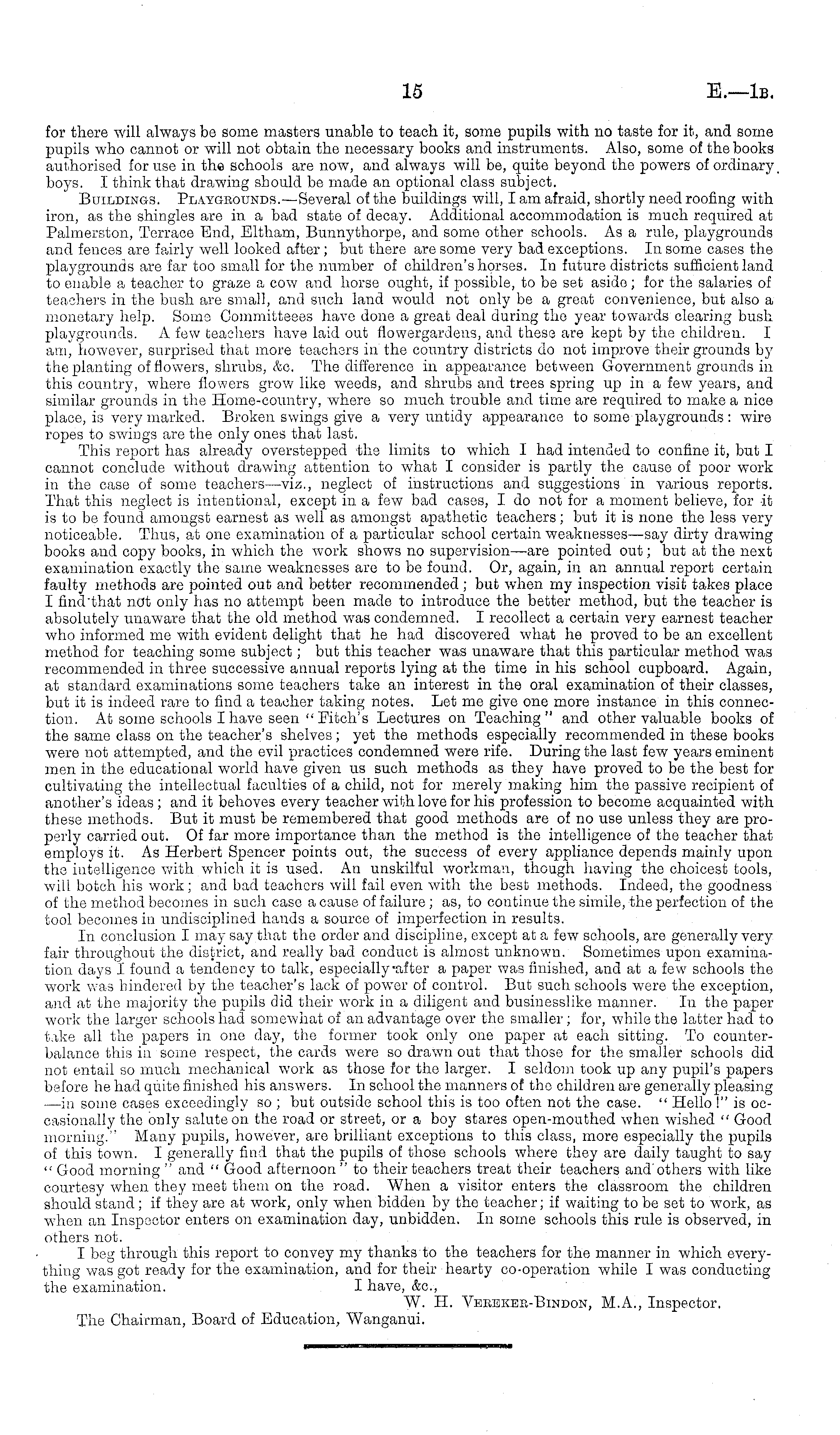 for there will always be some masters unable to teach it, some pupils with no taste for it, and some pupils who cannot or will not obtain the necessary books and instruments. Also, some of the books authorised for use in the schools are now, and always will be, quite beyond the powers of ordinary boys. I think that drawing should be made an optional class subject. Buildings. Playg-bounds.—Several of the buildings will, lam afraid, shortly need roofing with iron, as the shingles are in a bad state of decay. Additional accommodation is much required at Palmerston, Terrace End, Eltham, Bunnythorpe, a,nd some other schools. As a rule, playgrounds and fences are fairly well looked after ; but there are some very bad exceptions. In some cases the playgrounds are far too small for the number of children's horses. In future districts sufficient land to enable a teacher to graze a cow and horse ought, if possible, to be set aside; for the salaries of teachers in the bush are small, and such land would not only be a great convenience, but also a monetary help. Some Oommitteees have done a great deal during the year towards clearing bush playgrounds. A few teachers have laid out fiowergardens, and these are kept by the children. I am, however, surprised that more teachers in the country districts do not improve their grounds by the planting of flowers, shrubs, &c. The difference in appearance between Government grounds in this country, where flowers grow like weeds, and shrubs and trees spring up in a few years, and similar grounds in the Home-country, where so much trouble and time are required to make a nice place, is very marked. Broken swings give a very untidy appearance to some playgrounds : wire ropes to swings are the only ones that last. This report has already overstepped the limits to which I had intended to confine it, but I cannot conclude without drawing attention to what I consider is partly the cause of poor work in the case of some teachers—viz., neglect of instructions and suggestions in various reports. That this neglect is intentional, except in a few bad cases, I do not for a moment believe, for it is to be found amongst earnest as well as amongst apathetic teachers ; but it is none the less very noticeable. Thus, at one examination of a particular school certain weaknesses—say dirty drawing books and copy books, in which the work shows no supervision—are pointed out; but at the next examination exactly the same weaknesses are to be found. Or, again, in an annual report certain faulty methods are pointed out and better recommended ; but when my inspection visit takes place I find'that not only has no attempt been made to introduce the better method, but the teacher is absolutely unaware that the old method was condemned. I recollect a certain very earnest teacher who informed me with evident delight that he had discovered what he proved to be an excellent method for teaching some subject; but this teacher was unaware that this particular method was recommended in three successive annual reports lying at the time in his school cupboard. Again, at standard examinations some teachers take an interest in the oral examination of their classes, but it is indeed rare to find a teacher taking notes. Let me give one more instance in this connection. At some schools I have seen " Pitch's Lectures on Teaching" and other valuable books of the same class on the teacher's shelves ; yet the methods especially recommended in these books were not attempted, and the evil practices condemned were rife. During the last few years eminent men in the educational world have given us such methods as they have proved to be the best for cultivating the intellectual faculties of a child, not for merely making him the passive recipient of another's ideas ; and it behoves every teacher with love for his profession to become acquainted with these methods. But it must be remembered that good methods are of no use unless they are properly carried out. Of far more importance than the method is the intelligence of the teacher that employs it. As Herbert Spencer points out, the success of every appliance depends mainly upon the intelligence with which it is used. An unskilful workman, though having the choicest tools, will botch his work; and bad teachers will fail even with the best methods. Indeed, the goodness of the method becomes in such case a cause of failure ; as, to continue the simile, the perfection of the tool becomes in undisciplined hands a source of imperfection in results. In conclusion I may say that the order and discipline, except at a few schools, are generally very fair throughout the district, and really bad conduct is almost unknown. Sometimes upon examination days I found a tendency to talk, especially-after a paper was finished, and at a few schools the work was hindered by the teacher's lack of power of control. But such schools were the exception, and at the majority the pupils did their work in a diligent and businesslike manner. In the paper work the larger schools had somewhat of an advantage over the smaller ; for, while the latter had to take all the papers in one day, the former took only one paper at each sitting. To counterbalance this in some respect, the cards were so drawn out that those for the smaller schools did not entail so much mechanical work as those for the larger. I seldom took up any pupil's papers before he had quite finished his answers. In school the manners of the children are generally pleasing —in some cases exceedingly so ; but outside school this is too often not the case. " Hello !" is occasionally the only salute on the road or street, or a boy stares open-mouthed when wished " Good morning." Many pupils, however, are brilliant exceptions to this class, more especially the pupils of this town. I generally find that the pupils of those schools where they are daily taught to say " Good morning " and " Good afternoon" to their teachers treat their 