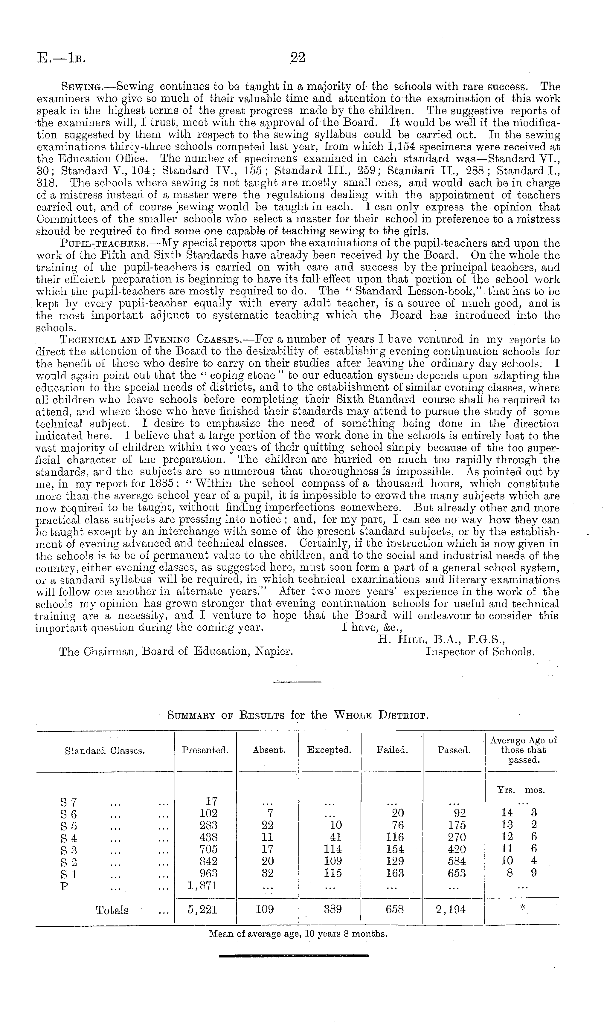 Sewing.—Sewing continues to be taught in a majority of the schools with rare success. The examiners who give so much of their valuable time and attention to the examination of this work speak in the highest terms of the great progress made by the children. The suggestive reports of the examiners will, I trust, meet with the approval of the Board. It would be well if the modification suggested by them with respect to the sewing syllabus could be carried out. In the sewing examinations thirty-three schools competed last year, from which 1,154 specimens were received at the Education Office. The number of specimens examined in each standard was—Standard VI., 30; Standard V., 104; Standard IV., 155; Standard 111., 259; Standard 11., 288; Standard 1., 318. The schools where sewing is not taught are mostly small ones, and would each be in charge of a mistress instead of a master were the regulations dealing with the appointment of teachers carried out, and of course [sewing would be taught in each. I can only express the opinion that Committees of the smaller schools who select a master for their school in preference to a mistress should be required to find some one capable of teaching sewing to the girls. Pupil-teachers.—My special reports upon the examinations of the pupil-teachers and upon the work of the Fifth and Sixth Standards have already been received by the Board. On the whole the training of the pupil-teachers is carried on with care and success by the principal teachers, and their efficient preparation is beginning to have its full effect upon that portion of the school work which the pupil-teachers are mostly required to do. The " Standard Lesson-book," that has to be kept by every pupil-teacher equally with every adult teacher, is a source of much good, and is the most important adjunct to systematic teaching which the Board has introduced into the schools. Technical and Evening Classes.—For a number of years I have ventured in my reports to direct the attention of the Board to the desirability of establishing evening continuation schools for the benefit of those who desire to carry on their studies after leaving the ordinary day schools. I would again point out that the " coping stone " to our education system depends upon adapting the education to the special needs of districts, and to the establishment of similar evening classes, where all children who leave schools before completing their Sixth Standard course shall be required to attend, and where those who have finished their standards may attend to pursue the study of some technical subject. I desire to emphasize the need of something being done in the direction indicated here. I believe that a large portion of the work done in the schools is entirely lost to the vast majority of children within two years of their quitting school simply because of the too superficial character of the preparation. The children are hurried on much too rapidly through the standards, and the subjects are so numerous that thoroughness is impossible. As pointed out by me, in my report for 1885 : " Within the school compass of a thousand hours, which constitute more than the average school year of a pupil, it is impossible to crowd the many subjects which are now required to be taught, without finding imperfections somewhere. But already other and more practical class subjects are pressing into notice ; and, for my part, I can see no way how they can be taught except by an interchange with some of the present standard subjects, or by the establishment of evening advanced and technical classes. Certainly, if the instruction which is now given in the schools is to be of permanent value to the children, and to the social and industrial needs of the country, either evening classes, as suggested here, must soon form a part of a general school system, or a standard syllabus will be required, in which technical examinations and literary examinations will follow one another in alternate years." After two more years' experience in the work of the schools my opinion has grown stronger that evening continuation schools for useful and technical training are a necessity, and I venture to hope that the Board will endeavour to consider this important question during the coming year. I have, &c, H. Hill, 8.A., F.G.S., The Chairman, Board of Education, Napier. Inspector of Schools.