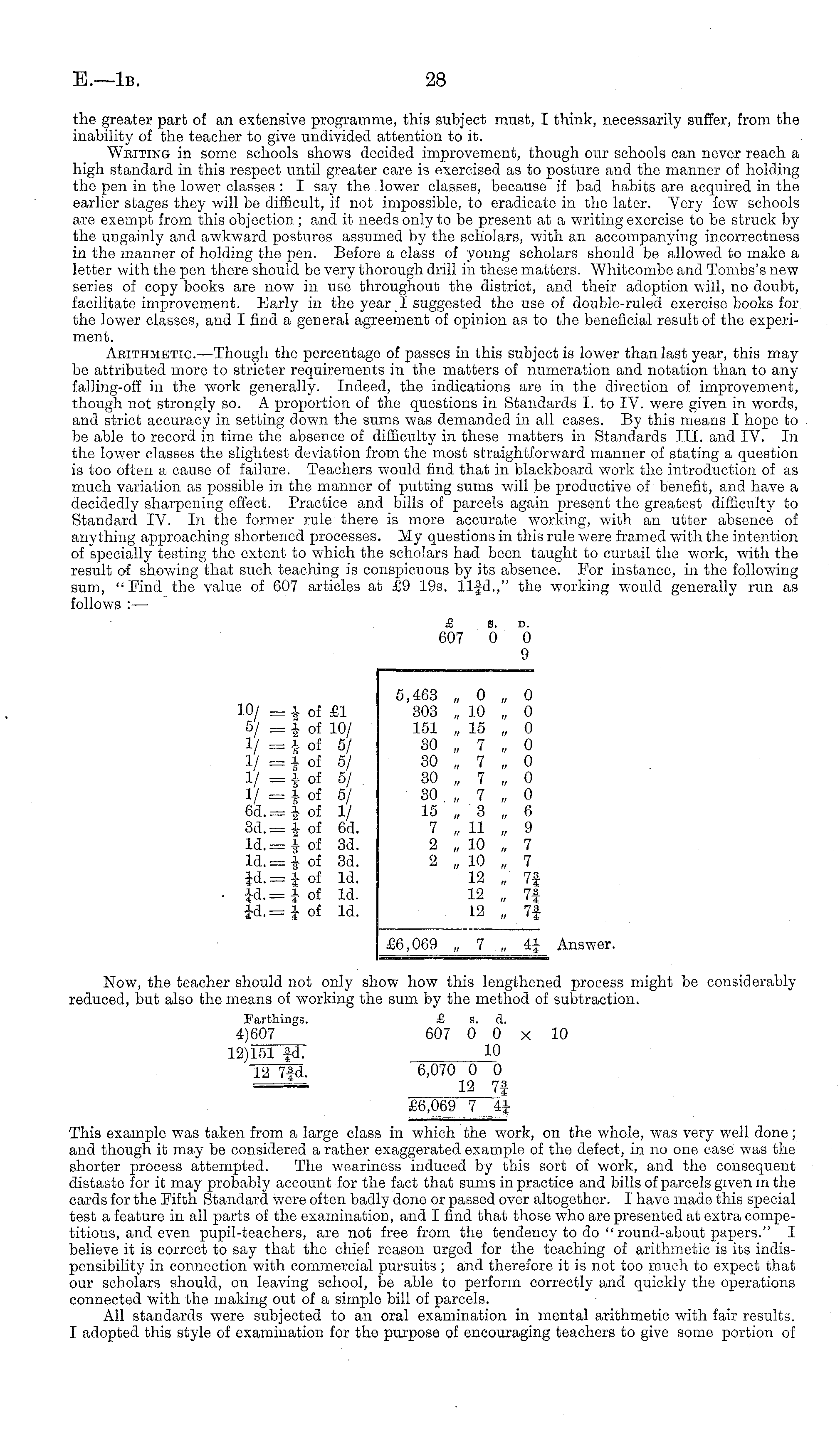 the greater part of an extensive programme, this subject must, I think, necessarily suffer, from the inability of the teacher to give undivided attention to it. Weiting in some schools shows decided improvement, though our schools can never reach a high standard in this respect until greater care is exercised as to posture and the manner of holding the pen in the lower classes : I say the lower classes, because if bad habits are acquired in the earlier stages they will be difficult, if not impossible, to eradicate in the later. Very few schools are exempt from this objection ; and it needs only to be present at a writing exercise to be struck by the ungainly and awkward postures assumed by the scholars, with an accompanying incorrectness in the manner of holding the pen. Before a class of young scholars should be allowed to make a letter with the pen there should be very thorough drill in these matters. Whitcombe and Tombs's new series of copy books are now in use throughout the district, and their adoption will, no doubt, facilitate improvement. Early in the year I suggested the use of double-ruled exercise books for the lower classes, and I find a general agreement of opinion as to the beneficial result of the experiment. Arithmetic. —Though the percentage of passes in this subject is lower than last year, this may be attributed more to stricter requirements in the matters of numeration and notation than to any falling-off in the work generally. Indeed, the indications are in the direction of improvement, though not strongly so. A proportion of the questions in Standards I. to IV. were given in words, and strict accuracy in setting down the sums was demanded in all cases. By this means I hope to be able to record in time the absence of difficulty in these matters in Standards 111. and IV. In the lower classes the slightest deviation from the most straightforward manner of stating a question is too often a cause of failure. Teachers would find that in blackboard work the introduction of as much variation as possible in the manner of putting sums will be productive of benefit, and have a decidedly sharpening effect. Practice and bills of parcels again present the greatest difficulty to Standard IV. In the former rule there is more accurate working, with an utter absence of anything approaching shortened processes. My questions in this rule were framed with the intention of specially testing the extent to which the scholars had been taught to curtail the work, with the result of showing that such teaching is conspicuous by its absence. For instance, in the following sum, " Find the value of 607 articles at £9 19s. 11fd.," the working would generally run as follows :— £ S. D. 607 0 0 9 5,463 „ 0 „ 0 10/ = i of £1 303 „ 10 „ 0 5/ = \ of 10/ 151 „ 15 „ 0 1/ =| of 5/ 30 „ 7 „ 0 1/ =| of 5/ 30 „ 7 „ 0 1/ = i of 5/ 30 „ 7 „ 0 1/ =i of 5/ 30 „ 7 „ 0 6d. = | of 1/ 15 „' 3 „ 6 3d.= iof 6d. 7 „ 11 „ 9 ld.= i of 3d. 2 „ 10 „ 7 Id. = \ of 3d. 2 „ 10 „ 7 id.= iof Id. 12 „ 7f ■ id. = I of Id. 12 „ 7f |d.= ■£ of Id. 12 „ 7f £6,069 „ 7 .„ 4j- Answer. Now, the teacher should not only show how this lengthened process might be considerably reduced, but also the means of working the sum by the method of subtraction. Farthings. £ s. d. 4)607 607 0 0 x 10 12)151 fd. 10 12 7M. 6,070 0 0 4 — II) 73 £6,069 7 ijThis example was taken from a large class in which the work, on the whole, was very well done; and though it may be considered a rather exaggerated example of the defect, in no one case was the shorter process attempted. The weariness induced by this sort of work, and the consequent distaste for it may probably account for the fact that sums in practice and bills of parcels given m the cards for the Fifth Standard were often badly done or passed over altogether. I have made this special test a feature in all parts of the examination, and I find that those who are presented at extra competitions, and even pupil-teachers, are not free from the tendency to do " round-about papers." I believe it is correct to say that the chief reason urged for the teaching of arithmetic is its indispensibility in connection with commercial pursuits ; and therefore it is not too much to expect that our scholars should, on leaving school, be able to perform correctly and quickly the operations connected with the making out of a simple bill of parcels. All standards were subjected to an oral examination in mental arithmetic with fair results. I adopted this style of examination for the purpose of encouraging teachers to give some portion of