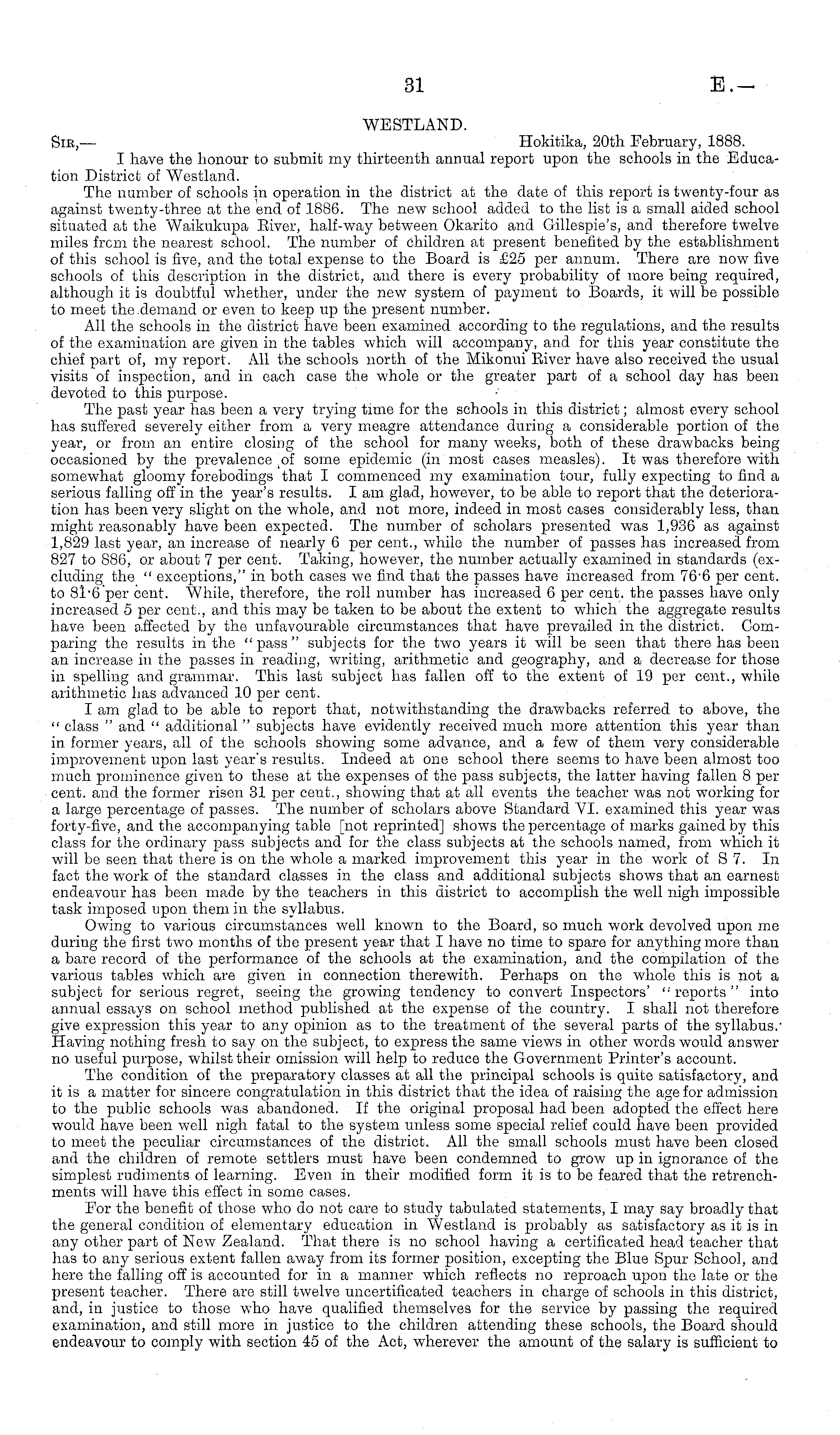 WESTLAND. Sib,— Hokitika, 20th February, 1888. I have the honour to submit my thirteenth annual report upon the schools in the Education District of Westland. The number of schools in operation in the district at the date of this report is twenty-four as against twenty-three at the end of 1886. The new school added to the list is a small aided school situated at the Waikukupa Eiver, half-way between Okarito and Gillespie's, and therefore twelve miles from the nearest school. The number of children at present benefited by the establishment of this school is five, and the total expense to the Board is £25 per annum. There are now five schools of this description in the district, and there is every probability of more being required, although it is doubtful whether, under the new system of payment to Boards, it will be possible to meet the demand or even to keep up the present number. All the schools in the district have been examined according to the regulations, and the results of the examination are given in the tables which will accompany, and for this year constitute the chief part of, my report. All the schools north of the Mikonui Eiver have also received the usual visits of inspection, and in each case the whole or the greater part of a school day has been devoted to this purpose. The past year has been a very trying time for the schools in this district; almost every school has suffered severely either from a very meagre attendance during a considerable portion of the year, or from an entire closing of the school for many weeks, both of these drawbacks being occasioned by the prevalence .of some epidemic (in most cases measles). It was therefore with somewhat gloomy forebodings that I commenced my examination tour, fully expecting to find a serious falling off in the year's results. lam glad, however, to be able to report that the deterioration has been very slight on the whole, and not more, indeed in most cases considerably less, than might reasonably have been expected. The number of scholars presented was 1,936 as against 1,829 last year, an increase of nearly 6 per cent., while the number of passes has increased from 827 to 886, or about 7 per cent. Taking, however, the number actually examined in standards (excluding the " exceptions," in both cases we find that the passes have increased from 76'6 per cent, to 81'6 per cent. "While, therefore, the roll number has increased 6 per cent, the passes have only increased 5 per cent., and this may be taken to be about the extent to which the aggregate results have been affected by the unfavourable circumstances that have prevailed in the district. Cornparing the results in the " pass " subjects for the two years it will be seen that there has been an increase in the passes in reading, writing, arithmetic and geography, and a decrease for those in spelling and grammar. This last subject has fallen off to the extent of 19 per cent., while arithmetic has advanced 10 per cent. I am glad to be able to report that, notwithstanding the drawbacks referred to above, the " class " and " additional " subjects have evidently received much more attention this year than in former years, all of the schools showing some advance, and a few of them very considerable improvement upon last year's results. Indeed at one school there seems to have been almost too much prominence given to these at the expenses of the pass subjects, the latter having fallen 8 per cent, and the former risen 31 per cent., showing that at all events the teacher was not working for a large percentage of passes. The number of scholars above Standard VI. examined this year was forty-five, and the accompanying table [not reprinted] shows the percentage of marks gained by this class for the ordinary pass subjects and for the class subjects at the schools named, from which it will be seen that there is on the whole a marked improvement this year in the work of S7. In fact the work of the standard classes in the class and additional subjects shows that an earnest endeavour has been made by the teachers in this district to accomplish the well nigh impossible task imposed upon them in the syllabus. Owing to various circumstances well known to the Board, so much work devolved upon me during the first two months of the present year that I have no time to spare for anything more than a bare record of the performance of the schools at the examination, and the compilation of the various tables which are given in connection therewith. Perhaps on the whole this is not a subject for serious regret, seeing the growing tendency to convert Inspectors' "reports" into annual essays on school method published at the expense of the country. I shall not therefore give expression this year to any opinion as to the treatment of the several parts of the syllabus.' Having nothing fresh to say on the subject, to express the same views in other words would answer no useful purpose, whilst their omission will help to reduce the Government Printer's account. The condition of the preparatory classes at all the principal schools is quite satisfactory, and it is a matter for sincere congratulation in this district that the idea of raising the age for admission to the public schools was abandoned. If the original proposal had been adopted, the effect here would have been well nigh fatal to the system unless some special relief could have been provided to meet the peculiar circumstances of the district. All the small schools must have been closed and the children of remote settlers must have been condemned to grow tip in ignorance of the simplest rudiments of learning. Even in their modified form it is to be feared that the retrenchments will have this effect in some cases. Eor the benefit of those who do not care to study tabulated statements, I may say broadly that the general condition of elementary education in Westland is probably as satisfactory as it is in any other part of New Zealand. That there is no
