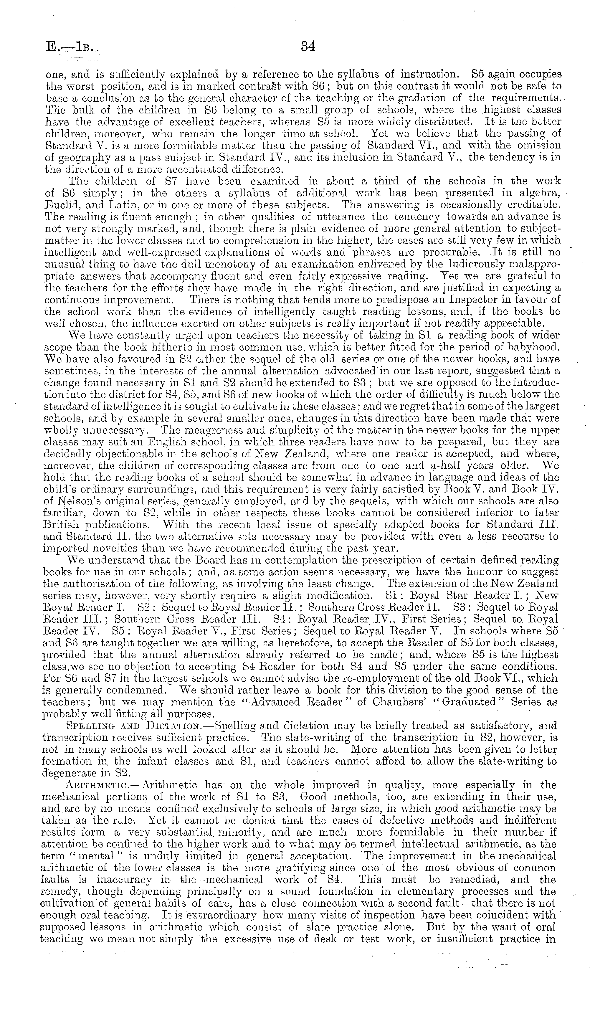 one, and is sufficiently explained by a reference to the syllabus of instruction. So again occupies the worst position, and is in marked contrast with S6; but on this contrast it would not be safe to base a conclusion as to the general character of the teaching or the gradation of the requirements. The bulk of the children in S6 belong to a small group of schools, where the highest classes have the advantage of excellent teachers, whereas S5 is more widely distributed. It is the better children, moreover, who remain the longer time at school. Yet we believe that the passing of Standard V. is a more formidable matter than the passing of Standard VI., and with the omission of geography as a pass subject in Standard IV., and its inclusion in Standard V., the tendency is in the direction of a more accentuated difference. The children of S7 have been examined in about a third of the schools in the work of S6 simply; in the others a syllabus of additional work has been presented in algebra, Euclid, and Latin, or in one or more of these subjects. The answering is occasionally creditable. The reading is fluent enough ; in other qualities of utterance the tendency towards an advance is not very strongly marked, and, though there is plain evidence of more general attention to subjectmatter in the lower classes and to comprehension in the higher, the cases are still very few in which intelligent and well-expressed explanations of words and phrases are procurable. It is still no unusual thing to have the dull monotony of an examination enlivened by the ludicrously malappropriate answers that accompany fluent and even fairly expressive reading. Yet we are grateful to the teachers for the efforts they have made in the right direction, and are justified in expecting a continuous improvement. There is nothing that tends more to predispose an Inspector in favour of the school work than the evidence of intelligently taught reading lessons, and, if the books be well chosen, the influence exerted on other subjects is really important if not readily appreciable. "We have constantly urged upon teachers the necessity of taking in SI a reading book of wider scope than the book hitherto in most common use, which is better fitted for the period of babyhood. We have also favoured in S2 cither the sequel of the old series or one of the newer books, and have sometimes, in the interests of the annual alternation advocated in our last report, suggested that a change found necessary in SI and S2 should be extended to S3 ; but we are opposed to the introduction into the district for S4-, S5, and S6 of new books of which the order of difficulty is much below the standard of intelligence it is sought to cultivate in these classes; and we regret that in some of the largest schools, and by example in several smaller ones, changes in this direction have been made that were wholly unnecessary. The meagreness and simplicity of the matter in the newer books for the upper classes may suit an English school, in which three readers have now to be prepared, but they are decidedly objectionable in the schools of New Zealand, where one reader is accepted, and where, moreover, the children of corresponding classes are from one to one and a-half years older. We hold that the reading books of a school should be somewhat in advance in language and ideas of the child's ordinary surroundings, and this requirement is very fairly satisfied by Book V. and Book IV. of Nelson's original series, generally employed, and by the sequels, with which our schools are also familiar, down to S2, while in other respects these books cannot be considered inferior to later British publications. With the recent local issue of specially adapted books for Standard 111. and Standard 11. the two alternative sets necessary may be provided with even a less recourse to imported novelties than we have recommended during the past year. Wo understand that the Board has in contemplation the prescription of certain defined reading books for use in our schools; and, as some action seems necessary, we have the honour to suggest the authorisation of the following, as involving the least change. The extension of the New Zealand series may, however, very shortly require a slight modification. SI: Boyal Star Beader I. ; New Eoyal Eeader I. S2 : Sequel to Eoyal Eeader II.; Southern Cross Eeader 11. S3 : Sequel to Eoyal Eeader III.; Southern Cross Eeader 111. S4 : Eoyal Eeader IV., First Series; Sequel to Eoyal Eeader IV. So : Eoyal Eeader V., First Series; Sequel to Eoyal Eeader V. In schools where S5 and S6 are taught together we are willing, as heretofore, to accept the Eeader of So for both classes, provided that the annual alternation already referred to be made; and, where S5 is the highest class,we see no objection to accepting S4 Eeader for both S4 and So under the same conditions. Eor S6 and S7 in the largest schools we cannot advise the re-employment of the old Book VI., which is generally condemned. W Te should rather leave a book for this division to the good sense of the teachers; but we may mention the "Advanced Eeader" of Chambers' "Graduated" Series as probably well fitting all purposes. Spelling and Dictation. —Spelling and dictation may be briefly treated as satisfactory, and transcription receives sufficient practice. The slate-writing of the transcription in S2, however, is not in many schools as well looked after as it should be. More attention has been given to letter formation in the infant classes and SI, and teachers cannot afford to allow the slate-writing to degenerate in S2. Arithmetic.—Arithmetic has on the whole improved in quality, more especially in the mechanical portions of the work of SI to S3. Good methods, too, are extending in their use, and are by no means confined exclusively to schools of large size, in which good arithmetic may be taken as the rule. Yet it cannot be denied that the cases of defective methods and indifferent results 
