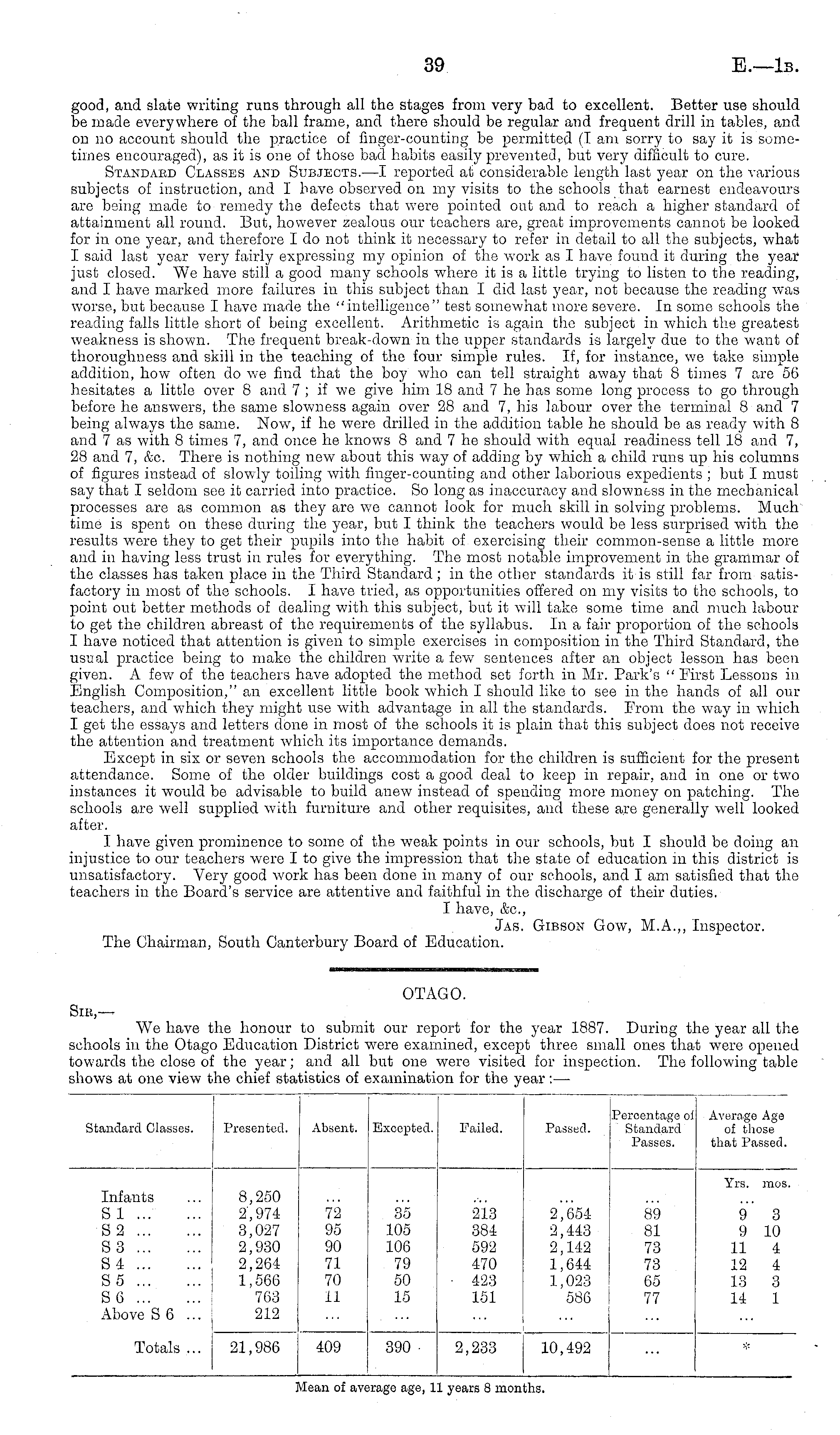 OTAGO. Sib,— We have the honour to submit our report for the year 1887. During the year all the schools in the Otago Education District were examined, except three small ones that were opened towards the close of the year; and all but one were visited for inspection. The following table shows at one view the chief statistics of examination for the year:—