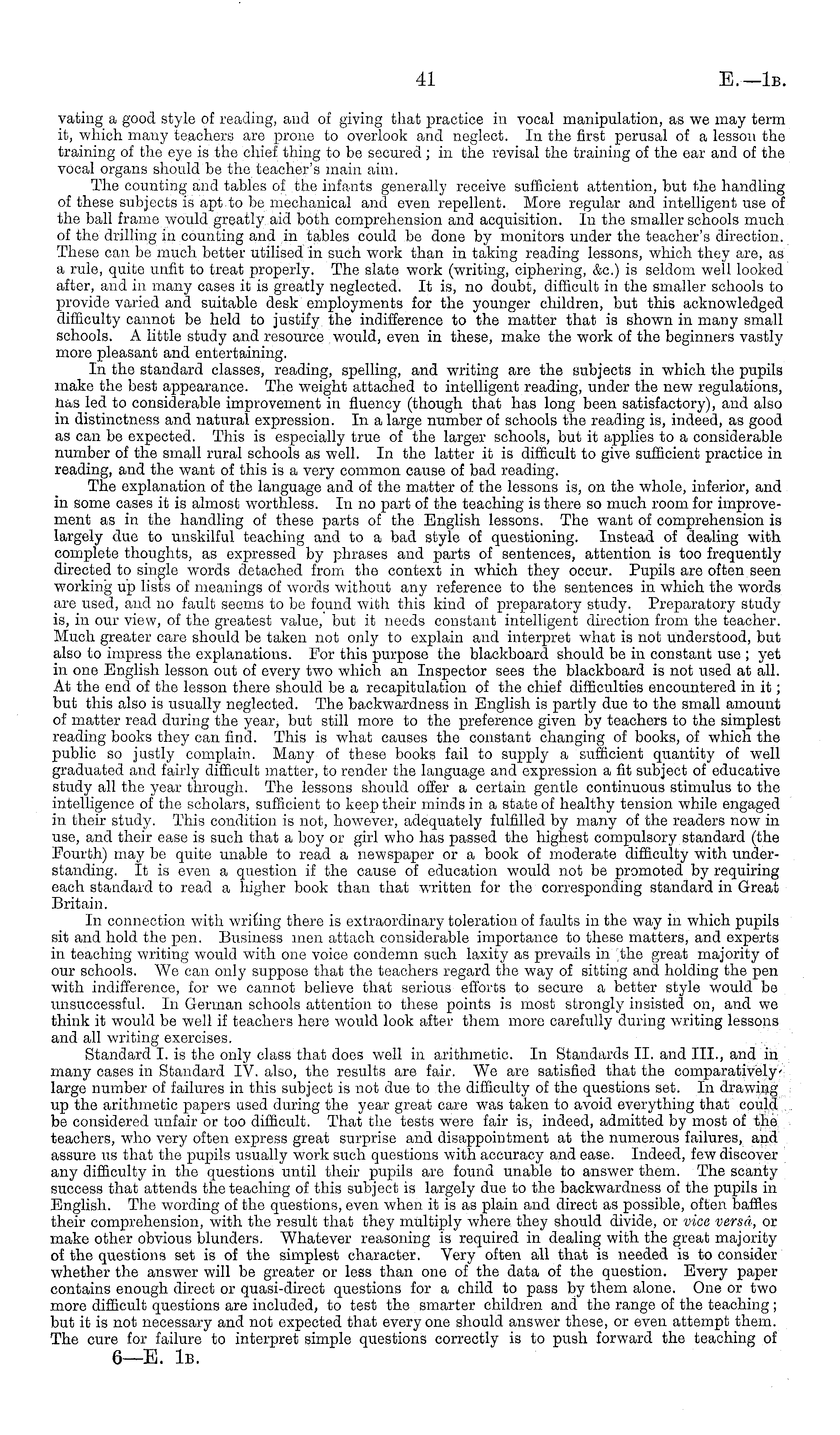 vating a good style of reading, and of giving that practice in vocal manipulation, as we may term it, which many teachers are prone to overlook and neglect. In the first perusal of a lesson the training of the eye is the chief thing to be secured; in the revisal the training of the ear and of the vocal organs should be the teacher's main aim. The counting and tables of the infants generally receive sufficient attention, but the handling of these subjects is apt to be mechanical and even repellent. More regular and intelligent use of the ball frame would greatly aid both comprehension and acquisition. In the smaller schools much of the drilling in counting and in tables could be done by monitors under the teacher's direction. These can be much better utilised in such work than in taking reading lessons, which they are, as a rule, quite unfit to treat properly. The slate work (writing, ciphering, &c.) is seldom well looked after, and in many cases it is greatly neglected. It is, no doubt, difficult in the smaller schools to provide varied and suitable desk employments for the younger children, but this acknowledged difficulty cannot be held to justify the indifference to the matter that is shown in many small schools. A little study and resource would, even in these, make the work of the beginners vastly more pleasant and entertaining. In the standard classes, reading, spelling, and writing are the subjects in which the pupils make the best appearance. The weight attached to intelligent reading, under the new regulations, nas led to considerable improvement in fluency (though that has long been satisfactory), and also in distinctness and natural expression. In a large number of schools the reading is, indeed, as good as can be expected. This is especially true of the larger schools, but it applies to a considerable number of the small rural schools as well. In the latter it is difficult to give sufficient practice in reading, and the want of this is a very common cause of bad reading. The explanation of the language and of the matter of the lessons is, on the whole, inferior, and in some cases it is almost worthless. In no part of the teaching is there so much room for improvement as in the handling of these parts of the English lessons. The want of comprehension is largely due to unskilful teaching and to a bad style of questioning. Instead of dealing with complete thoughts, as expressed by phrases and parts of sentences, attention is too frequently directed to single words detached from the context in which they occur. Pupils are often seen working up lists of meanings of words without any reference to the sentences in which the words are used, and no fault seems to be found with this kind of preparatory study. Preparatory study is, in our view, of the greatest value, but it needs constant intelligent direction from the teacher. Much greater care should be taken not only to explain and interpret what is not understood, but also to impress the explanations. For this purpose the blackboard should be in constant use ; yet in one English lesson out of every two which an Inspector sees the blackboard is not used at all. At the end of the lesson there should be a recapitulation of the chief difficulties encountered in it; but this also is usually neglected. The backwardness in English is partly due to the small amount of matter read during the year, but still more to the preference given by teachers to the simplest reading books they can find. This is what causes the constant changing of books, of which the public so justly complain. Many of these books fail to supply a sufficient quantity of well graduated and fairly difficult matter, to render the language and expression a fit subject of educative study all the year through. The lessons should offer a certain gentle continuous stimulus to the intelligence of the scholars, sufficient to keep their minds in a state of healthy tension while engaged in their study. This condition is not, however, adequately fulfilled by many of the readers now in use, and their ease is such that a boy or girl who has passed the highest compulsory standard (the Fourth) may be quite unable to read a newspaper or a book of moderate difficulty with understanding. It is even a question if the cause of education would not be promoted by requiring each standard to read a higher book than that written for the corresponding standard in Great Britain. In connection with writing there is extraordinary toleration of faults in the way in which pupils sit and hold the pen. Business men attach considerable importance to these matters, and experts in teaching writing would with one voice condemn such laxity as prevails in the great majority of our schools. We can only suppose that the teachers regard the way of sitting and holding the pen with indifference, for we cannot believe that serious efforts to secure a better style would be unsuccessful. In German schools attention to these points is most strongly insisted on, and we think it would be well if teachers here would look after them more carefully during writing lessons and all writing exercises. Standard I. is the only class that does well in arithmetic. In Standards 11. and 111., and in many cases in Standard IV. also, the results are fair. We are satisfied that the comparativelylarge number of failures in this subject is not due to the difficulty of the questions set. In drawing up the arithmetic papers used during the year great care was taken to avoid everything that could be considered unfair or too difficult. That the tests were fair is, indeed, admitted by most of the teachers, who very often express great surprise and disappointment at the numerous failures, and assure us that the pupils usually work such questions with accuracy and ease. Indeed, few discover any difficulty in the questions until their pupils are found unable to answer them. The scanty success that attends the teaching of this subject is largely du