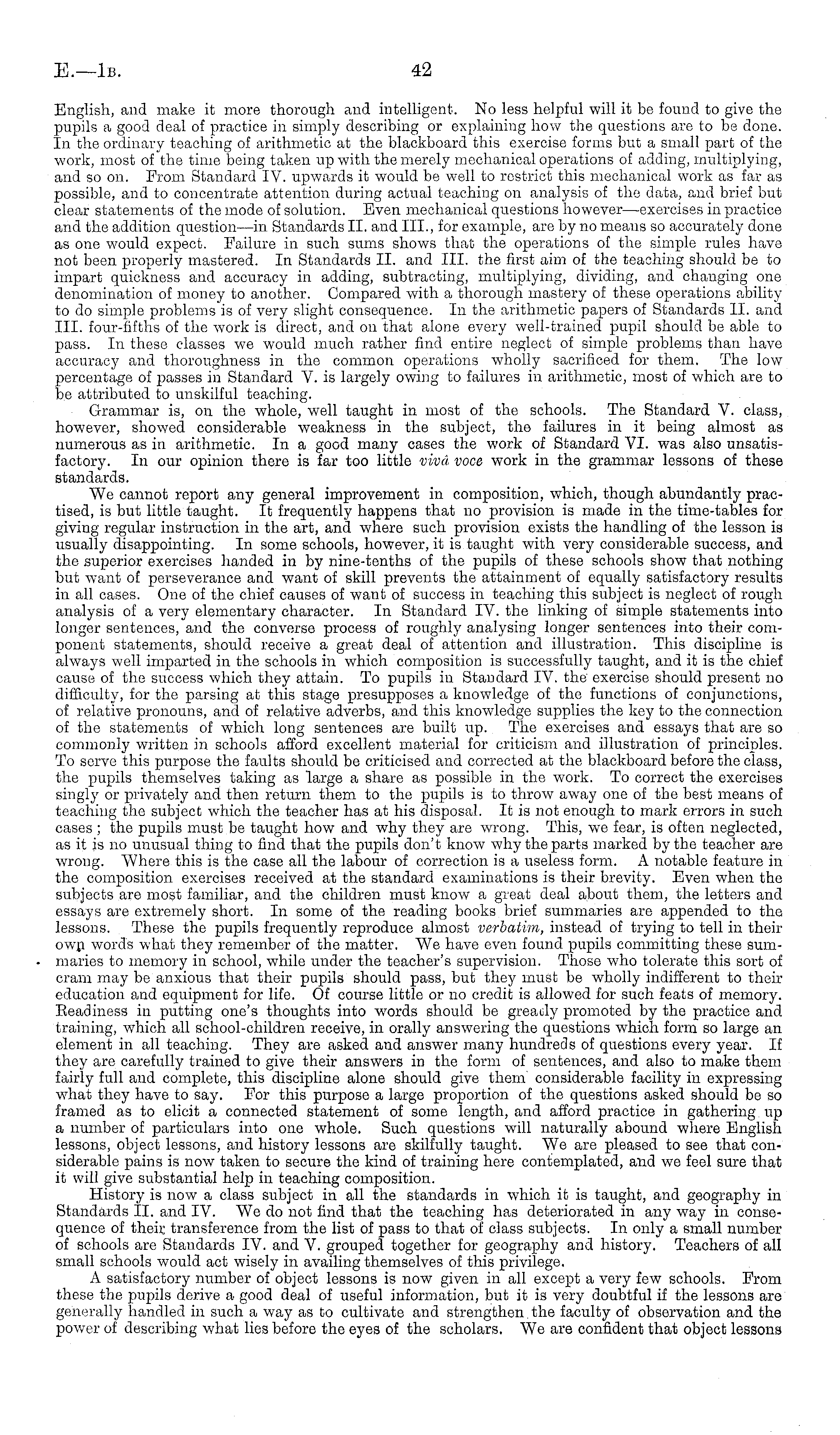 English, and make it more thorough and intelligent. No less helpful will it be found to give the pupils a good deal of practice in simply describing or explaining how the questions are to bo done. In the ordinary teaching of arithmetic at the blackboard this exercise forms but a small part of the work, most of the time being taken up with the merely mechanical operations of adding, multiplying, and so on. From Standard IV. upwards it would ba well to restrict this mechanical work as far as possible, and to concentrate attention during actual teaching on analysis of the data, and brief but clear statements of the mode of solution. Even mechanical questions however—exercises in practice and the addition question—in Standards 11. and 111., for example, are by no means so accurately done as one would expect. Failure in such sums shows that the operations of the simple rules have not been properly mastered. In Standards 11. and 111. the first aim of the teaching should be to impart quickness and accuracy in adding, subtracting, multiplying, dividing, and changing one denomination of money to another. Compared with a thorough mastery of these operations ability to do simple problems is of very slight consequence. In the arithmetic papers of Standards 11. and 111. four-fifths of the work is direct, and on that alone every well-trained pupil should be able to pass. In these classes we would much rather find entire neglect of simple problems than have accuracy and thoroughness in the common operations wholly sacrificed for them. The low percentage of passes in Standard V. is largely owing to failures in arithmetic, most of which are to be attributed to unskilful teaching. Grammar is, on the whole, well taught in most of the schools. The Standard V. class, however, showed considerable weakness in the subject, the failures in it being almost as numerous as in arithmetic. In a good many cases the work of Standard VI. was also unsatisfactory. In our opinion there is far too little viva voce work in the grammar lessons of these standards. We cannot report any general improvement in composition, which, though abundantly practised, is but little taught. It frequently happens that no provision is made in the time-tables for giving regular instruction in the art, and where such provision exists the handling of the lesson is usually disappointing. In some schools, however, it is taught with very considerable success, and the superior exercises handed in by nine-tenths of the pupils of these schools show that nothing but want of perseverance and want of skill prevents the attainment of equally satisfactory results in all cases. One of the chief causes of want of success in teaching this subject is neglect of rough analysis of a very elementary character. In Standard IV. the linking of simple statements into longer sentences, and the converse process of roughly analysing longer sentences into their component statements, should receive a great deal of attention and illustration. This discipline is always well imparted in the schools in which composition is successfully taught, and it is the chief cause of the success which they attain. To pupils in Standard IV. the exercise should present no difficulty, for the parsing at this stage presupposes a knowledge of the functions of conjunctions, of relative pronouns, and of relative adverbs, and this knowledge supplies the key to the connection of the statements of which long sentences are built up. The exercises and essays that are so commonly written in schools afford excellent material for criticism and illustration of principles. To serve this purpose the faults should be criticised and corrected at the blackboard before the class, the pupils themselves taking as large a share as possible in the work. To correct the exercises singly or privately and then return them to the pupils is to throw away one of the best means of teaching the subject which the teacher has at his disposal. It is not enough to mark errors in such cases ; the pupils must be taught how and why they are wrong. This, we fear, is often neglected, as it is no unusual thing to find that the pupils don't know why the parts marked by the teacher are wrong. Where this is the case all the labour of correction is a useless form. A notable feature in the composition exercises received at the standard examinations is their brevity. Even when the subjects are most familiar, and the children must know a great deal about them, the letters and essays are extremely short. In some of the reading books brief summaries are appended to the lessons. These the pupils frequently reproduce almost verbatim, instead of trying to tell in their own words what they remember of the matter. We have even found pupils committing these summaries to memory in school, while under the teacher's supervision. Those who tolerate this sort of cram may be anxious that their pupils should pass, but they must be wholly indifferent to their education and equipment for life. Of course little or no credit is allowed for such feats of memory. Eeadiness in putting one's thoughts into words should be greatly promoted by the practice and training, which all school-children receive, in orally answering the questions which form so large an element in all teaching. They are asked and answer many hundreds of questions every year. If they are carefully trained to give their answers in the form of sentences, and also to make them fairly full and complete, this discipline alone should give them considerable facility in expressing what they have to say. For this purpose a large proportion of the questions asked should be so framed as to elicit a connected statement of some length, and afford practice in gathering up a number of particulars into one whole. Such questions will naturally abound where English lessons, object lessons, and history lessons are skilfully taught. We are pleased to see that considerable pains is now taken to secure the ki