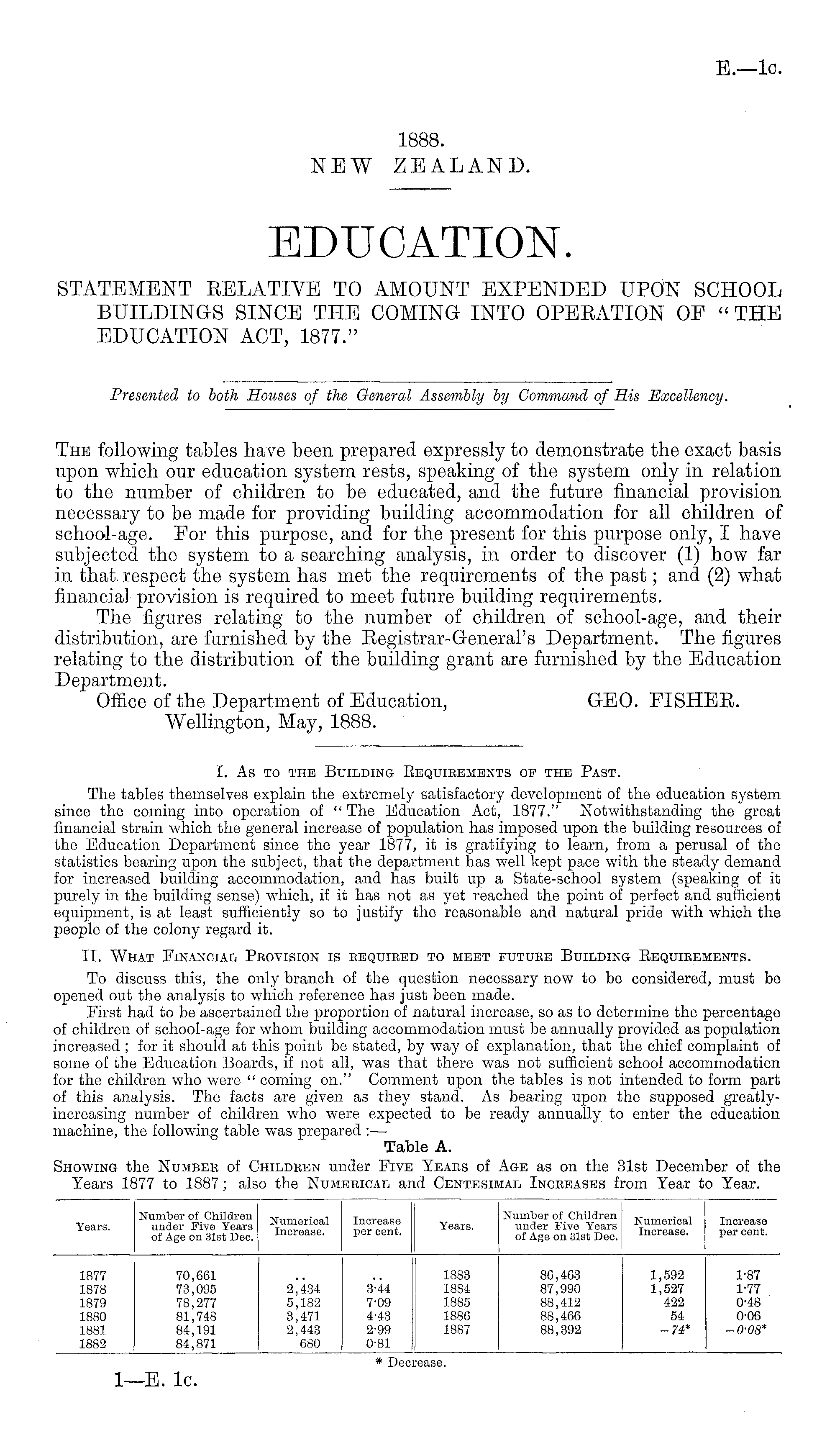 The following tables have been prepared expressly to demonstrate the exact basis upon which our education system rests, speaking of the system only in relation to the number of children to be educated, and the future financial provision necessary to be made for providing building accommodation for all children of school-age. Eor this purpose, and for the present for this purpose only, I have subjected the system to a searching analysis, in order to discover (1) how far in that, respect the system has met the requirements of the past; and (2) what financial provision is required to meet future building requirements. The figures relating to the number of children of school-age, and their distribution, are furnished by the Eegistrar-General's Department. The figures relating to the distribution of the building grant are furnished by the Education Department. Office of the Department of Education, GEO. FISHEE. Wellington, May, 1888.