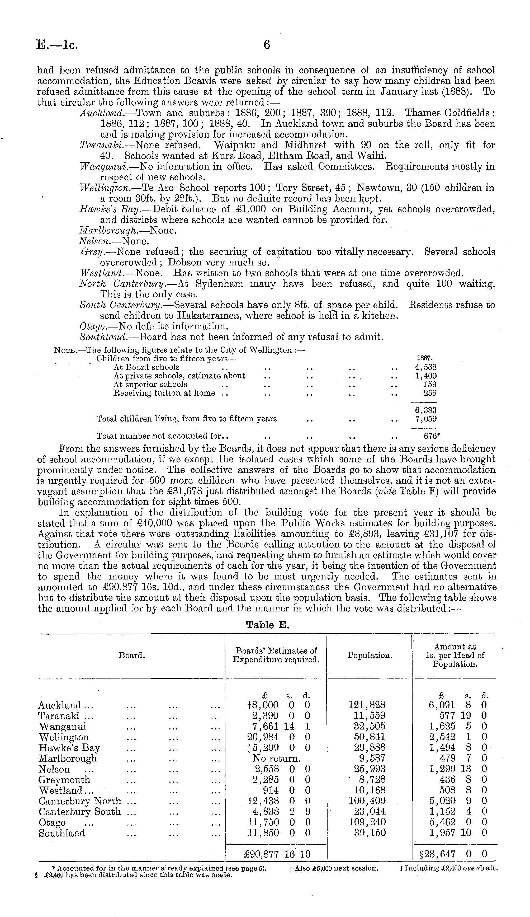 had been refused admittance to the public schools in consequence of an insufficiency of school accommodation, the Education Boards were asked by circular to say how many children had been refused admittance from this cause at the opening of the school term in January last (1888). To that circular the following answers were returned:— Auckland.— Town and suburbs : 1886, 200; 1887, 390; 1888, 112. Thames Goldfields : 1886, 112 ; 1887, 100 ; 1888, 40. In Auckland town and suburbs the Board has been and is making provision for increased accommodation. Taranaki. —None refused. Waipuku and Midhurst with 90 on the roll, only fit for 40. Schools wanted at Kura Eoad, Eltham Eoad, and Waihi. Wanganui. —No information in office. Has asked Committees. Eequirements mostly in respect of new schools. Wellington. —Te Aro School reports 100; Tory Street, 45 ; Newtown, 30 (150 children in a room 30ft. by 22ft.). But no definite record has been kept. Hawke's Bay. —Debit balance of £1,000 on Building Account, yet schools overcrowded, and districts where schools are wanted cannot be provided for. Marlborough.- —None. Nelson. —None. Grey. —None refused; the securing of capitation too vitally necessary. Several schools overcrowded ; Dobson very much so. Westland. —None. Has written to two schools that were at one time overcrowded. North Canterbury. —At Sydenham many have been refused, and quite 100 waiting. This is the only case. South Canterbury. —Several schools have only Bft. of space per child. Besidents refuse to send children to Hakateramea, where school is held in a kitchen. Otago. —No definite information. Southland. —Board has not been informed of any refusal to admit. Note. —The following figures relate to the City of Wellington : — Children from five to fifteen years— 1887. At Board schools .. .. .. .. .. 4,568 At private schools, estimate ahout .. .. .. .. 1,400 At superior schools .. .. .. .. .. 159 Receiving tuition at home .. .. .. .. .. 256 6,383 Total children living, from five to fifteen years .. .. .. 7,059 Total number not accounted for.. .. .. .. .. 676* From the answers furnished by the Boards, it does not appear that there is any serious deficiency of school accommodation, if we except the isolated cases which some of the Boards have brought prominently under notice. The collective answers of the Boards go to show that accommodation is urgently required for 500 more children who have presented themselves, and it is not an extravagant assumption that the £31,678 just distributed amongst the Boards (vide Table F) will provide building accommodation for eight times 500. In explanation of the distribution of the building vote for the present year it should be stated that a sum of £40,000 was placed upon the Public Works estimates for building purposes. Against that vote there were outstanding liabilities amounting to £8,893, leaving £31,107 for distribution. A circular was sent to the Boards calling attention to the amount at the disposal of the Government for building purposes, and requesting them to furnish an estimate which would cover no more than the actual requirements of each for the year, it being the intention of the Government to spend the money where it was found to be most urgently needed. The estimates sent in amounted to £90,877 16s. 10d., and under these circumstances the Government had no alternative but to distribute the amount at their disposal upon the population basis. The following table shows the amount applied for by each Board and the manner in which the vote was distributed: —