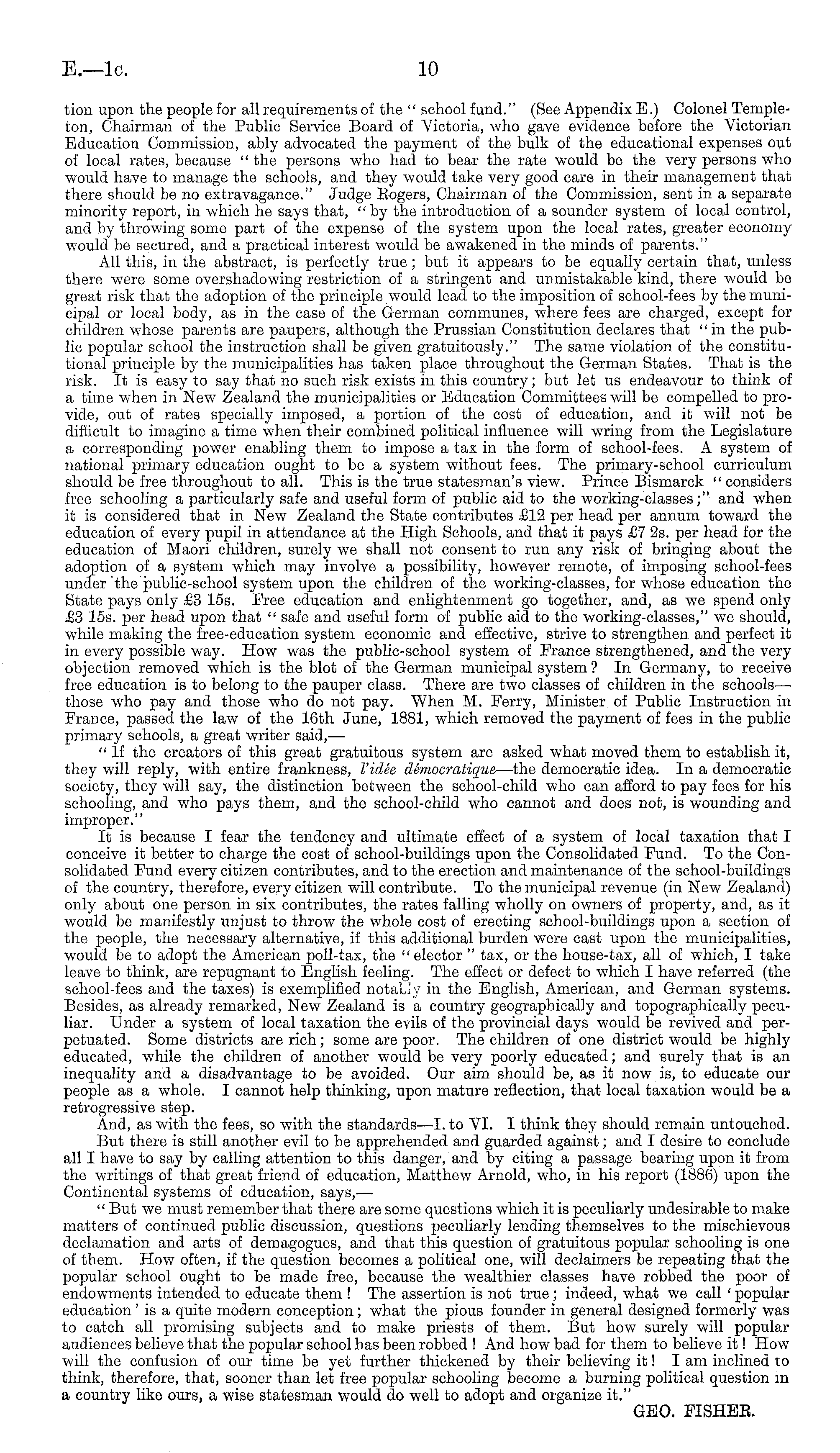 tion upon the people for all requirements of the " school fund." (See Appendix E.) Colonel Templeton, Chairman of the Public Service Board of Victoria, who gave evidence before the Victorian Education Commission, ably advocated the payment of the bulk of the educational expenses out of local rates, because " the persons who had to bear the rate would be the very persons who would have to manage the schools, and they would take very good care in their management that there should be no extravagance." Judge Eogers, Chairman of the Commission, sent in a separate minority report, in which he says that, "by the introduction of a sounder system of local control, and by throwing some part of the expense of the system upon the local rates, greater economy would be secured, and a practical interest would be awakened in the minds of parents." All this, in the abstract, is perfectly true ; but it appears to be equally certain that, unless there were some overshadowing restriction of a stringent and unmistakable kind, there would be great risk that the adoption of the principle would lead to the imposition of school-fees by the municipal or local body, as in the case of the German communes, where fees are charged, except for children whose parents are paupers, although the Prussian Constitution declares that " in the public popular school the instruction shall be given gratuitously." The same violation of the constitutional principle by the municipalities has taken place throughout the German States. That is the risk. It is easy to say that no such risk exists in this country; but let us endeavour to think of a time when in New Zealand the municipalities or Education Committees will be compelled to provide, out of rates specially imposed, a portion of the cost of education, and it will not be difficult to imagine a time when their combined political influence will wring from the Legislature a corresponding power enabling them to impose a tax in the form of school-fees. A system of national primary education ought to be a system without fees. The primary-school curriculum should be free throughout to all. This is the true statesman's view. Prince Bismarck "considers free schooling a particularly safe and useful form of public aid to the working-classes;" and when it is considered that in New Zealand the State contributes £12 per head per annum toward the education of every pupil in attendance at the High Schools, and that it pays £7 2s. per head for the education of Maori children, surely we shall not consent to run any risk of bringing about the adoption of a system which may involve a possibility, however remote, of imposing school-fees under the public-school system upon the children of the working-classes, for whose education the State pays only £3 15s. Free education and enlightenment go together, and, as we spend only £3 15s. per head upon that " safe and useful form of public aid. to the working-classes," we should, while making the free-education system economic and effective, strive to strengthen and perfect it in every possible way. How was the public-school system of France strengthened, and the very objection removed which is the blot of the German municipal system ? In Germany, to receive free education is to belong to the pauper class. There are two classes of children in the schools —■ those who pay and those who do not pay. When M. Ferry, Minister of Public Instruction in France, passed the law of the 16th June, 1881, which removed the payment of fees in the public primary schools, a great writer said, — " If the creators of this great gratuitous system are asked what moved them to establish it, they will reply, with entire frankness, Videe democratique —the democratic idea. In a democratic society, they will say, the distinction between the school-child who can afford to pay fees for his schooling, and who pays them, and the school-child who cannot and does not, is wounding and improper." It is because I fear the tendency and ultimate effect of a system of local taxation that I conceive it better to charge the cost of school-buildings upon the Consolidated Fund. To the Consolidated Fund every citizen contributes, and to the erection and maintenance of the school-buildings of the country, therefore, every citizen will contribute. To the municipal revenue (in New Zealand) only about one person in six contributes, the rates falling wholly on owners of property, and, as it would be manifestly unjust to throw the whole cost of erecting school-buildings upon a section of the people, the necessary alternative, if this additional burden were cast upon the municipalities, would be to adopt the American poll-tax, the "elector " tax, or the house-tax, all of which, I take leave to think, are repugnant to English feeling. The effect or defect to which I have referred (the school-fees and the taxes) is exemplified notaL'y in the English, American, and German systems. Besides, as already remarked, New Zealand is a country geographically and topographically peculiar. Under a system of local taxation the evils of the provincial days would be revived and perpetuated. Some districts are rich; some are poor. The children of one district would be highly educated, while the children of another would be very poorly educated; and surely that is an inequality and a disadvantage to be avoided. Our aim should be, as it now is, to educate our people as a whole. I cannot help thinking, upon mature reflection, that local taxation would be a retrogressive step. And, as with the fees, so with the standards—l. to VI. I think they should remain untouched. But there is still another evil to be apprehended and guarded against; and I desire to conclude all I have to say by calling attention to this danger, and by citing a passage bearing upon it from the writings of that great friend of education, Matthew Arnold, who, in his report (1886) upon the Continental systems of education, says, — " But we must 