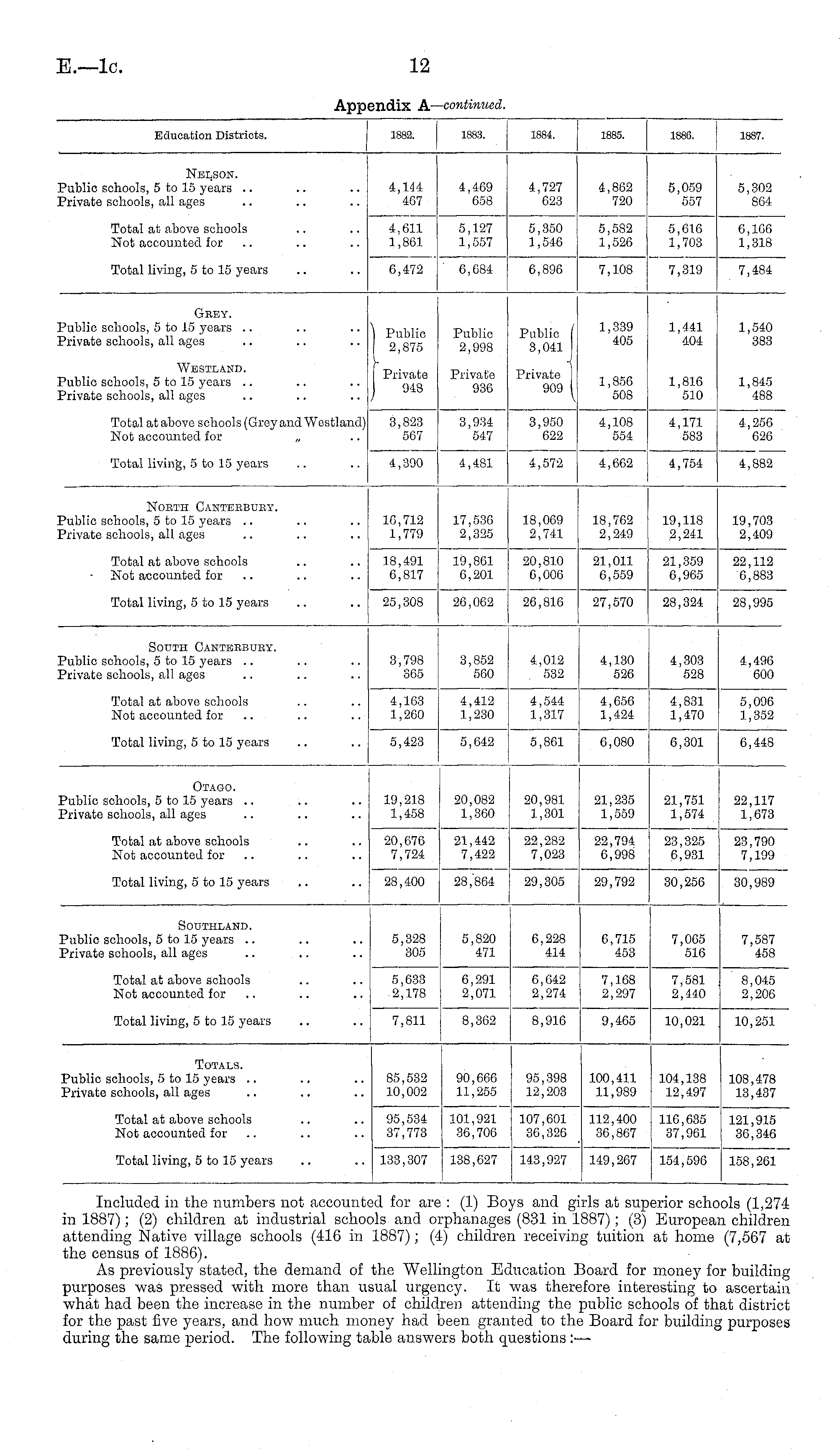 Education Districts. 1882. 1883. 1884. 1885. 1886. 1887. Nelson. 'ublic schools, 5 to 15 years .. 'rivate schools, all ages 4,141 167 4,469 658 4,727 623 4,862 720 5,059 557 5,302 864 Total at above schools Not accounted for 4,611 1,861 5,127 1,557 5,350 1,546 5,582 1,520 5,616 1,703 6,166 1,318 Total living, 5 to 15 years 0,472 6,684 6,896 7,108 7,319 7,484 Geey. 'ublic schools, 5 to 15 years 'rivate schools, all ages ) Public 2,875 Private J 948 Public 2,998 Public ( 3,041 Private 909 V 1,339 405 1,441 404 1,540 383 Westland. 'ublic schools, 5 to 15 years 'rivate schools, all ages Private 936 1,856 508 1,816 510 1,845 488 Total at above schools (Grey and Westland) Not accounted for „ 3,823 567 3,934 547 3,950 622 4,108 554 4,171 583 4,256 626 Total living, 5 to 15 years 4,390 4,481 4,572 4,662 4,754 4,382 NOETH CANTEEBUBY. 'ublic schools, 5 to 15 years .. 'rivate schools, all ages 10,712 1,779 17,536 2,325 18,069 2,741 18,762 2,249 19,118 2,241 19,703 2,409 Total at above schools Not accounted for 18,491 6,817 19,861 6,201 20,810 6,006 21,011 6,559 21,359 6,965 22,112 6,883 Total living, 5 to 15 years 25,308 26,062 26,816 27,570 28,324 28,995 South Oanteebuey. 'ublic schools, 5 to 15 years .. 'rivate schools, all ages 3,798 365 3,852 560 4,012 532 4,130 526 4,303 528 4,496 600 Total at above schools Not accounted for 4,163 1,260 4,412 1,230 4,544 1,317 4,656 1,424 4,831 1,470 5,096 1,352 Total living, 5 to 15 years 5,423 5,642 5,861 0,080 6,301 6,448 Otago. 'ublic schools, 5 to 15 years .. 'rivate schools, all ages 19,218 1,458 20,082 1,360 20,981 1,301 21,235 1,559 21,751 1,574 22,117 1,673 Total at above schools Not accounted for 20,676 7,724 21,442 7,422 22,282 7,023 22,794 0,998 23,325 6,931 23,790 7,199 Total living, 5 to 15 years 28,400 28,864 29,305 29,792 30,256 30,989 Southland. Public schools, 5 to 15 years .. Private schools, all ages 5,328 305 5,820 471 6,228 414 6,715 453 7,005 516 7,587 458 Total at above schools Not accounted for 5,633 2,178 6,291 2,071 6,642 2,274 7,168 2,297 7,581 2,440 8,015 2,206 Total living, 5 to 15 years 7,811 8,362 8,916 9,165 10,021 10,251 Totals. Public schools, 5 to 15 years .. Private schools, all ages 85,532 10,002 90,666 11,255 95,398 12,203 100,111 11,989 104,138 12,497 108,478 13,137 Total at above schools Not accounted for 95,534 37,773 101,921 36,706 107,601 36,326 112,400 36,867 116,635 37,961 121,915 36,346 Total living, 5 to 15 years 133,307 138,627 143,927 149,267 154,596 158,261