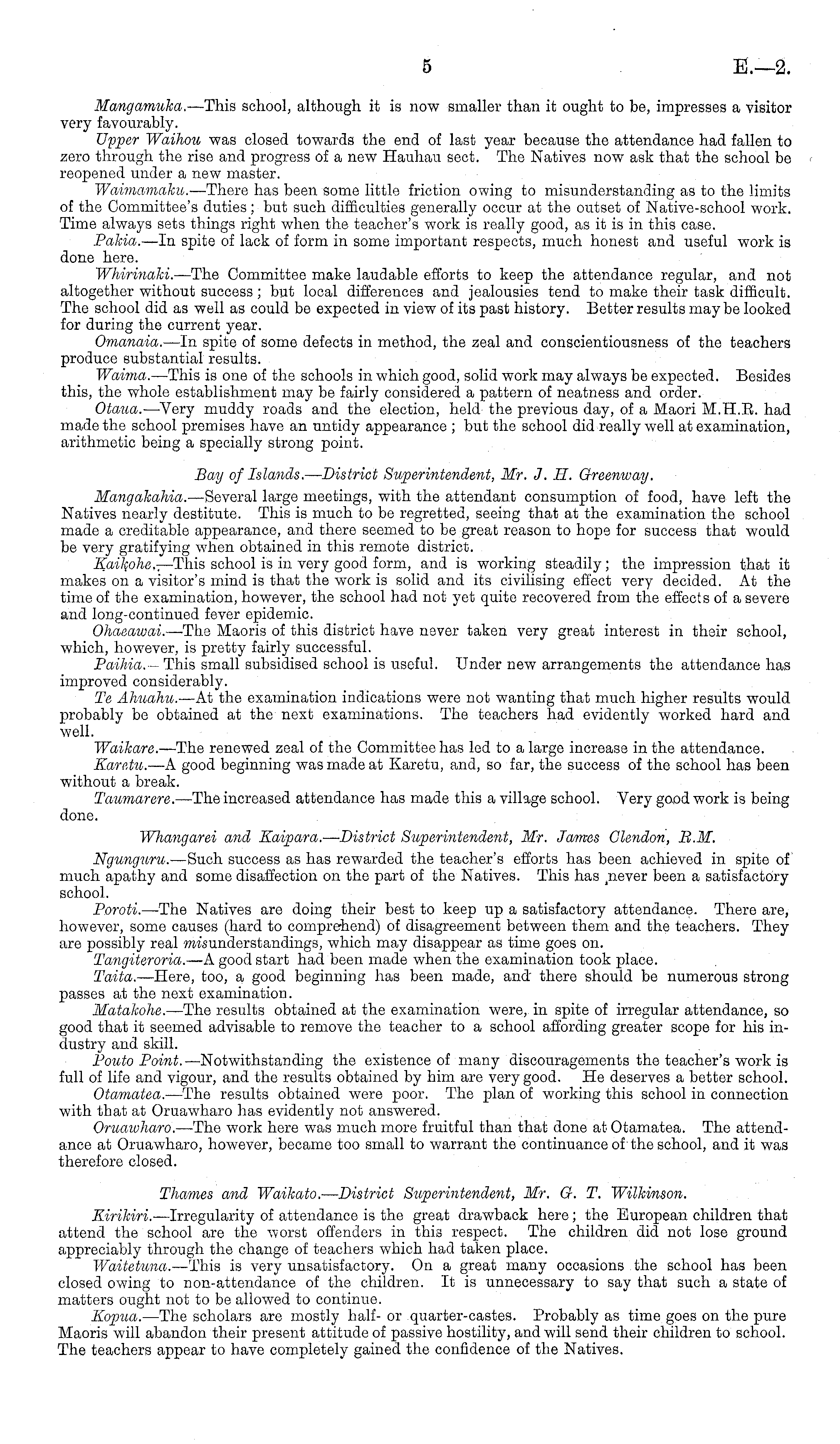 Mangamuha. —This school, although it is now smaller than it ought to be, impresses a visitor very favourably. Upper Waihou was closed towards the end of last year because the attendance had fallen to zero through the rise and progress of a new Hauhau sect. The Natives now ask that the school be reopened under a new master. Waimamaku. —There has been some little friction owing to misunderstanding as to the limits of the Committee's duties; but such difficulties generally occur at the outset of Native-school work. Time always sets things right when the teacher's work is really good, as it is in this case. Pahia. —ln spite of lack of form in some important respects, much honest and useful work is done here. Whirinaki. —The Committee make laudable efforts to keep the attendance regular, and not altogether without success ; but local differences and jealousies tend to make their task difficult. The school did as well as could be expected in view of its past history. Better results maybe looked for during the current year. Omanaia. —ln spite of some defects in method, the zeal and conscientiousness of the teachers produce substantial results. Wainia. —This is one of the schools in which good, solid work may always be expected. Besides this, the whole establishment may be fairly considered a pattern of neatness and order. Otaua. —Very muddy roads and the election, held the previous day, of a Maori M.11.E. had made the school premises have an untidy appearance ; but the school did really well at examination, arithmetic being a specially strong point. Bay of Islands. — District Superintendent, Mr. J. H. Greemvay. Mangaltahia. —Several large meetings, with the attendant consumption of food, have left the Natives nearly destitute. This is much to be regretted, seeing that at the examination the school made a creditable appearance, and there seemed to be great reason to hope for success that would be very gratifying when obtained in this remote district. Kaikohe,- —This school is in very good form, and is working steadily ; the impression that it makes on a visitor's mind is that the work is solid and its civilising effect very decided. At the time of the examination, however, the school had not yet quite recovered from the effects of a severe and long-continued fever epidemic. Ohaeawai. —The Maoris of this district have naver taken very great interest in their school, which, however, is pretty fairly successful. Paihia.— This small subsidised school is useful. Under new arrangements the attendance has improved considerably. Te Ahuahii. —At the examination indications were not wanting that much higher results would probably be obtained at the next examinations. The teachers had evidently worked hard and well. Waikare.-— -The renewed zeal of the Committee has led to a large increase in the attendance. Kare.tu. —A good beginning was made at Karetu, and, so far, the success of the school has been without a break. Taumarere. —The increased attendance has made this a village school. Very good work is being done. Whangarei and Kaipara. — District Superintendent, Mr. James Clendon, B.M. Ngunguru. —Such success as has rewarded the teacher's efforts has been achieved in spite of much apathy and some disaffection on the part of the Natives. This has ( nevcr been a satisfactory school. Poroti. —The Natives are doing their best to keep up a satisfactory attendance. There are, however, some causes (hard to comprehend) of disagreement between them and the teachers. They are possibly real misunderstandings, which may disappear as time goes on. Tangiteroria. —A good start had been made when the examination took place. Taita. —Here, too, a good beginning has been made, and there should be numerous strong passes at the next examination. Matakohe. —The results obtained at the examination were, in spite of irregular attendance, so good that it seemed advisable to remove the teacher to a school affording greater scope for his industry and skill. Pouto Point. —'Notwithstanding the existence of many discouragements the teacher's work is full of life and vigour, and the results obtained by him are very good. He deserves a better school. Otainatea. —The results obtained were poor. The plan of working this school in connection with that at Oruawharo has evidently not answered. Oruaivliaro. —The work here was much more fruitful than that done at Otamatea. The attendance at Oruawharo, however, became too small to warrant the continuance of the school, and it was therefore closed. Thames and Waikato. — District Superintendent, Mr. G. T. Wilkinson. Kirikiri. —lrregularity of attendance is the great drawback here ; the European children that attend the school are the worst offenders in this respect. The children did not lose ground appreciably through the change of teachers which had taken place. Waitetuna. —This is very unsatisfactory. On a great many occasions the school has been closed owing to non-attendance of the children. It is unnecessary to say that such a state of matters ought not to be allowed to continue. Kopua. —The scholars are mostly half- or quarter-castes. Probably as time goes on the pure Maoris will abandon their present attitude of passive hostility, and will send their children to school. The teachers appear to have completely gained the confidence of the Natives.