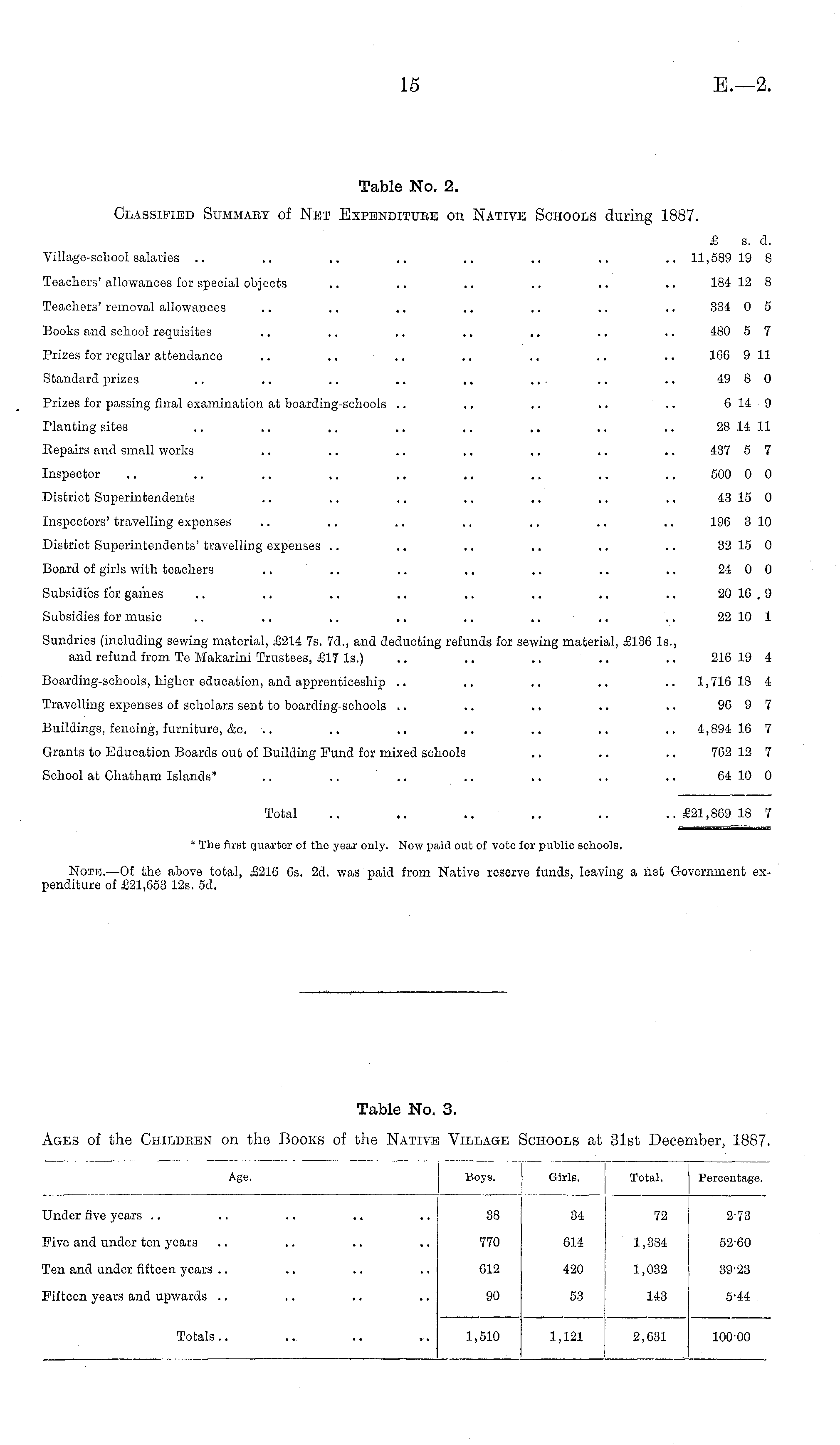 Table No. 2. Classified Summaey of Net Expendituee on Native Schools during 1887. £ s. a. Village-school salaries .. .. .. .. .. .. .. .. 11,589 19 8 Teachers' allowances for special objects .. .. .. .. .. .. 184 12 8 Teachers' removal allowances .. .. .. .. .. .. .. 334 0 5 Books and school requisites .. .. .. .. .. .. ~ 480 5 7 Prizes for regular attendance .. .. .. .. .. .. .. IGC 911 Standard prizes .. .. .. .. .. ... .. .. 49 8 0 Prizes for passing final examination at boarding-schools .. .. .. .. .. 6 14 9 Planting sites .. .. .. .. .. .. .. .. 28 14 11 Eepairs and small works .. .. .. ~ .. .. .. 437 5 7 Inspector .. .. .. ~ .. ~ .. .. .. 500 0 0 District Superintendents .. .. .. .. .. .. .. 43 15 0 Inspectors' travelling expenses .. .. .. .. .. .. .. 196 310 District Superintendents' travelling expenses .. .. .. .. .. .. 32 15 0 Board of girls with teachers .. .. .. .. .. .. .. 24 0 0 Subsidies for games .. .. .. .. .. .. .. .. 20 16 9 Subsidies for music .. .. .. .. .. .. .. .. 22 10 1 Sundries (including sewing material, £214 7s. 7d., and deducting refunds for sewing material, £136 Is., and refund from Te Makarini Trustees, £17 Is.) .. .. .. .. .. 21G 19 4 Boarding-schools, higher education, and apprenticeship .. .. .. .. .. 1,716 18 4 Travelling expenses of scholars sent to boarding-schools .. .. .. .. .. 96 9 7 Buildings, fencing, furniture, &c. .. .. .. .. .. ~ .. 4,894 16 7 Grants to Education Boards out of Building Fund for mixed schools .. .. .. 762 12 7 School at Chatham Islands* .. .. .. .. .. .. .. 64 10 0 Total .. .. .. .. .. .. £21,869 18 7 * The first quarter of the year only. Now paid out of vote for public schools. Note.—Of the above total, £216 6s. 2d. was paid from Native reserve funds, leaving a net Government expenditure of £21,653 12s. sd.