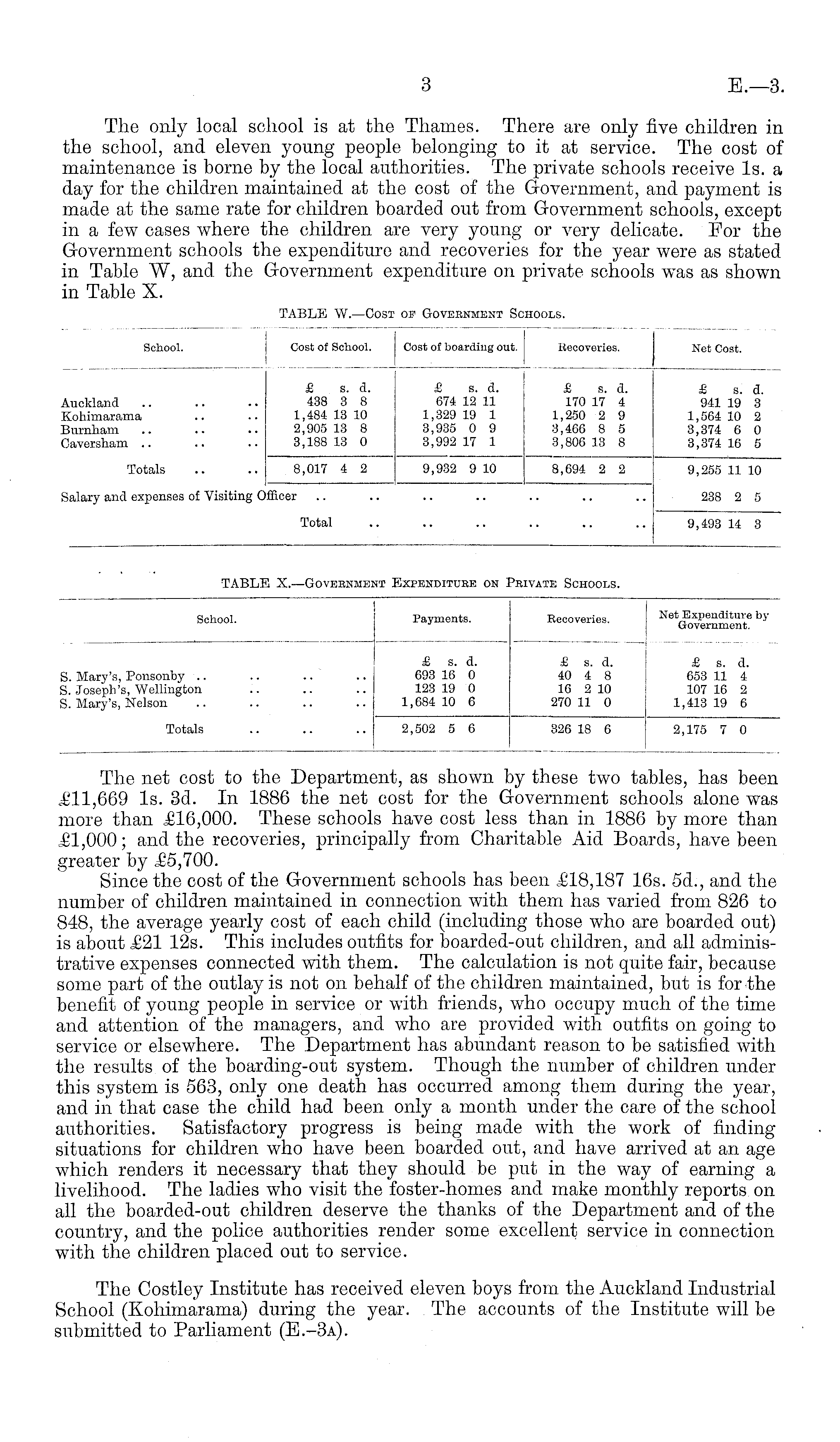 The only local school is at the Thames. There are only five children in the school, and eleven young people belonging to it at service. The cost of maintenance is borne by the local authorities. The private schools receive Is. a day for the children maintained at the cost of the Government, and payment is made at the same rate for children boarded out from Government schools, except in a few cases where the children are very young or very delicate. For the Government schools the expenditure and recoveries for the year were as stated in Table W, and the Government expenditure on private schools was as shown in Table X.