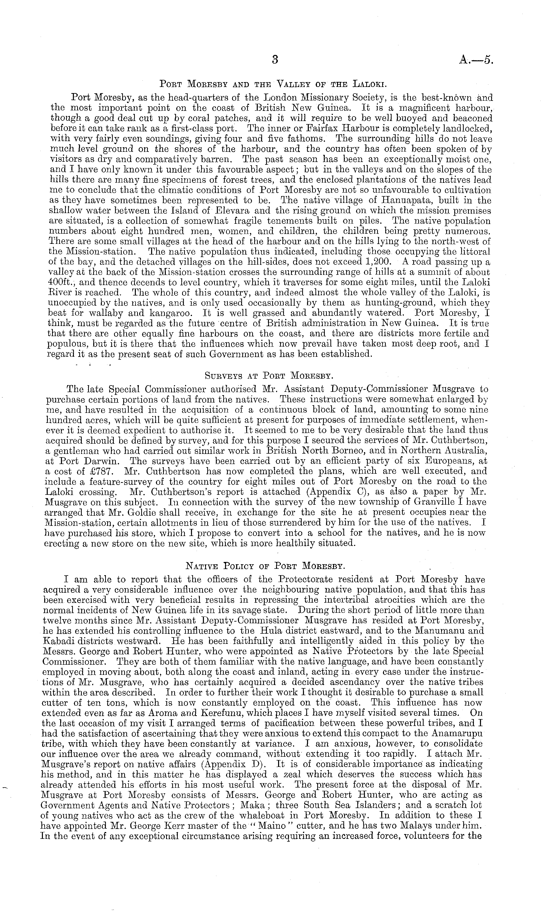 Poet Moresby and the Valley op the Laloki. Port Moresby, as the head-quarters of the London Missionary Society, is the best-known and the most important point on the coast of British New Guinea. It is a magnificent harbour, though a good deal cut up by coral patches, and it will require to be well buoyed and beaconed before it can take rank as a first-class port. The inner or Fairfax Harbour is completely landlocked, with very fairly even soundings, giving four and five fathoms. The surrounding hills do not leave much level ground on the shores of the harbour, and the country has often been spoken of by visitors as dry and comparatively barren. The past season has been an exceptionally moist one, and I have only known it under this favourable aspect; but in the valleys and on the slopes of the hills there are many fine specimens of forest trees, and the enclosed plantations of the natives lead me to conclude that the climatic conditions of Port Moresby are not so unfavourable to cultivation as they have sometimes been represented to be. The native village of Hanuapata, built in the shallow water between the Island of Elevara and the rising ground on which the mission premises are situated, is a collection of somewhat fragile tenements built on piles. The native population numbers about eight hundred men, women, and children, the children being pretty numerous. There are some small villages at the head of the harbour and on the hills lying to the north-west of the Mission-station. The native population thus indicated, including those occupying the littoral of the bay, and the detached villages on the hill-sides, does not exceed 1,200. A road passing up a valley at the back of the Mission-station crosses the surrounding range of hills at a summit of about 400 ft., and thence decends to level country, which it traverses for some eight miles, until the Laloki Eiver is reached. The whole of this country, and indeed almost the whole valley of the Laloki, is unoccupied by the natives, and is only used occasionally by them as hunting-ground, which they beat for wallaby and kangaroo. It is well grassed and abundantly watered. Port Moresby, I think, must be regarded as the future centre of British administration in New Guinea. It is true that there are other equally fine harbours on the coast, and there are districts more fertile and populous, but it is there that the influences which now prevail have taken most deep root, and I regard it as the present seat of such Government as has been established. Sueveys at Poet Moeesby. The late Special Commissioner authorised Mr. Assistant Deputy-Commissioner Musgrave to purchase certain portions of land from the natives. These instructions were somewhat enlarged by me, and have resulted in the acquisition of a continuous block of land, amounting to some nine hundred acres, which will be quite sufficient at present for purposes of immediate settlement, whenever it is deemed expedient to authorise it. It seemed to me to be very desirable that the land thus acquired should be defined by survey, and for this purpose I secured the services of Mr. Cuthbertson, a gentleman who had carried out similar work in British North Borneo, and in Northern Australia, at Port Darwin. The surveys have been carried out by an efficient party of six Europeans, at a cost of £787. Mr. Cuthbertson has now completed the plans, which are well executed, and include a feature-survey of the country for eight miles out of Port Moresby on the road to the Laloki crossing. Mr. Cuthbertson's report is attached (Appendix C), as also a paper by Mr. Musgrave on this subject. In connection with the survey of the new township of Granville I have arranged that Mr. Goldie shall receive, in exchange for the site he at present occupies near the Mission-station, certain allotments in lieu of those surrendered by him for the use of the natives. I have purchased his store, which I propose to convert into a school for the natives, and he is now erecting a new store on the new site, which is more healthily situated. Native Policy of Poet Moeesby. I am able to report that the officers of the Protectorate resident at Port Moresby have acquired a very considerable influence over the neighbouring native population, and that this has been exercised with very beneficial results in repressing the intertribal atrocities which are the normal incidents of New Guinea life in its savage state. During the short period of little more than twelve months since Mr. Assistant Deputy-Commissioner Musgrave has resided at Port Moresby, he has extended his controlling influence to the Hula district eastward, and to the Manumanu and Kabadi districts westward. He has been faithfully and intelligently aided in this policy by the Messrs. George and Robert Hunter, who were appointed as Native Protectors by the late Special Commissioner. They are both of them familiar with the native language, and have been constantly employed in moving about, both along the coast and inland, acting in every case under the instructions of Mr. Musgrave, who has certainly acquired a decided ascendancy over the native tribes within the area described. In order to further their work I thought it desirable to purchase a small cutter of ten tons, which is now constantly employed on the coast. This influence has now extended even as far as Aroma and Kerefunu, which places I have myself visited several times. On the last occasion of my visit I arranged terms of pacification between these powerful tribes, and I had the satisfaction of ascertaining that they were anxious to extend this compact to the Anamarupu tribe, with which they have been constantly at variance. I am anxious, however, to consolidate our influence over the area we already command, without extending it too rapidly. I attach Mr. Musgrave's report on native affairs (Appendix D). It is of considerable importance as indicating his method, and in this matter he has displayed a zeal which deserv