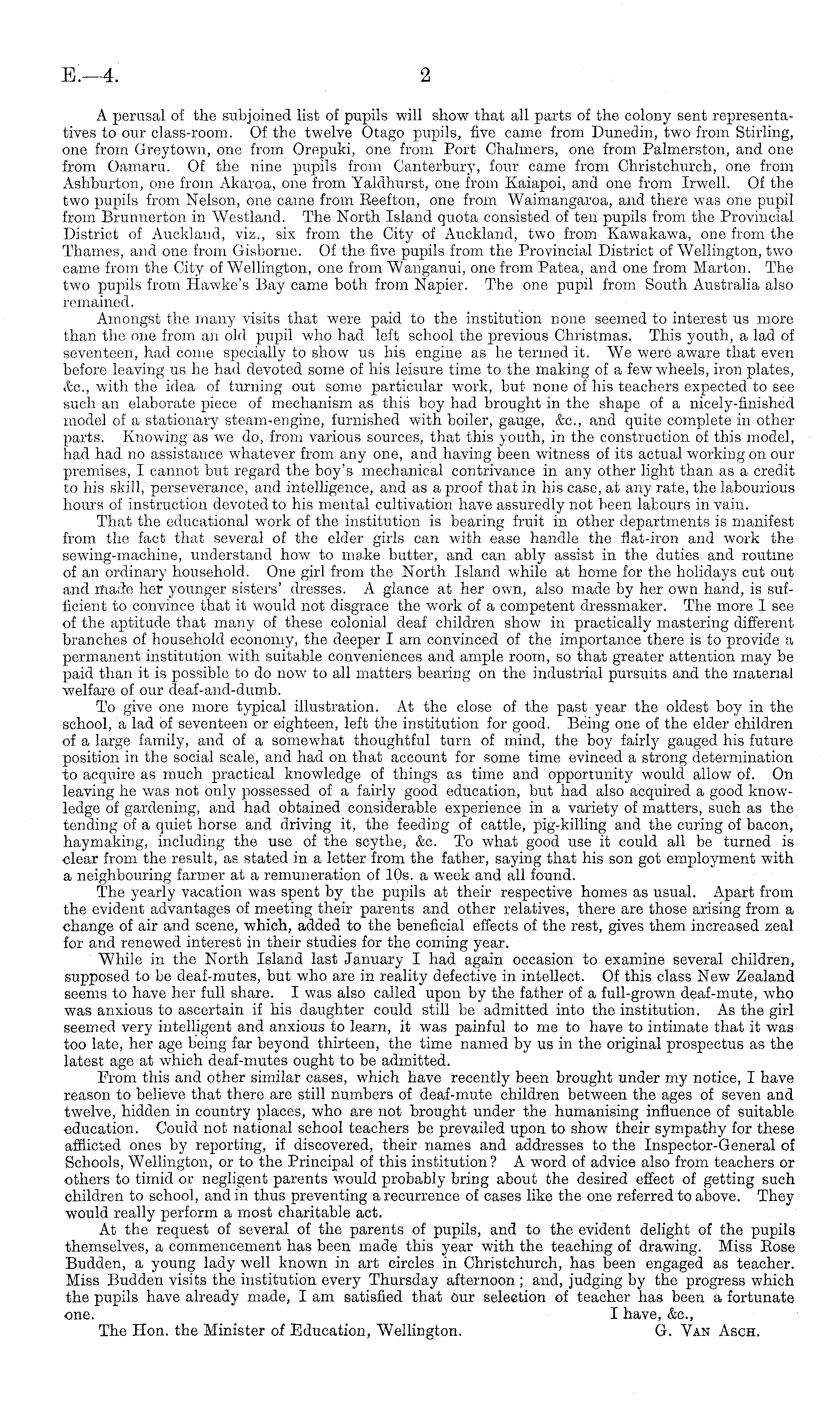 A perusal of the subjoined list of pupils will show that all parts of the colony sent representatives to our class-room. Of the twelve Otago pupils, five came from Dunedin, two from Stirling, one from Grey town, one from Orepuki, one from Port Chalmers, one from Palmerston, and one from Oamaru. Of the nine pupils from Canterbury, four came from Christchurch, one from Ashburton, one from Akaroa, one from Yaldhurst, one from Kaiapoi, and one from Irwell. Of the two pupils from Nelson, one came from Eeefton, one from Waimangaroa, and there was one pupil from Brunnerton in Westland. The North Island quota consisted of ten pupils from the Provincial District of Auckland, viz., six from the City of Auckland, two from Kawakawa, one from the Thames, and one from Gisborue. Of the five pupils from the Provincial District of Wellington, two came from the City of Wellington, one from Wanganui, one from Patea, and one from Marton. The two pupils from Hawke's Bay came both from Napier. The one pupil from South Australia also remained. Amongst the many visits that were paid to the institution none seemed to interest us more than the one from an old pupil who had left school the previous Christmas. This youth, a lad of seventeen, had come specially to show us his engine as he termed it. We were aware that even before leaving us he had devoted some of his leisure time to the making of a few wheels, iron plates, &c, with the idea of turning out some particular work, but none of his teachers expected to see such an elaborate piece of mechanism as this boy had brought in the shape of a nicely-finished model of a stationary steam-engine, furnished with boiler, gauge, &c, and quite complete in other parts. Knowing as we do, from various sources, that this youth, in the construction of this model, had had no assistance whatever from any one, and having been witness of its actual working on our premises, I cannot but regard the boy's mechanical contrivance in any other light than as a credit to his skill, perseverance, and intelligence, and as a proof that in his case, at any rate, the labourions hours of instruction devoted to his mental cultivation have assuredly not been labours in vain. That the educational work of the institution is bearing fruit in other departments is manifest from the fact that several of the elder girls can with ease handle the flat-iron and work the sewing-machine, understand how to make butter, and can ably assist in the duties and routine of an ordinary household. One girl from the North Island while at home for the holidays cut out and made her younger sisters' dresses. A glance at her own, also made by her own hand, is sufficient to convince that it would not disgrace the work of a competent dressmaker. The more 1 see of the aptitude that many of these colonial deaf children show in practically mastering different branches of household economy, the deeper I am convinced of the importance there is to provide a permanent institution with suitable conveniences and ample room, so that greater attention may be paid than it is possible to do now to all matters bearing on the industrial pursuits and the material welfare of our deaf-and-dumb. To give one more typical illustration. At the close of the past year the oldest boy in the school, a lad of seventeen or eighteen, left the institution for good. Being one of the elder children of a large family, and of a somewhat thoughtful turn of mind, the boy fairly gauged his future position in the social scale, and had on that account for some time evinced a strong determination to acquire as much practical knowledge of things as time and opportunity would allow of. On leaving he was not only possessed of a fairly good education, but had also acquired a good knowledge of gardening, and had obtained considerable experience in a variety of matters, such as the tending of a quiet horse and driving it, the feeding of cattle, pig-killing and the curing of bacon, haymaking, including the use of the scythe, &c. To what good use it could all be turned is clear from the result, as stated in a letter from the father, saying that his son got employment with a neighbouring farmer at a remuneration of 10s. a week and all found. The yearly vacation was spent by the pupils at their respective homes as usual. Apart from the evident advantages of meeting their parents and other relatives, there are those arising from a change of air and scene, which, added to the beneficial effects of the rest, gives them increased zeal for and renewed interest in their studies for the coming year. While in the North Island last January I had again occasion to examine several children, supposed to be deaf-mutes, but who are in reality defective in intellect. Of this class New Zealand seems to have her full share. I was also called upon by the father of a full-grown deaf-mute, who was anxious to ascertain if his daughter could still be admitted into the institution. As the girl seemed very intelligent and anxious to learn, it was painful to me to have to intimate that it was too late, her age being far beyond thirteen, the time named by us in the original prospectus as the latest age at which deaf-mutes ought to be admitted. From this and other similar cases, which have recently been brought under my notice, I have reason to believe that there are still numbers of deaf-mute children between the ages of seven and twelve, hidden in country places, who are not brought under the humanising influence of suitable education. Could not national school teachers be prevailed upon to show their sympathy for these afflicted ones by reporting, if discovered, their names and addresses to the Inspector-General of Schools, Wellington, or to the Principal of this institution? A word of advice also from teachers or others to timid or negligent parents would probably bring about the desired effect of getting such children to school, and in thus preventing a recurrence of cases like the one referre