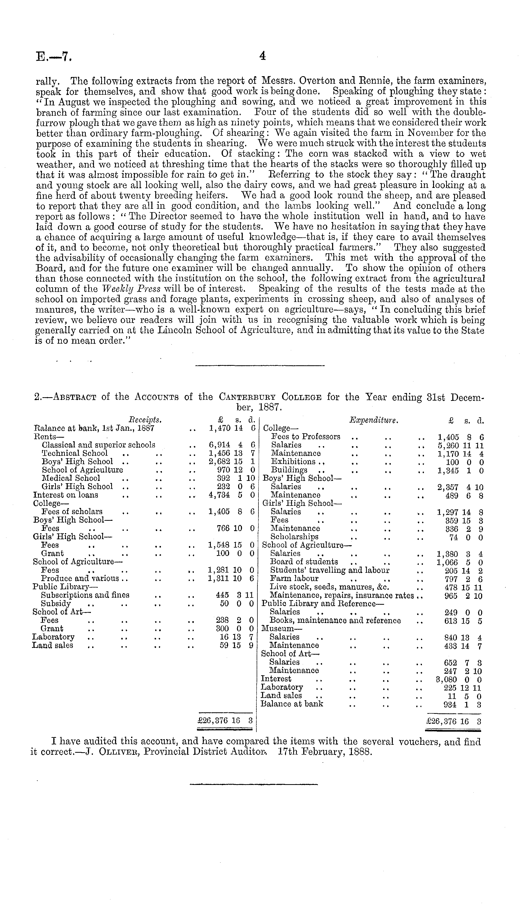 2.—Abstract of the Accounts of the Canteebuey College for the Year ending 31st December, 1887. Receipts. £ s. d. Expenditure. £ s. d. Ralanee at bank, Ist Jan., 1887 .. 1,470 14 C CollegeRents— Fees to Professors .. .. .. 1,405 8 C Classical and superior schools .. 6,914 4 G Salaries .. .. .. .. 5,260 11 11 Technical School .. .. .. 1,450 13 7 Maintenance .. .. .. 1,170 14 4 Boys' High School .. .. .. 2,682 15 1 Exhibitions.. .. .. 100 0 0 School of Agriculture .. .. 970 12 0 Buildings .. .. .. .. 1,345 1 0 Medical School .. .. .. 392 1 10 Boys' High SchoolGirls' High School .. .. .. 232 0 6 Salaries .. .. .. .. 2,357 410 Interest on loans .. .. .. 4,734 5 0 Maintenance .. .. ~ 489 6 8 College— Girls' High School — Pees of scholars .. .. .. 1,405 8 6 Salaries .. .. .. .. 1,297 14 8 Boys' High School— Fees .. .. .. .. 359 15 3 Fees .. .. .. .. 766 10 0 Maintenance ~ .. 336 2 9 Girls' High School— Scholarships .. .. .. 74 0 0 Fees .. .. .. .. 1,548 15 0 School of Agriculture— Grant .. .. .. .. 100 0 0 Salaries .. .. .. .. 1,380 3 4 School of Agriculture— Board of students ~ .. .. 1,066 5 0 Fess .. .. .. .. 1,281 10 0 Students'travelling and labour .. 205 14 2 Produce and various .. .. .. 1,811 10 6 Farm labour .. ~ .. 797 2 6 Public Library— Live stock, seeds, manures, &o. .. 478 15 11 Subscriptions and fines .. .. 445 811 Maintenance, repairs, insurance rates ~ 965 210 Subsidy .. .. .. .. 50 0 0 Public Library and Reference— School of Art — Salaries .. .. ~ .. 249 0 0 Fees .. .. .. .. 238 2 0 Books, maintenance and reference .. 613 15 5 Grant .. .. .. .. 300 0 0 MuseumLaboratory .. .. .. .. 16 13 7 Salaries .. .. .. .. 840 13 4 Land sales .. .. .. .. 59 15 9 Maintenance .. .. .. 433 14 7 School of Art— Salaries .. .. .. .. 652 7 3 Maintenance .. .. .. 247 2 10 Interest .. .. .. .. 3,080 0 0 Laboratory .. .. .. .. 225 12 11 Land sales .. .. .. .. 11 5 0 Balance at bank .. .. .. 934 1 3 £26,376 16 8 j ,-626,376 16 3 I have audited this account, and have compared the items with the several vouchers, and find it correct. —J. Ollivee, Provincial District Auditor-. 17th February, 1888.