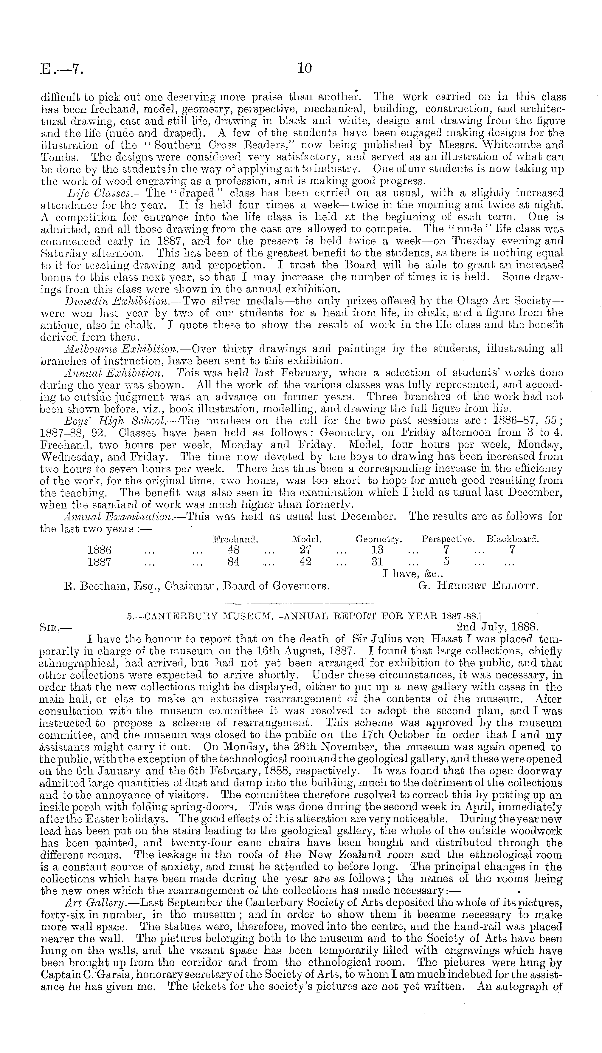 difficult to pick out one deserving more praise than another. The work carried on in this class has been freehand, model, geometry, perspective, mechanical, building, construction, and architectural drawing, cast and still life, drawing in black and white, design and drawing from the figure and the life (nude and draped). A few of the students have been engaged making designs for the illustration of the " Southern Cross Eeaders," now being published by Messrs. Whitcombe and Tombs. The designs were considered very satisfactory, and served as an illustration of what can be done by the students in the way of applying art to industry. One of our students is now taking up the work of wood engraving as a profession, and is making good progress. Life Classes. —The " draped " class has been carried on as usual, with a slightly increased attendance for the year. It is held four times a week—twice in the morning and twice at night. A competition for entrance into the life class is held at the beginning of each term. One is admitted, and all those drawing from the cast are allowed to compete. The " nude " life class was commenced early in 1887, and for the present is held twice a week—on Tuesday evening and Saturday afternoon. This has been of the greatest benefit to the students, as there is nothing equal to it for teaching drawing and proportion. I trust the Board will be able to grant an increased bonus to this class next year, so that I may increase the number of tim.es it is held. Some drawings from this class were shown in the annual exhibition. Dunedin Exhibition. —Two silver medals—the only prizes offered by the Otago Art Society—■ wore won last year by two of our students for a head from life, in chalk, and a figure from the antique, also in chalk. I quote these to show the result of work in the life class and the benefit derived from them. Melbourne Exhibition. —Over thirty drawings and paintings by the students, illustrating all branches of instruction, have been sent to this exhibition. Annual Exhibition. —This was held last February, when a selection of students' works done during the year was shown. All the work of the various classes was fully represented, and according to outside judgment was an advance on former years. Three branches of the work had not been shown before, viz., book illustration, modelling, and drawing the full figure from life. Boys' High School. —The numbers on the roll for the two past sessions are: 1886-87, 55 ; 1887-88, 92. Classes have been held as follows : Geometry, on. Friday afternoon from 3 to 4. Freehand, two hours per week, Monday and Friday. Model, four hours per week, Monday, Wednesday, and Friday. The time now devoted by the boys to drawing has been increased from two hours to seven hours per week. There has thus been a corresponding increase in the efficiency of the work, for the original time, two hours, was too short to hope for much good resulting from the teaching. The benefit was also seen in the examination which I held as usual last December, when the standard of work was much higher than formerly. Annual Examination. —This was held as usual last December. The results are as follows for the last two years : —■ Freehand. Model. Geometry. Perspective. Blackboard. 1886 ... ... 48 ... 27 ... 13 ... 7 ... 7 1887 ... ... 84 ... 42 ... 31 ... 5 I have, &c, E. Beetham, Esq., Chairman, Board of Governors. G. Heebeet Elliott.