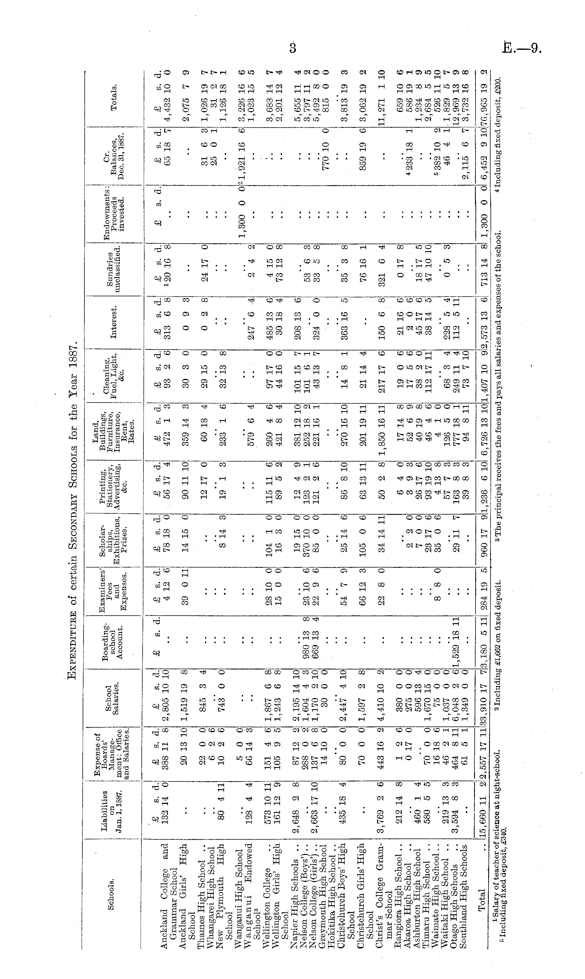 Schools. Liabilities on Jan. 1,1887. Expense of Boards' Management: Office and Salaries. School Salaries. Boardingschool Account. Examiners' Fees and Expenses, i Scholarships, Exhibitions, Prizes. Printing, Stationery, Advertising, &c. Land, Buildings, Furniture, Insurance, Bent, Bates. Cleaning, Fuel, Light, &c. Interest. Sundries unclassified. Endowments: Proceeds invested. Cr. Balances, Dec. 31,1887. Totals. Auckland College and Grammar School Auckland Girls' High School Thames High School .. Whangarei High School New Plymouth High School Wanganui High School Wanganui Endowed School 3 Wellington College Wellington Girls' High School Napier High Schools .. Nelson College (Boys').. Nelson College (Girls') .. Greymouth High School Hokitika High School .. Cbxistchurch Boys' High School Christchurch Girls' High School Christ's College Grammar School Kangiora High School.. Akaroa High School Ashburton High School Timaru High School .. Waimate High School.. Waitaki High School .. Otago High Schools Southland High Schools £ s. d. 132 14 0 £ s. d. 388 11 8 £ s. a. 2,805 10 10 £ s. d. £ s. d. 4 12 6 £ s. a. 78 18 0J s s. a. 56 17 4 £ s. d. 472 1 3 £ s. d. 93 2 6 £ s. d. 313 C 8 £ s. d. *20 16 8 £ s. a. £ s. a. 65 18 7 £ s. d. 4,432 10 t 20 13 10 1,519 19 8 39 0 11 14 15 01 | 90 11 10 359 14 3 30 3 0 0 9 3 •• 2,075 7 £ 80' 4 11 22 0 0 6 2 6 10 2 0 845 3 4 743' 0 0 .. 8'l4 3 12 17 0! 19 'l 3^ 60 18 4 233 1 6 29 15 0 3213 8 0 2 8 24 17 0 31 6 3 25 0 1 1,026 19 7 31 2 1 1,126 18 3 " m' 4 4 5 0 0 60 14 3 579 6 4 247 6 4 2 4 2 1,300 0 0 " 1,921 16 6 3,226 10 £ 1,023 15 E .. 573 10 11 161 12 9 151 4 6 105 9 5 1,867 6 8 1,243 6 8 28 10 0 15 0 0 104 1 0 16 3 0 115 11 6 89 5 2 260 4 6 421 8 4 97 17 0 44 16 0 485 13 6 30 18 4 4 15 0 73 12 8 3,683 14 7 2,201 12 4 2,648 2 8 2,663'l7 10 87 12 2 288 0 2 137 6 8 14 10 0 2,195 14 10 1,604 4 3 1,170 2 10 30 0 0 980 13 8 669 13 4 23'l0 6 22 9 6 19 15 0 370 10 0 85 0 0 12 4 9! 123 2 1 121 2 6 381 12 10 252 18 2 221 16 1 101 15 7 101 6 1 43 13 7 208 13 6 324 0 0 53 6 3 33 C 8 5,655 11 4 3,797 11 S 5,492 8 C 815 0 I •■ 770 10 0 435' 18 4 80 0 0 2,447* 4 10 54"7 9 25*14 6 86 8 10 270" 16 10 14"s 1 363 16 5 35 "3 8 3,81319 £ 70 0 0 1,597 2 8 " 66 12 3 105 0 61 63 13 111 201 19 11 21 14 4 76 16 1 859 19 6 3,062 19 J 3,769 2 6 443 16 2 4,410 10 2 22 8 0 34 14 11 50 2 8 1,850 16 11 217 17 6 150 6 8 321 6 4 " " 11,271 1 1C 212 14 8 46o' 1 4 580 5 5 12 6 0 17 0 70 0 0 16 18 6 46 2 1 464 8 11 61 5 1 380 0 0 275 0 0 596 13 4 1,670 15 0 75 0 0 1,037 0 0| 6,048 2 6 1,349 0 0 8"8 0 2 2 0 7 0 0 23 17 6 35 0 6 6 4 0: 3 9 3 26 17 6 93 19 10 4 13 8 57 7 3 163 8 3 39 8 3: 17 14 8 52 6 9 40 19 8 46 4 6 4 10 126 5 0 777 18 1 94 8 11 19 0 6 17 5 6 38 2 0 112 17 11 21 16 6 2 0 6' 45 17 6 38 14 5 0 17 8 18 17 5 47 10 10 4233"l8 1 10 2 46 4 1 659 10 t 586 19 ] 1,234 8 £ 2,684 5 t 526 11 1C ■1,829 5 7 12,969 13 E 3,732 16 I 219 13 3 3,594 8 3 1,529 18 11 29 11 7 68 3 4 249 11 4J 73 7 10 228 5 4 112 5 11 0 5 3 2,115' 6 7 .. • • • • Total 15,660 11 2I 2,557 17 11 133,910 17 7 3,180 5 11 I 284 19 5l 960 17 9! 11,236 6 101 6,726 13 10| |l,407 10 9l [2,573 13 6| 713 14 81 1,300 0 01 6,452 9 10[ ;76,965 19 1 Salary of teacher of science at night-school. 6 Including fixed deposit, £340. 2 Including £1,662 on fixed deposit. 3 The principal receives the fees and pas's all salaries and expenses of the school. 1 Including fixed deposit, £200.