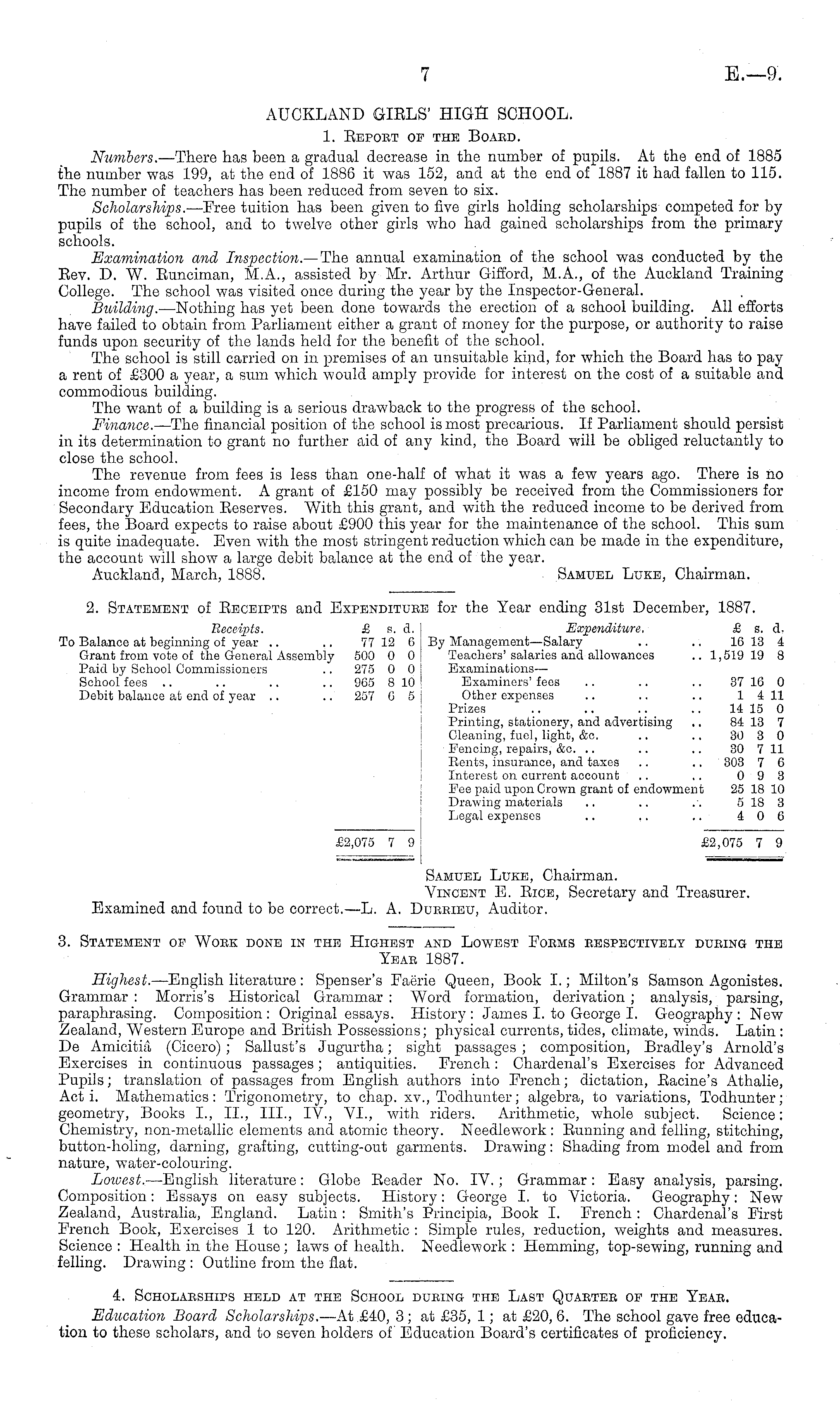 AUCKLAND GIBLS' HIGH SCHOOL. 1. Eeport of the Board. Numbers. —There has been a gradual decrease in the number of pupils. At the end of 1885 the number was 199, at the end of 1886 it was 152, and at the end of 1887 it had fallen to 115. The number of teachers has been reduced from seven to six. Scholarships. —Free tuition has been given to five girls holding scholarships competed for by pupils of the school, and to twelve other girls who had gained scholarships from the primary schools. Examination and Inspection. — The annual examination of the school was conducted by the Eev. D. W. Eunciman, M.A., assisted by Mr. Arthur Gifford, M.A., of the Auckland Training College. The school was visited once during the year by the Inspector-General. Building. —Nothing has yet been done towards the erection of a school building. All efforts have failed to obtain from Parliament either a grant of money for the purpose, or authority to raise funds upon security of the lands held for the benefit of the school. The school is still carried on in premises of an unsuitable kind, for which the Board has to pay a rent of £300 a year, a sum which would amply provide for interest on the cost of a suitable and commodious building. The want of a building is a serious drawback to the progress of the school. Finance. —The financial position of the school is most precarious. If Parliament should persist in its determination to grant no further aid of any kind, the Board will be obliged reluctantly to close the school. The revenue from fees is less than one-half of what it was a few years ago. There is no income from endowment. A grant of £150 may possibly be received from the Commissioners for Secondary Education Eeserves. With this grant, and with the reduced income to be derived from fees, the Board expects to raise about £900 this year for the maintenance of the school. This sum is quite inadequate. Even with the most stringent reduction which can be made in the expenditure, the account will show a large debit balance at the end of the year. Auckland, March, 1888. Samuel Luke, Chairman.