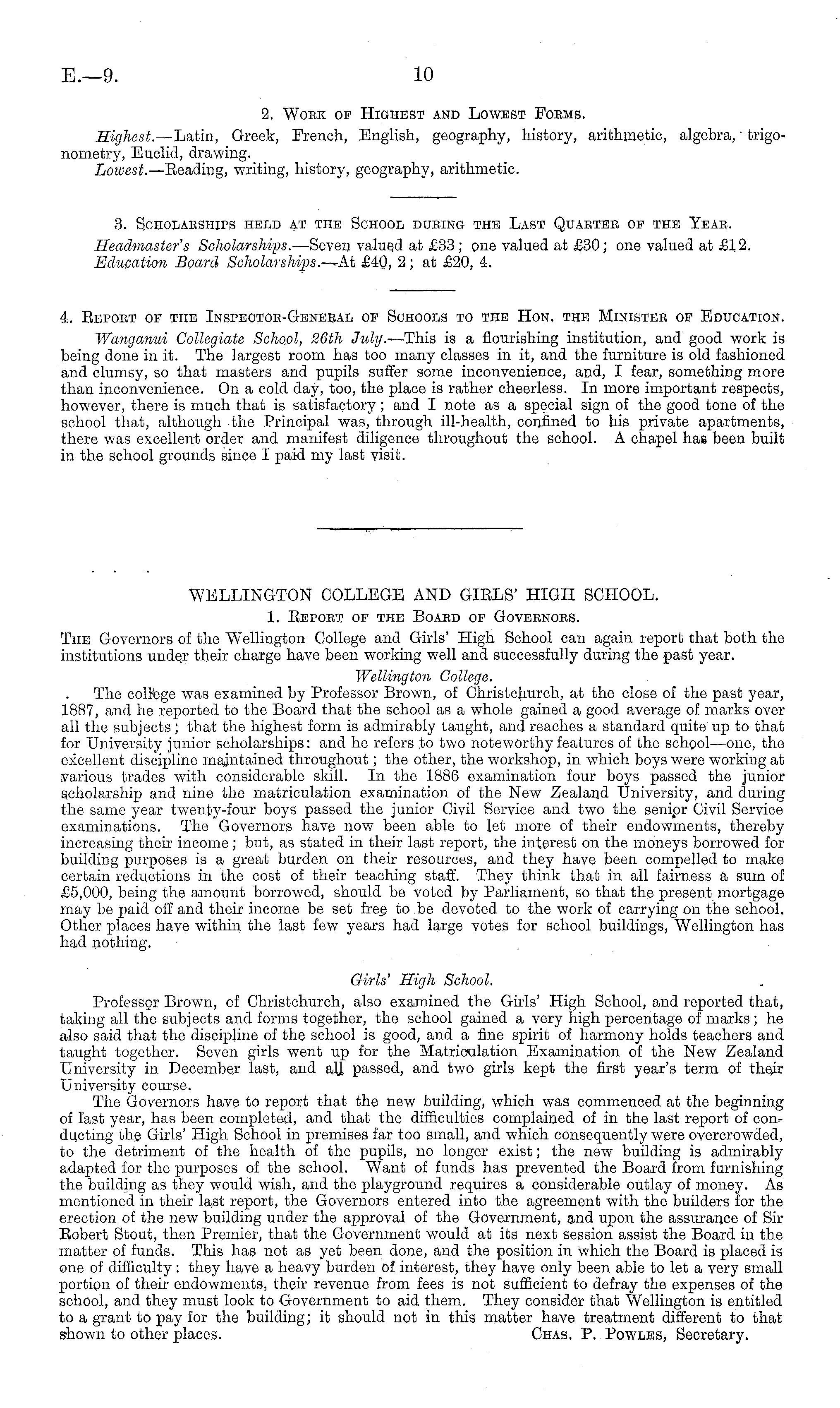 WELLINGTON COLLEGE AND GIELS' HIGH SCHOOL. 1. Bepoet op the Boaed op Governors. The Governors of the Wellington College and Girls' High School can again report that both the institutions under their charge have been working well and successfully during the past year. Wellington College. The coltege was examined by Professor Brown, of Christchurch, at the close of the past year, 1887, and he reported to the Board that the school as a whole gained a good average of marks over all the subjects; that the highest form is admirably taught, and reaches a standard quite up to that for University junior scholarships: and he refers to two noteworthy features of the school—one, the excellent discipline maintained throughout; the other, the workshop, in which boys were working at various trades with considerable skill. In the 1886 examination four boys passed the junior scholarship and nine the matriculation examination of the New Zealand University, and during the same year twenty-four boys passed the junior Civil Service and two the senipr Civil Service examinations. The Governors have now been able to let more of their endowments, thereby increasing their income; but, as stated in their last report, the interest on the moneys borrowed for building purposes is a great burden on their resources, and they have been compelled to make certain reductions in the cost of their teaching staff. They think that in all fairness a sum of £5,000, being the amount borrowed, should be voted by Parliament, so that the present mortgage may be paid off and their income be set free to be devoted to the work of carrying on the school. Other places have within the last few years had large votes for school buildings, Wellington has had nothing. Girls' High School. Professor Brown, of Christchurch, also examined the Girls' High School, and reported that, taking all the subjects and forms together, the school gained a very high percentage of marks ; he also said that the discipline of the school is good, and a fine spirit of harmony holds teachers and taught together. Seven girls went up for the Matriculation Examination of the New Zealand University in December last, and all, passed, and two girls kept the first year's term of their University course. The Governors have to report that the new building, which was commenced at the beginning of last year, has been completed, and that the difficulties complained of in the last report of conducting the Girls' High School in premises far too small, and which consequently were overcrowded, to the detriment of the health of the pupils, no longer exist; the new building is admirably adapted for the purposes of the school. Want of funds has prevented the Board from furnishing the building as they would wish, and the playground requires a considerable outlay of money. As mentioned in their la,st report, the Governors entered into the agreement with the builders for the erection of the new building under the approval of the Government, and upon the assurance of Sir Robert Stout, then Premier, that the Government would at its next session assist the Board in the matter of funds. This has not as yet been done, and the position in which the Board is placed is one of difficulty: they have a heavy burden of interest, they have only been able to let a very small portion of their endowments, their revenue from fees is not sufficient to defray the expenses of the school, and they must look to Government to aid them. They consider that Wellington is entitled to a grant to pay for the building; it should not in this matter have treatment different to that shown to other places. Chas. P. Powles, Secretary.