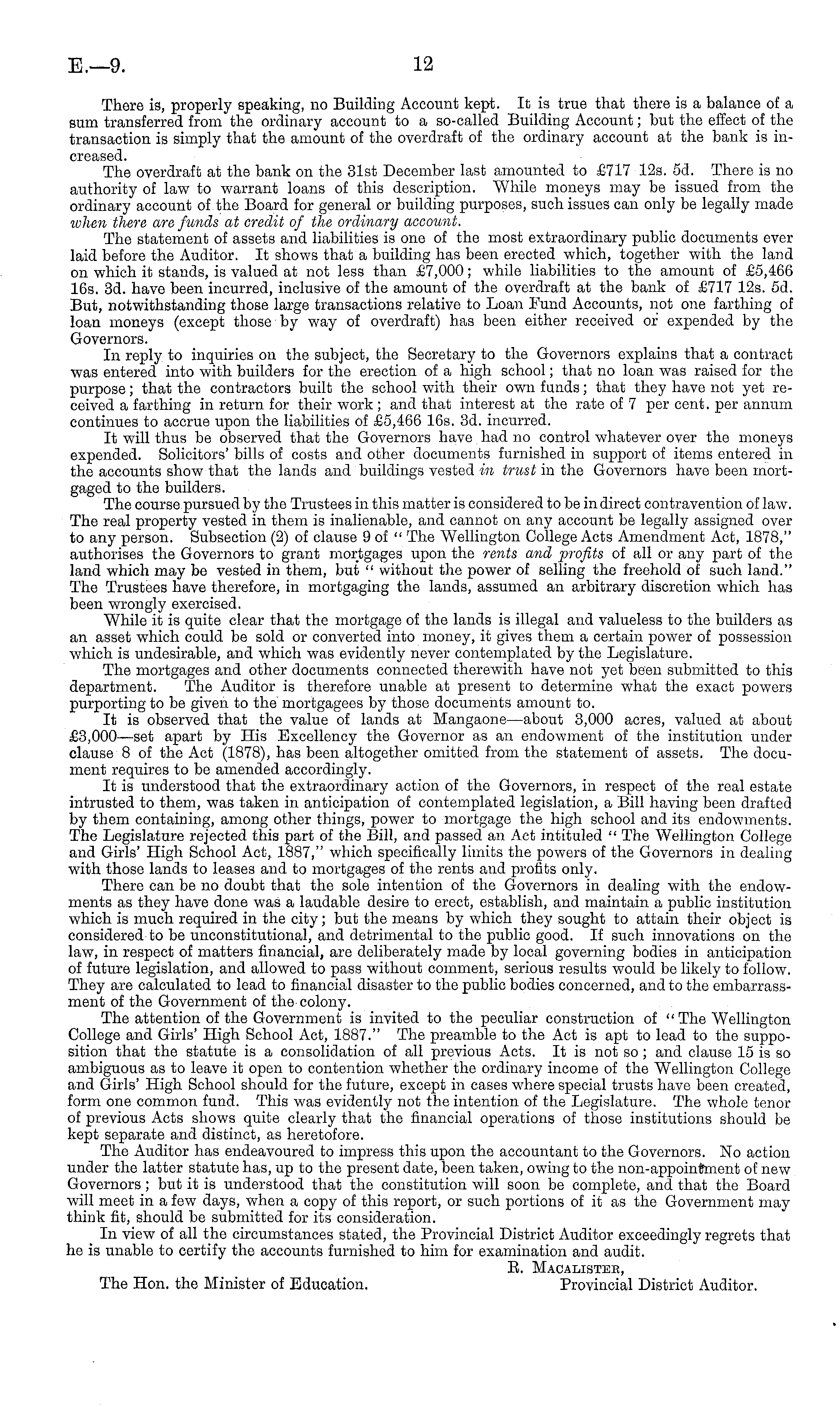 There is, properly speaking, no Building Account kept. It is true that there is a balance of a sum transferred from the ordinary account to a so-called Building Account; but the effect of the transaction is simply that the amount of the overdraft of the ordinary account at the bank is increased. The overdraft at the bank on the 31st December last amounted to £717 12s. sd. There is no authority of law to warrant loans of this description. While moneys may be issued from the ordinary account of the Board for general or building purposes, such issues can only be legally made when there are funds at credit of the ordinary account. The statement of assets and liabilities is one of the most extraordinary public documents ever laid before the Auditor. It shows that a building has been erected which, together with the land on which it stands, is valued at not less than £7,000; while liabilities to the amount of £5,466 16s. 3d. have been incurred, inclusive of the amount of the overdraft at the bank of £717 12s. sd. But, notwithstanding those large transactions relative to Loan Fund Accounts, not one farthing of loan moneys (except those by way of overdraft) has been either received or expended by the Governors. In reply to inquiries on the subject, the Secretary to the Governors explains that a contract was entered into with builders for the erection of a high school; that no loan was raised for the purpose; that the contractors built the school with their own funds; that they have not yet received a farthing in return for their work ; and that interest at the rate of 7 per cent, per annum continues to accrue upon the liabilities of £5,466 16s. 3d. incurred. It will thus be observed that the Governors have had no control whatever over the moneys expended. Solicitors' bills of costs and other documents furnished in support of items entered in the accounts show that the lands and buildings vested in trust in the Governors have been mortgaged to the builders. The course pursued by the Trustees in this matter is considered to be in direct contravention of law. The real property vested in them is inalienable, and cannot on any account be legally assigned over to any person. Subsection (2) of clause 9of " The Wellington College Acts Amendment Act, 1878," authorises the Governors to grant mortgages upon the rents and profits of all or any part of the land which may be vested in them, but " without the power of selling the freehold of such land." The Trustees have therefore, in mortgaging the lands, assumed an arbitrary discretion which has been wrongly exercised. While it is quite clear that the mortgage of the lands is illegal and valueless to the builders as an asset which could be sold or converted into money, it gives them a certain power of possession which is undesirable, and which was evidently never contemplated by the Legislature. The mortgages and other documents connected therewith have not yet been submitted to this department. The Auditor is therefore unable at present to determine what the exact powers purporting to be given to the mortgagees by those documents amount to. It is observed that the value of lands at Mangaone—about 3,000 acres, valued at about £3,000 —set apart by His Excellency the Governor as an endowment of the institution under clause 8 of the Act (1878), has been altogether omitted from the statement of assets. The document requires to be amended accordingly. It is understood that the extraordinary action of the Governors, in respect of the real estate intrusted to them, was taken in anticipation of contemplated legislation, a Bill having been drafted by them containing, among other things, power to mortgage the high school and its endowments. The Legislature rejected this part of the Bill, and passed an Act intituled " The Wellington College and Girls' High School Act, 1887," which specifically limits the powers of the Governors in dealing with those lands to leases and to mortgages of the rents and profits only. There can be no doubt that the sole intention of the Governors in dealing with the endowments as they have done was a laudable desire to erect, establish, and maintain a public institution which is much required in the city; but the means by which they sought to attain their object is considered to be unconstitutional, and detrimental to the public good. If such innovations on the law, in respect of matters financial, are deliberately made by local governing bodies in anticipation of future legislation, and allowed to pass without comment, serious results would be likely to follow. They are calculated to lead to financial disaster to the public bodies concerned, and to the embarrassment of the Government of the colony. The attention of the Government is invited to the peculiar construction of " The Wellington College and Girls' High School Act, 1887." The preamble to the Act is apt to lead to the supposition that the statute is a consolidation of all previous Acts. It is not so; and clause 15 is so ambiguous as to leave it open to contention whether the ordinary income of the Wellington College and Girls' High School should for the future, except in cases where special trusts have been created, form one common fund. This was evidently not the intention of the Legislature. The whole tenor of previous Acts shows quite clearly that the financial operations of those institutions should be kept separate and distinct, as heretofore. The Auditor has endeavoured to impress this upon the accountant to the Governors. No action under the latter statute has, up to the present date, been taken, owing to the non-appointment of new Governors; but it is understood that the constitution will soon be complete, and that the Board will meet in a few days, when a copy of this report, or such portions of it as the Government may think fit, should be submitted for its consideration. In view of all the circumstances stated, the Provincial District Auditor exceedingly regrets