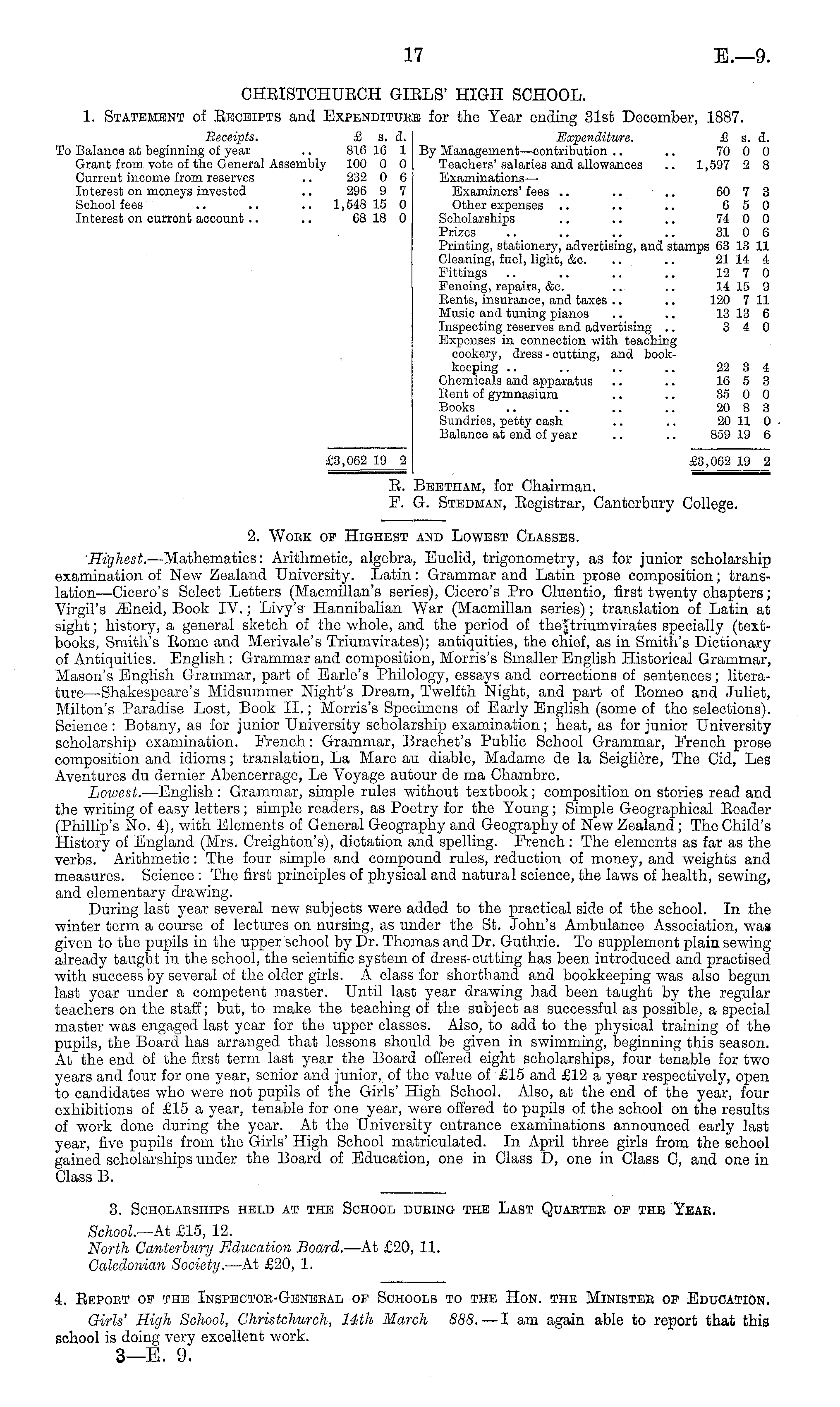 CHEISTCHUECH GIELS' HIGH SCHOOL. 1. Statement of Eeceipts and Expendituee for the Year ending 31st December, 1887. Receipts. £ s. d. Expenditure. £ s. d. To Balance at beginning of year .. 816 16 1 By Management—contribution .. .. 70 0 0 Grant from vote of the General Assembly 100 0 0 Teachers'salaries and allowances .. 1,597 2 8 Current income from reserves .. 232 0 6 Examinations —■ Interest on moneys invested .. 296 9 7 Examiners' fees .. .. .. 60 7 3 School fees .. .. .. 1,548 15 0 Other expenses .. .. .. 6 5 0 Interest on current account .. .. 68 18 0 Scholarships .. .. .. 74 0 0 Prizes .. .. .. .. 31 0 6 Printing, stationery, advertising, and stamps 63 13 11 Gleaning, fuel, light, &o. .. .. 21 14 4 Fittings .. .. .. .. 12 7 0 Fencing, repairs, &c. .. .. 14 15 9 Eents, insurance, and taxes .. .. 120 7 11 Music and tuning pianos .. .. 13 13 6 Inspecting reserves and advertising .. 3 4 0 Expenses in connection with teaching cookery, dress - cutting, and bookkeeping .. .. .. .. 22 3 4 Chemicals and apparatus .. .. 16 5 3 Rent of gymnasium .. .. 35 0 0 Books .. .. .. .. 20 8 3 Sundries, petty cash .. .. 20 11 0 Balance at end of year .. .. 859 19 6 £3,062 19 2 £3,062 19 2 E. Beetham, for Chairman. F. G. Stedman, Eegistrar, Canterbury College.