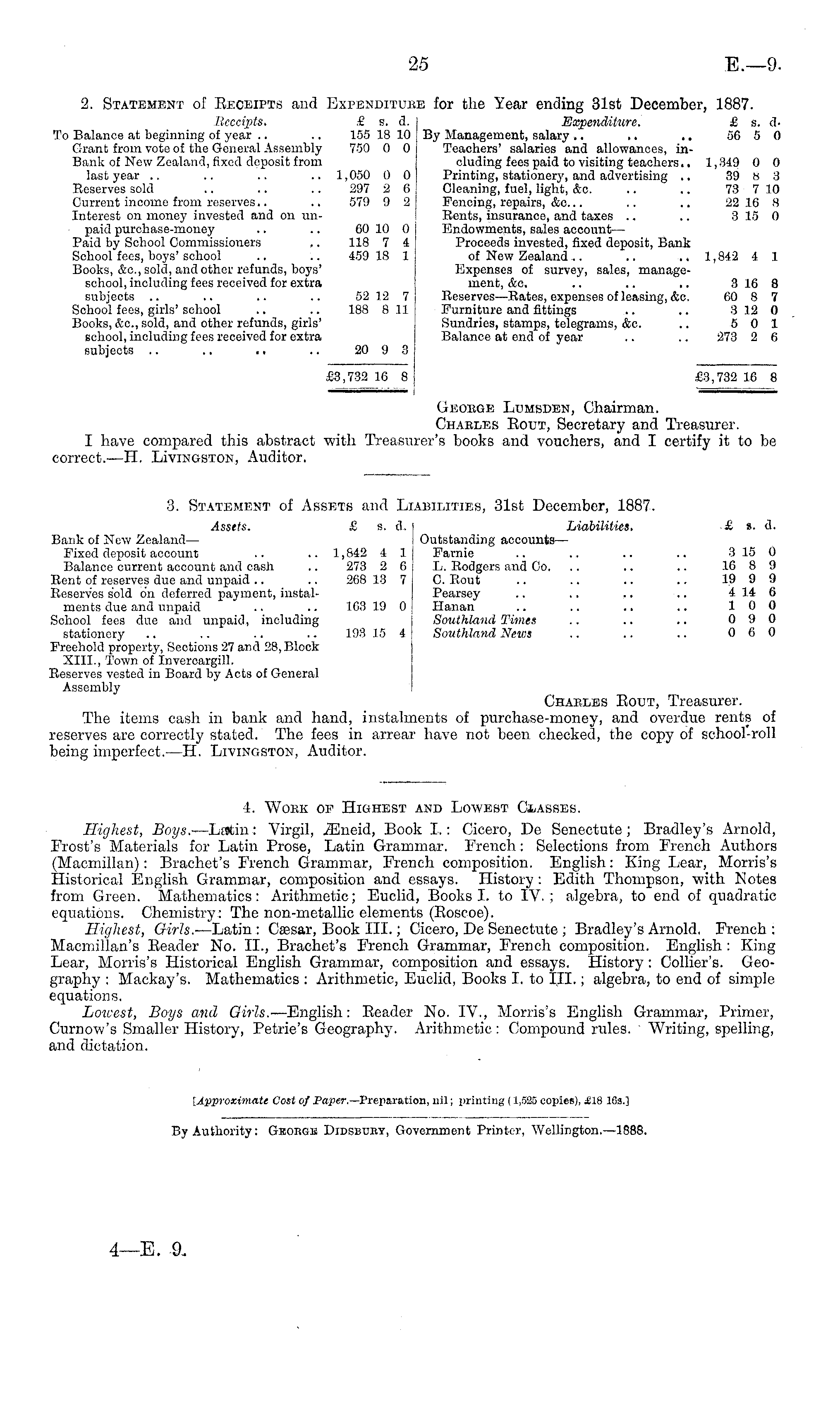 2. Statement of Eeceipts and Expenditure for the Year ending 31st December, 1887. Receipts. £ s. d. Expenditure. £ s. dTo Balance at beginning of year .. .. 155 18 10 By Management, salary .. .. .. 56 5 0 Grant from vote of the General Assembly 750 0 0 Teachers' salaries and allowances, inBank of New Zealand, fixed deposit from eluding fees paid to visiting teachers.. 1,349 0 0 last year .. .. .. .. 1,050 0 0 Printing, stationer}', and advertising .. 39 8 3 Reserves sold .. .. .. 297 2 6 Gleaning, fuel, light, &c. .. .. 73 710 Current income from reserves.. .. 579 9 2 Fencing, repairs, &0... .. .. '22 16 8 Interest on money invested and on un- Rents, insurance, and taxes .. .. 3 15 0 paid purchase-money .. .. 60 10 0 Endowments, sales account— Paid by School Commissioners ~ 118 7 4 Proceeds invested, fixed deposit, Bank School fees, boys'school .. .. 459 18 1 of New Zealand .. .. .. 3,842 4 1 Books, &c, sold, and other refunds, boys' Expenses of survey, sales, managesehool, including fees received for extra ment, &c, .. .. .. 3 16 8 subjects .. .. .. .. 52 12 V I Reserves—Rates, expenses of leasing, &c. 60 8 7 School fees, girls'school .. .. 188 811 j Furniture and fittings .. .. 312 0 Books, &c, sold, and other refunds, girls' Sundries, stamps, telegrams, &c. 5 0 1 school, including fees received for extra Balance at end of year .. .. 273 2 6 subjects .. .. ~ .. 20 9 3 £3,732 16 8 £3,732 16 8 _ ( Geoege Lumsden, Chairman. Chaeles Eout, Secretary and Treasurer. I have compared this abstract with Treasurer's books and vouchers, and I certify it to be correct.—H. Livingston, Auditor.