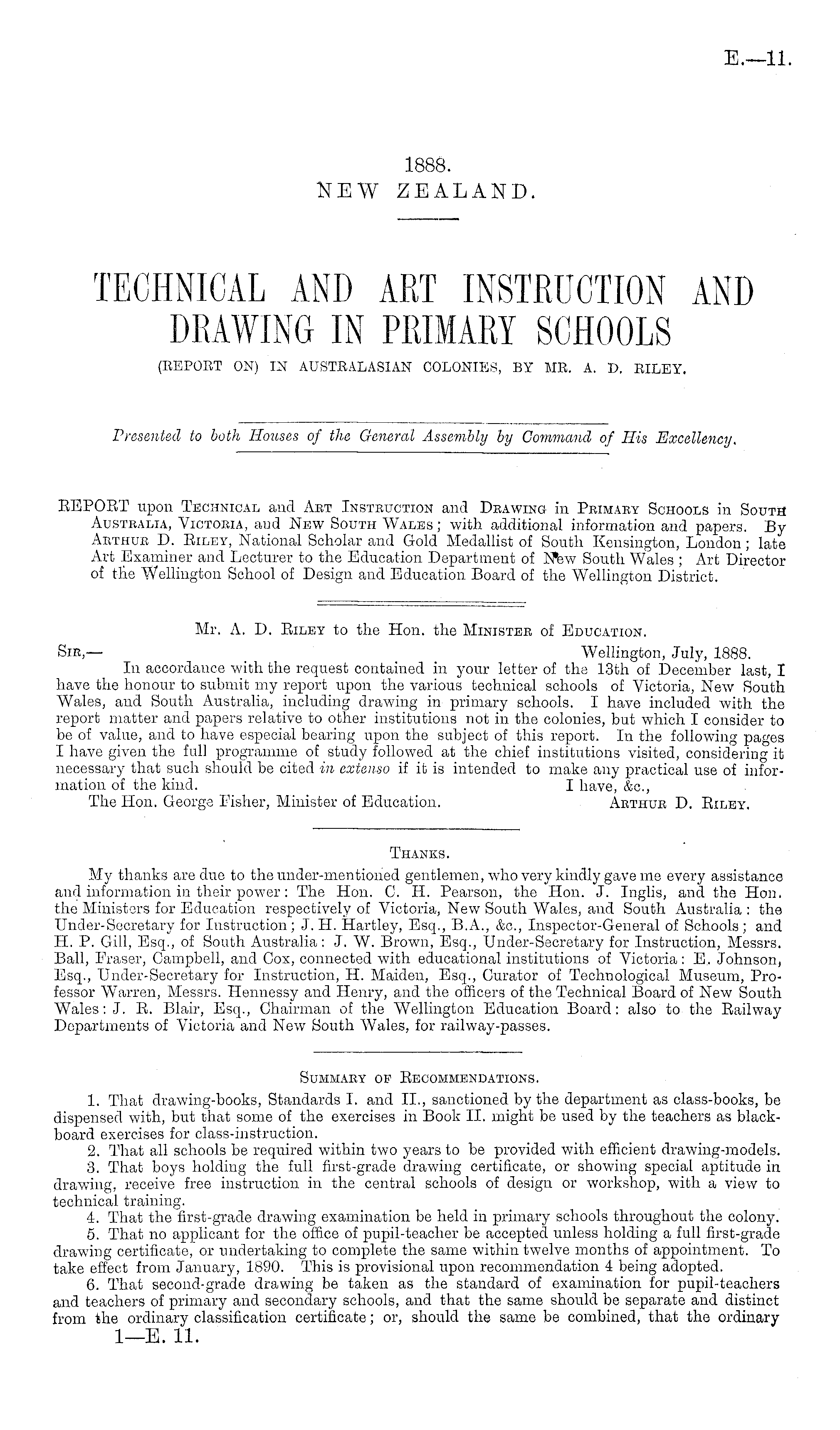 REPORT upon Technical and Art Instruction and Drawing in Primary Schools in South Australia, Victoria, and New South Wales ; with additional information and papers. By Arthur D. Riley, National Scholar and Gold Medallist of South Kensington, London; late Art Examiner and Lecturer to the Education Department of IStew South Wales ; Art Director of the Wellington School of Design and Education Board of the Wellington District.