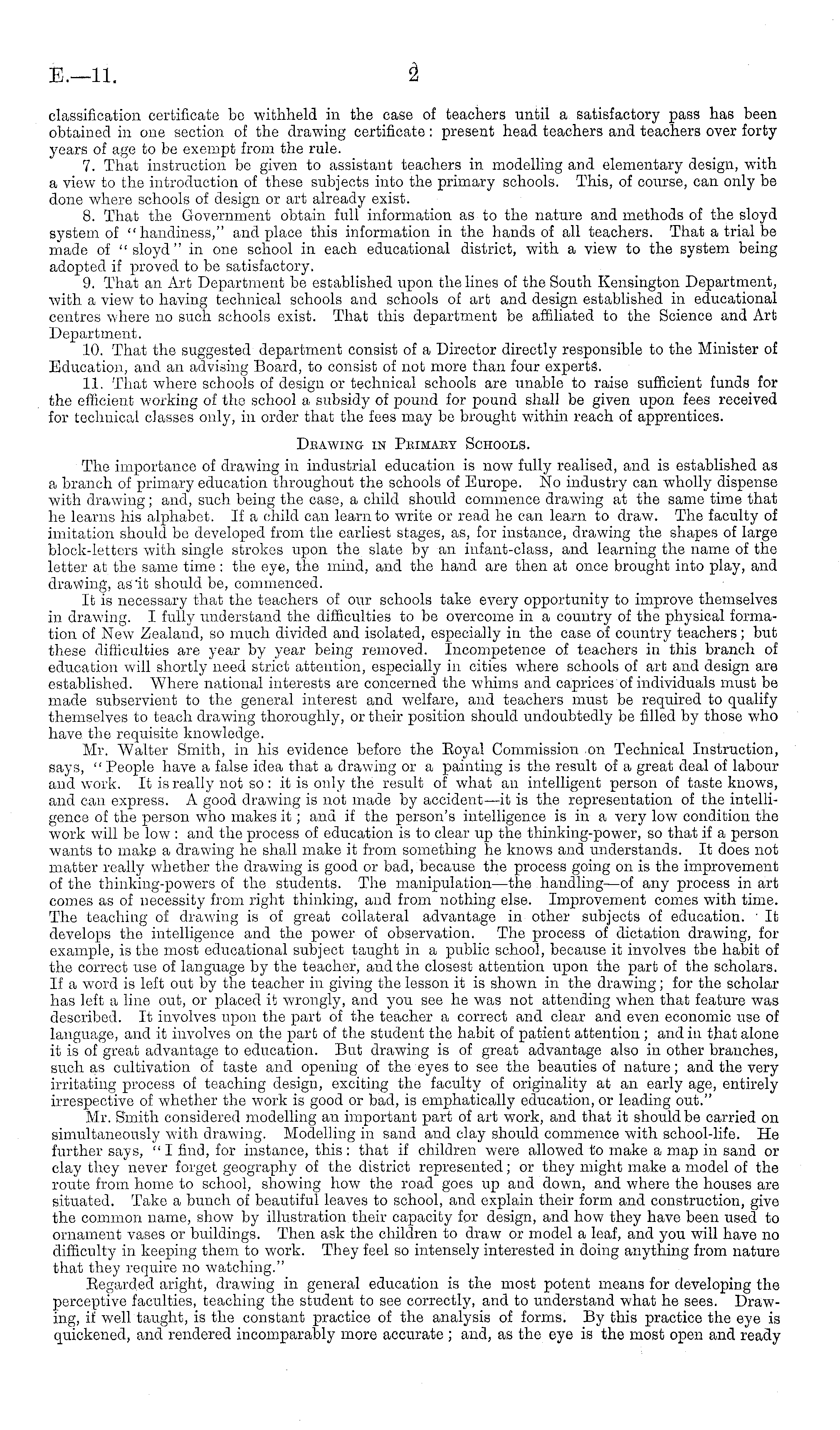 classification certificate bo withheld in the case of teachers until a satisfactory pass has been obtained in one section of the drawing certificate: present head teachers and teachers over forty years of age to be exempt from the rule. 7. That instruction be given to assistant teachers in modelling and elementary design, with a view to the introduction of these subjects into the primary schools. This, of course, can only be done where schools of design or art already exist. 8. That the Government obtain full information as to the nature and methods of the sloyd system of "handiness," and place this information in the hands of all teachers. That a trial be made of "sloyd" in one school in each educational district, with a view to the system being adopted if proved to be satisfactory. 9. That an Art Department be established upon the lines of the South Kensington Department, with a view to having technical schools and schools of art and design established in educational centres where no such schools exist. That this department be affiliated to the Science and Art Department. 10. That the suggested department consist of a Director directly responsible to the Minister of Education, and an advising Board, to consist of not more than four experts. 11. That where schools of design or technical schools are unable to raise sufficient funds for the efficient working of the school a subsidy of pound for pound shall be given upon fees received for technical classes only, in order that the fees may be brought within reach of apprentices. Deawing in Pbimary Schools. The importance of drawing in industrial education is now fully realised, and is established as a branch of primary education throughout the schools of Europe. No industry can wholly dispense with drawing; and, such being the case, a child should commence drawing at the same time that he learns his alphabet. If a child can learn to write or read he can learn to draw. The faculty of imitation should be developed from the earliest stages, as, for instance, drawing the shapes of large block-letters with single strokes upon the slate by an infant-class, and learning the name of the letter at the same time: the eye, the mind, and the hand are then at once brought into play, and drawing, as it should be, commenced. It is necessary that the teachers of our schools take every opportunity to improve themselves in drawing. I fully understand the difficulties to be overcome in a country of the physical formation of New Zealand, so much divided and isolated, especially in the case of country teachers; but these difficulties are year by year being removed. Incompetence of teachers in this branch of education will shortly need strict attention, especially in cities where schools of art and design are established. Where national interests are concerned the whims and caprices of individuals must be made subservient to the general interest and welfare, and teachers must bo required to qualify themselves to teach drawing thoroughly, or their position should undoubtedly be filled by those who have the requisite knowledge. Mr. Walter Smith, in his evidence before the Royal Commission on Technical Instruction, says, " People have a false idea that a drawing or a painting is the result of a great deal of labour and work. It is really not so :it is only the result of what an intelligent person of taste knows, and can express. A good drawing is not made by accident—it is the representation of the intelligence of the person who makes it; and if the person's intelligence is in a very low condition the work will be low : and the process of education is to clear up the thinking-power, so that if a person wants to make a drawing he shall make it from something he knows and understands. It does not matter really whether the drawing is good or bad, because the process going on is the improvement of the thinking-powers of the students. The manipulation—the handling—of any process in art comes as of necessity from right thinking, and from nothing else. Improvement comes with time. The teaching of drawing is of great collateral advantage in other subjects of education. It develops the intelligence and the power of observation. The process of dictation drawing, for example, is the most educational subject taught in a public school, because it involves the habit of the correct use of language by the teacher, and the closest attention upon the part of the scholars. If a word is left out by the teacher in giving the lesson it is shown in the drawing; for the scholar has left a line out, or placed it wrongly, and you see he was not attending when that feature was described. It involves upon the part of the teacher a correct and clear and even economic use of language, and it involves on the part of the student the habit of patient attention ; and in that alone it is of great advantage to education. But drawing is of great advantage also in other branches, such as cultivation of taste and opening of the eyes to see the beauties of nature; and the very irritating process of teaching design, exciting the faculty of originality at an early age, entirely irrespective of whether the work is good or bad, is emphatically education, or leading out." Mr. Smith considered modelling an important part of art work, and that it should be carried on simultaneously with drawing. Modelling in sand and clay should commence with school-life. He further says, "I find, for instance, this: that if children were allowed to make a map in sand or clay they never forget geography of the district represented; or they might make a model of the route from home to school, showing how the road goes up and down, and where the houses are situated. Take a bunch of beautiful leaves to school, and explain their form and construction, give the common name, show by illustration their capacity for design, and how they have been used to ornament vases or buildings. Then ask the children to draw or model a leaf, 