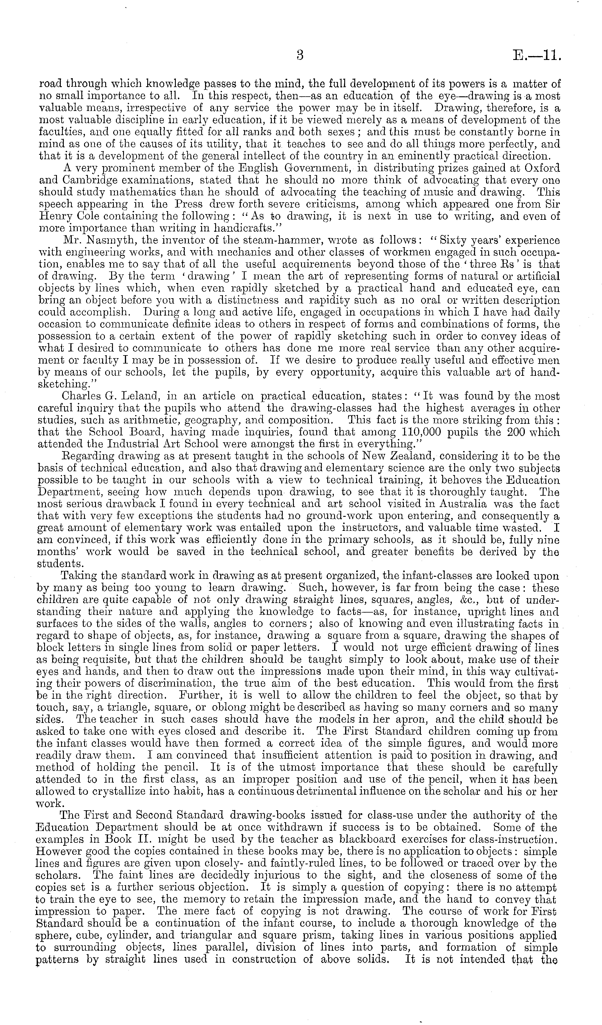 road through which knowledge passes to the mind, the full development of its powers is a matter of no small importance to all. In this respect, then —as an education of the eye—drawing is a most valuable means, irrespective of any service the power may be in itself. Drawing, therefore, is a most valuable discipline in early education, if it be viewed merely as a means of development of the faculties, and one equally fitted for all ranks and both sexes ; and this must be constantly borne in mind as one of the causes of its utility, that it teaches to see and do all things more perfectly, and that it is a development of the general intellect of the country in an eminently practical direction. A very prominent member of the English Government, in distributing prizes gained at Oxford and Cambridge examinations, stated that he should no more think of advocating that every one should study mathematics than he should of advocating the teaching of music and drawing. This speech appearing in the Press drew forth severe criticisms, among which appeared one from Sir Henry Cole containing the following : "As to drawing, it is next in use to writing, and even of more importance than writing in handicrafts." Mr. Nasmyth, the inventor of the steam-hammer, wrote as follows : " Sixty years' experience with engineering works, and with mechanics and other classes of workmen engaged in such occupation, enables me to say that of all the useful acquirements beyond those of the ' three Rs 'is that of drawing. By the term ' drawing ' I mean the art of representing forms of natural or artificial objects by lines which, when even rapidly sketched by a practical hand and educated eye, can bring an object before you with a distinctness and rapidity such as no oral or written description could accomplish. During a long and active life, engaged in occupations in which I have had daily occasion to communicate definite ideas to others in respect of forms and combinations of forms, the possession to a certain extent of the power of rapidly sketching such in order to convey ideas of what I desired to communicate to others has done me more real service than any other acquirement or faculty I may be in possession of. If we desire to produce really useful and effective men by means of our schools, let the pupils, by every opportunity, acquire this valuable art of handsketching." Charles G. Leland, in an article on practical education, states: "It was found by the most careful inquiry that the pupils who attend the drawing-classes had the highest averages in other studies, such as arithmetic, geography, and composition. This fact is the more striking from this : that the School Board, having made inquiries, found that among 110,000 pupils the 200 which attended the Industrial Art School were amongst the first in everything." Regarding drawing as at present taught in the schools of New Zealand, considering it to be the basis of technical education, and also that drawing and elementary science are the only two subjects possible to be taught in our schools with a view to technical training, it behoves the Education Department, seeing how much depends upon drawing, to see that it is thoroughly taught. The most serious drawback I found in every technical and art school visited in Australia was the fact that with very few exceptions the students had no ground-work upon entering, and consequently a great amount of elementary work was entailed upon the instructors, and valuable time wasted. I am convinced, if this work was efficiently done in the primary schools, as it should be, fully nine months' work would be saved in the technical school, and greater benefits be derived by the students. Taking the standard work in drawing as at present organized, the infant-classes are looked upon by many as being too young to learn drawing. Such, however, is far from being the case: these children are quite capable of not only drawing straight lines, squares, angles, &c, but of understanding their nature and applying the knowledge to facts—as, for instance, upright lines and surfaces to the sides of the walls, angles to corners; also of knowing and even illustrating facts in regard to shape of objects, as, for instance, drawing a square from a square, drawing the shapes of block letters in single lines from solid or paper letters. I would not urge efficient drawing of lines as being requisite, but that the children should be taught simply to look about, make use of their eyes and hands, and then to draw out the impressions made upon their mind, in this way cultivating their powers of discrimination, the true aim of the best education. This would from the first be in the right direction. Further, it is well to allow the children to feel the object, so that by touch, say, a triangle, square, or oblong might be described as having so many corners and so many sides. The teacher in such cases should have the models in her apron, and the child should be asked to take one with eyes closed and describe it. The Eirst Standard children coming up from the infant classes would have then formed a correct idea of the simple figures, and would more readily draw them. lam convinced that insufficient attention is paid to position in drawing, and method of holding the pencil. It is of the utmost importance that these should be carefully attended to in the first class, as an improper position and use of the pencil, when it has been allowed to crystallize into habit, has a continuous detrimental influence on the scholar and his or her work. The Eirst and Second Standard drawing-books issued for class-use under the authority of the Education Department should be at once withdrawn if success is to be obtained. Some of the examples in Book 11. might be used by the teacher as blackboard exercises for class-instruction. However good the copies contained in these books may be, there is no application to objects : simple lines and figures are given upon closely- an