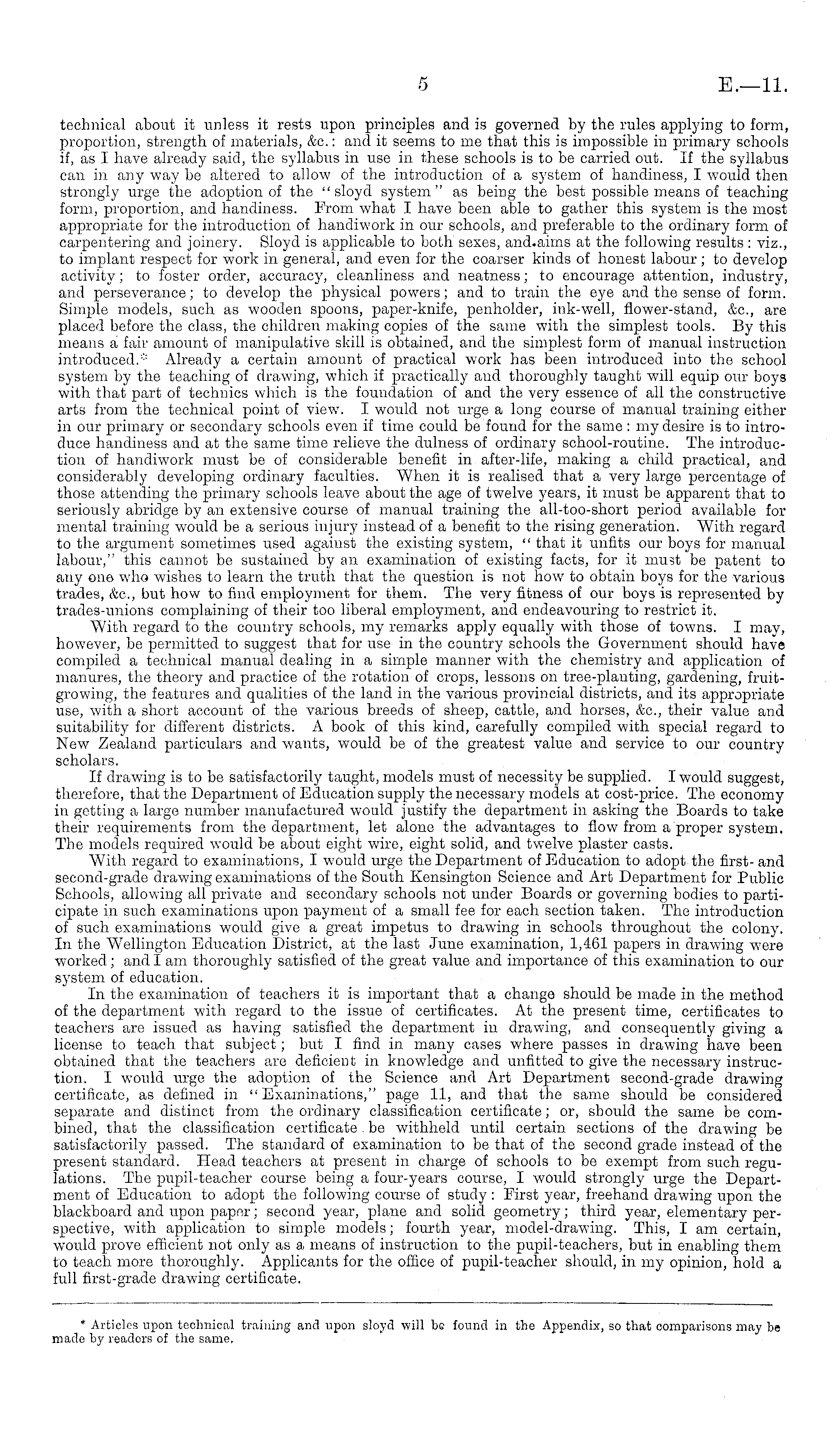 technical about it unless it rests upon principles and is governed by the rules applying to form, proportion, strength of materials, &c.: and it seems to me that this is impossible in primary schools if, as I have already said, the syllabus in use in these schools is to be carried out. If the syllabus can in any way be altered to allow of the introduction of a system of handiness, I would then strongly urge the adoption of the " sloyd system" as being the best possible means of teaching form, proportion, and handiness. From what I have been able to gather this system is the most appropriate for the introduction of handiwork in our schools, and preferable to the ordinary form of carpentering and joinery. Sloyd is applicable to both sexes, and.aims at the following results : viz., to implant respect for work in general, and even for the coarser kinds of honest labour; to develop activity; to foster order, accuracy, cleanliness and neatness; to encourage attention, industry, and perseverance; to develop the physical powers; and to train the eye and the sense of form. Simple models, such as wooden spoons, paper-knife, penholder, ink-well, flower-stand, &c, are placed before the class, the children making copies of the same with the simplest tools. By this means a fair amount of manipulative skill is obtained, and the simplest form of manual instruction introduced." Already a certain amount of practical work has been introduced into the school system by the teaching of drawing, which if practically and thoroughly taught will equip our boys with that part of technics which is the foundation of and the very essence of all the constructive arts from the technical point of view. I would not urge a long course of manual training either in our primary or secondary schools even if time could be found for the same : my desire is to introduce handiness and at the same time relieve the dulness of ordinary school-routine. The introduction of handiwork must be of considerable benefit in after-life, making a child practical, and considerably developing ordinary faculties. When it is realised that a very large percentage of those attending the primary schools leave about the age of twelve years, it must be apparent that to seriously abridge by an extensive course of manual training the all-too-short period available for mental training would be a serious injury instead of a benefit to the rising generation. With regard to the argument sometimes used against the existing system, " that it unfits our boys for manual labour," this cannot be sustained by an examination of existing facts, for it must be patent to any one who wishes to learn the truth that the question is not how to obtain boys for the various trades, &c, but how to find employment for them. The very fitness of our boys is represented by trades-unions complaining of their too liberal employment, and endeavouring to restrict it. With regard to the country schools, my remarks apply equally with those of towns. I may, however, be permitted to suggest that for use in the country schools the Government should have compiled a technical manual dealing in a simple manner with the chemistry and application of manures, the theory and practice of the rotation of crops, lessons on tree-planting, gardening, fruitgrowing, the features and qualities of the land in the various provincial districts, and its appropriate use, with a short account of the various breeds of sheep, cattle, and horses, &c, their value and suitability for different districts. A book of this kind, carefully compiled with special regard to New Zealand particulars and wants, would be of the greatest value and service to our country scholars. If drawing is to be satisfactorily taught, models must of necessity be supplied. I would suggest, therefore, that the Department of Education supply the necessary models at cost-price. The economy in getting a large number manufactured would justify the department in asking the Boards to take their requirements from the department, let alone the advantages to flow from a proper system. The models required would be about eight wire, eight solid, and twelve plaster casts. With regard to examinations, I would urge the Department of Education to adopt the first- and second-grade drawing examinations of the South Kensington Science and Art Department for Public Schools, allowing all private and secondary schools not under Boards or governing bodies to participate in such examinations upon payment of a small fee for each section taken. The introduction of such examinations would give a great impetus to drawing in schools throughout the colony. In the Wellington Education District, at the last June examination, 1,461 papers in drawing were worked; and lam thoroughly satisfied of the great value and importance of this examination to our system of education. In the examination of teachers it is important that a change should be made in the method of the department with regard to the issue of certificates. At the present time, certificates to teachers are issued as having satisfied the department in drawing, and consequently giving a license to teach that subject; but I find in many cases where passes in drawing have been obtained that the teachers are deficient in knowdedge and unfitted to give the necessary instruction. I would urge the adoption of the Science and Art Department second-grade drawing certificate, as defined in "Examinations," page 11, and that the same should be considered separate and distinct from the ordinary classification certificate; or, should the same be combined, that the classification certificate be withheld until certain sections of the drawing be satisfactorily passed. The standard of examination to be that of the second grade instead of the present standard. Head teachers at present in charge of schools to be exempt from such regulations. The pupil-teacher course being a four-years course, I would strongly urge the Department of E